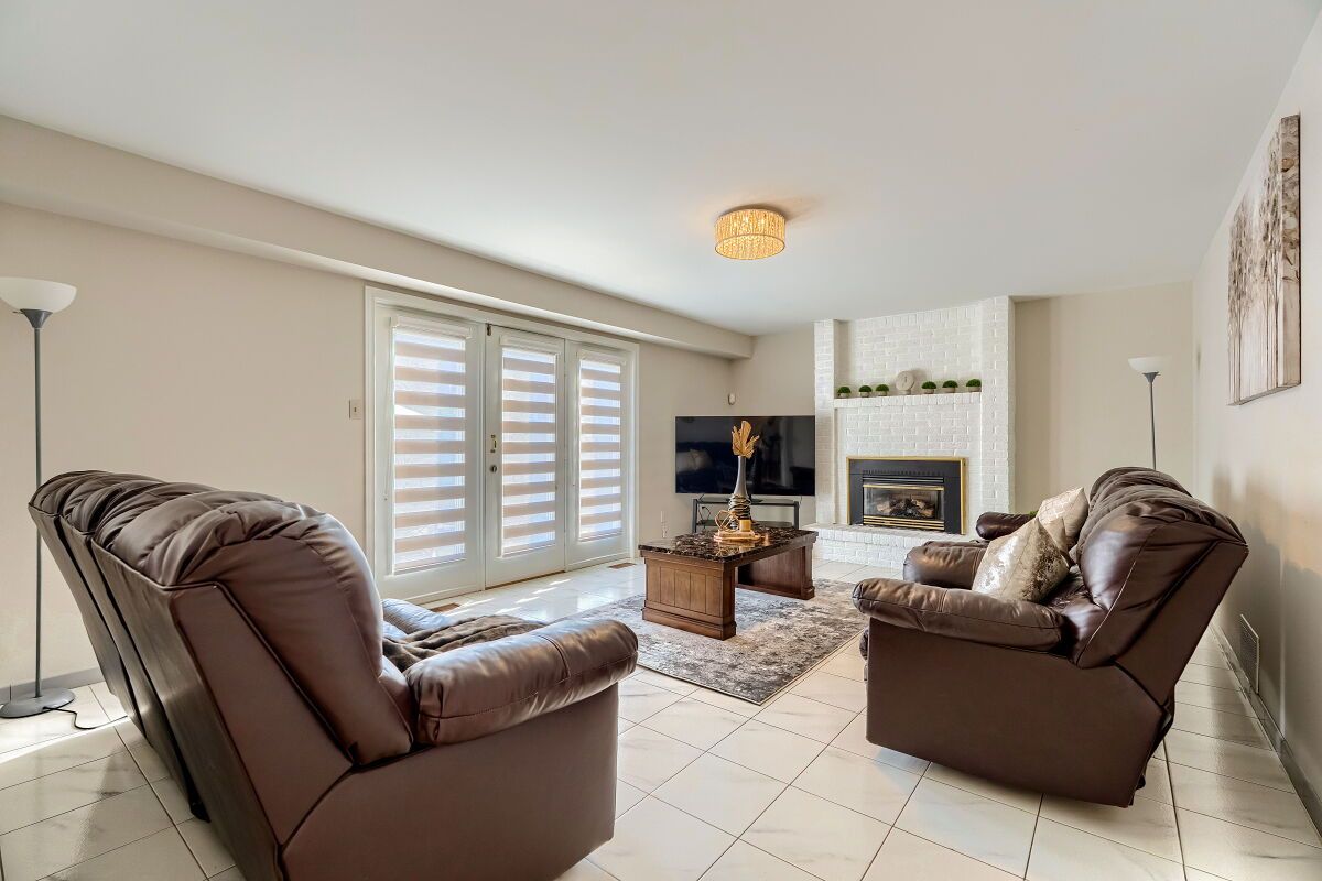 • Bright, open-concept living area with a cozy gas fireplace.