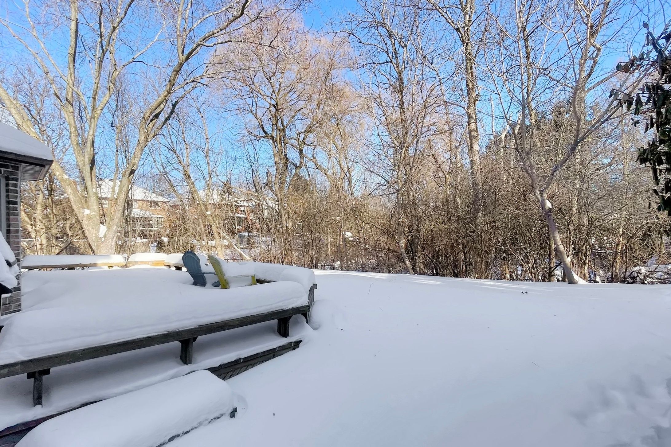• Oversized deck overlooking green forest, perfect for outdoor gatherings.