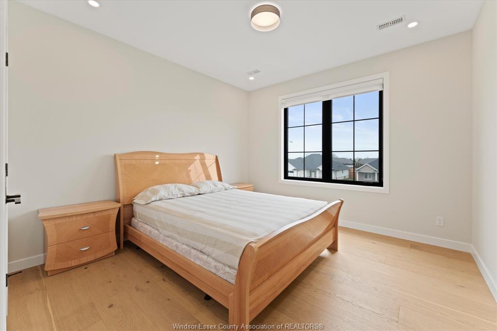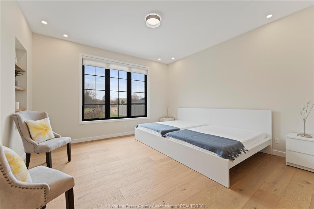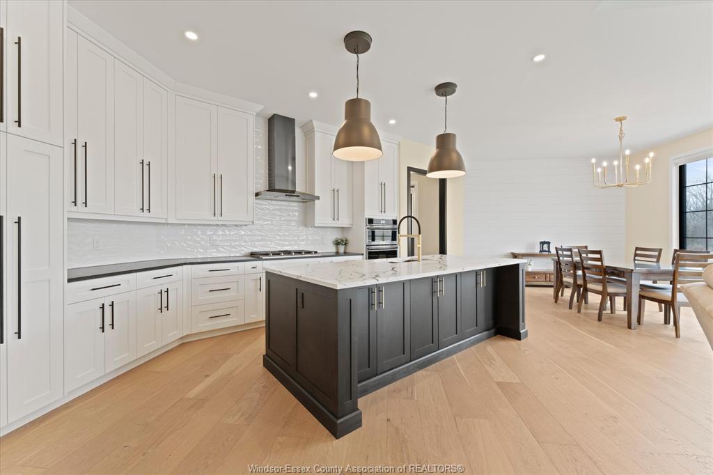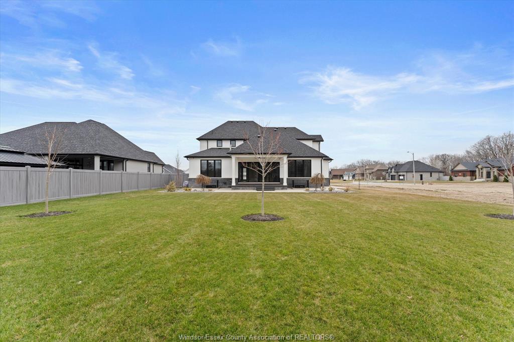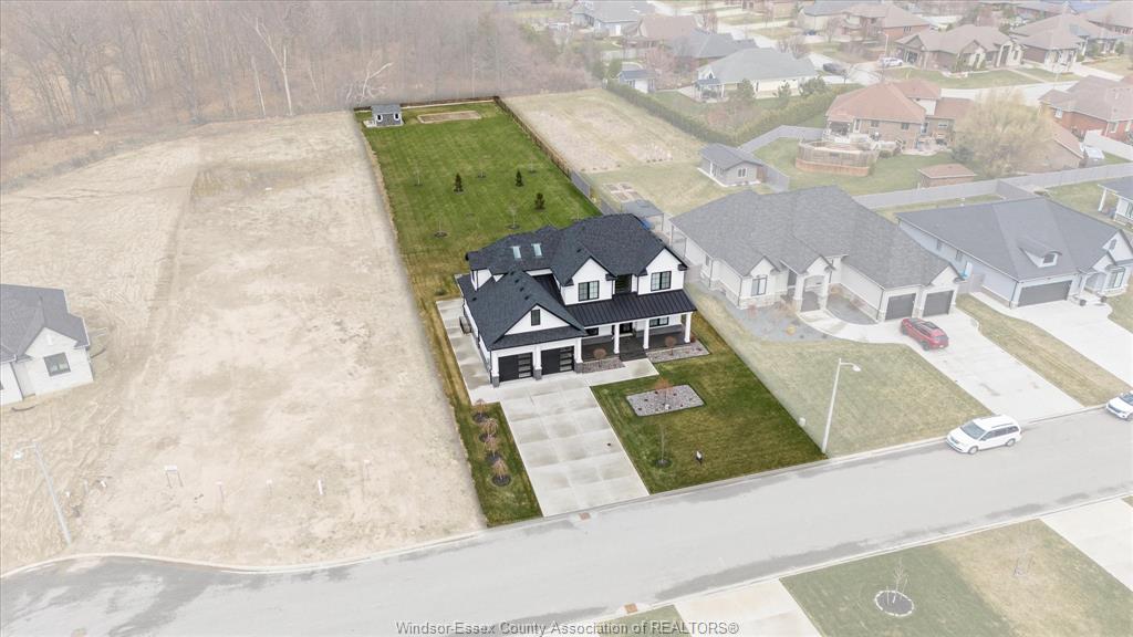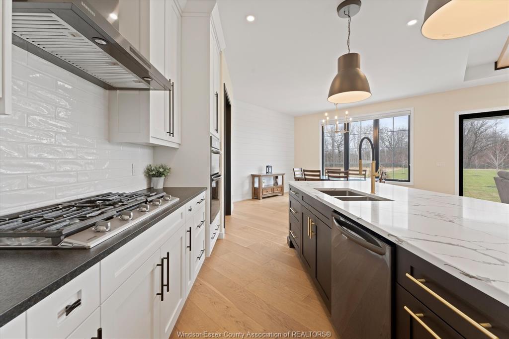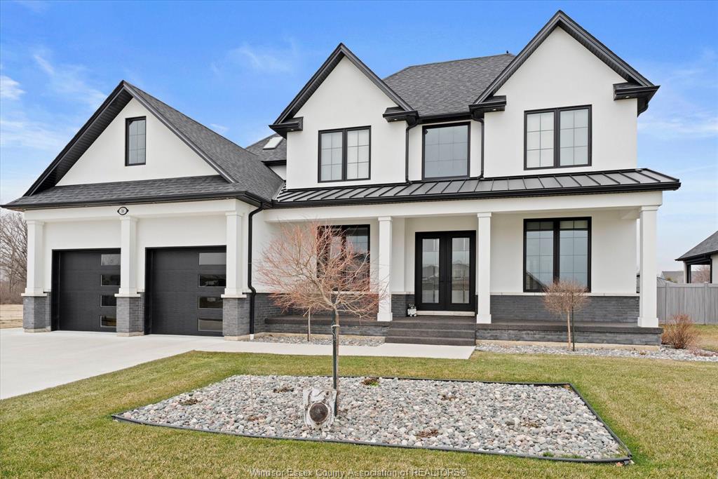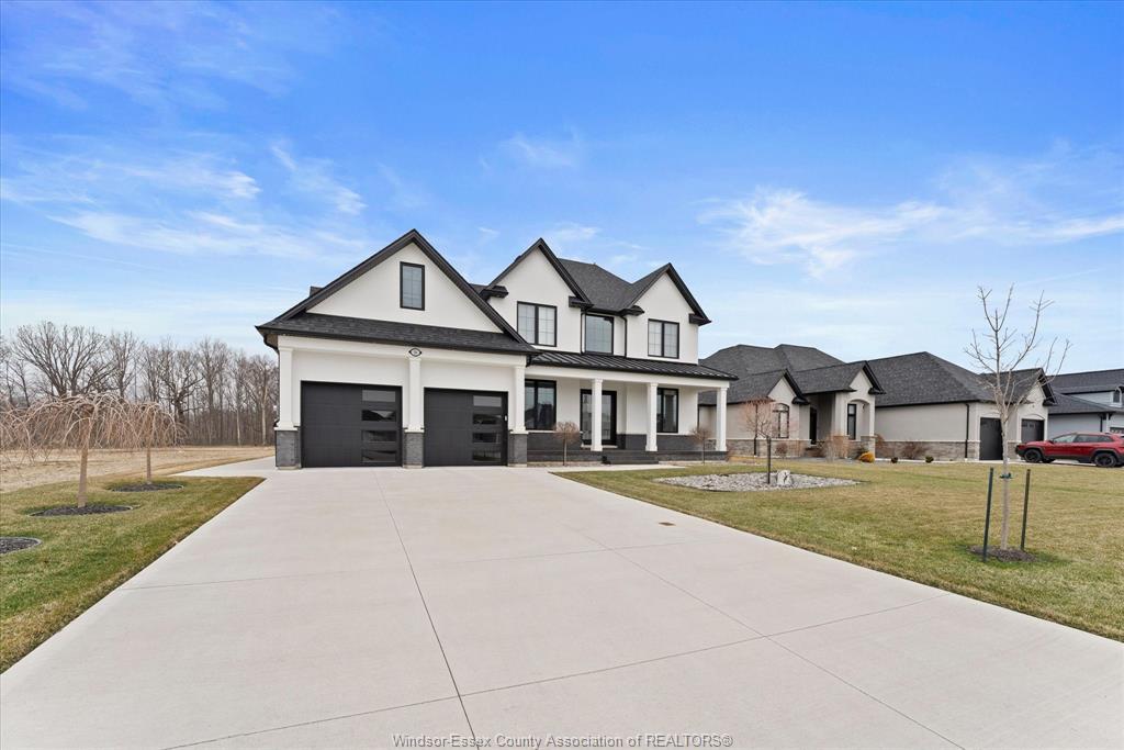 Stunning custom-built two-storey home (2022) set on an exceptional 80 x 350 ft lot backing onto a conservation area, offering rare privacy and picturesque natural views. Boasting over 3,200 sq ft plus a fully finished basement, this home is filled with natural light, highlighted by expansive windows and soaring 12 ft ceilings on the main floor. Thoughtfully designed with elegant, modern finishes throughout, the main level features a luxurious primary suite with a spa-inspired ensuite and heated floors, and a private office with full glass doors. The beautifully appointed chef’s kitchen showcases a large angled center island with quartz countertops and integrated sink, ceiling-height custom cabinetry, stylish backsplash, and high-end stainless steel appliances including a built-in oven and gas cooktop. The open-concept layout flows seamlessly into the dining and living areas, where you’ll find custom ceiling details, built-in shelving, and a gas fireplace, along with an extra-wide patio door leading to a covered porch overlooking the serene natural setting. Upstairs offers three spacious bedrooms, including a junior ensuite, along with skylights that enhance the bright and airy ambiance. The fully finished basement provides exceptional versatility with a summer kitchen, two additional bedrooms, a family room, and a grade-level entrance. Additional highlights include hardwood flooring throughout, a landscaped yard, two-zone heating and cooling, a double car garage, and an extra-wide driveway. Ideally located in one of kingsville’s most desirable areas, just steps from the kingsville golf club and minutes to downtown, the lake erie waterfront, parks, and local wineries. An exceptional opportunity to enjoy refined living in a setting that perfectly balances tranquility and convenience.