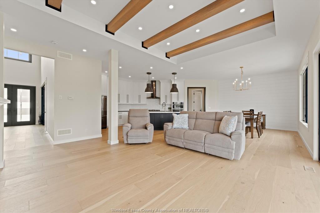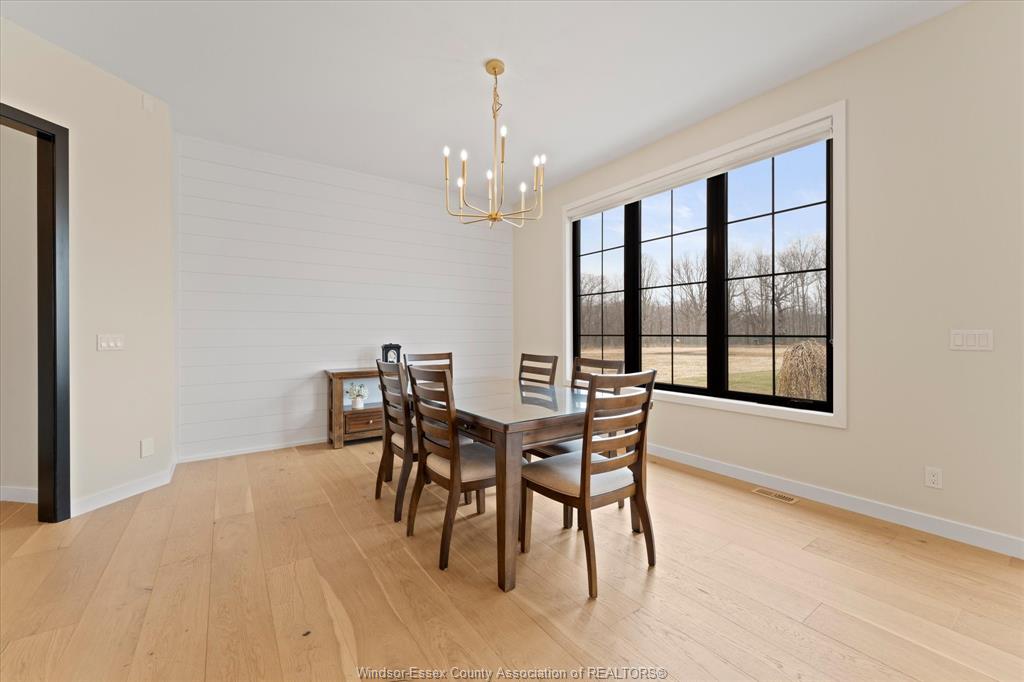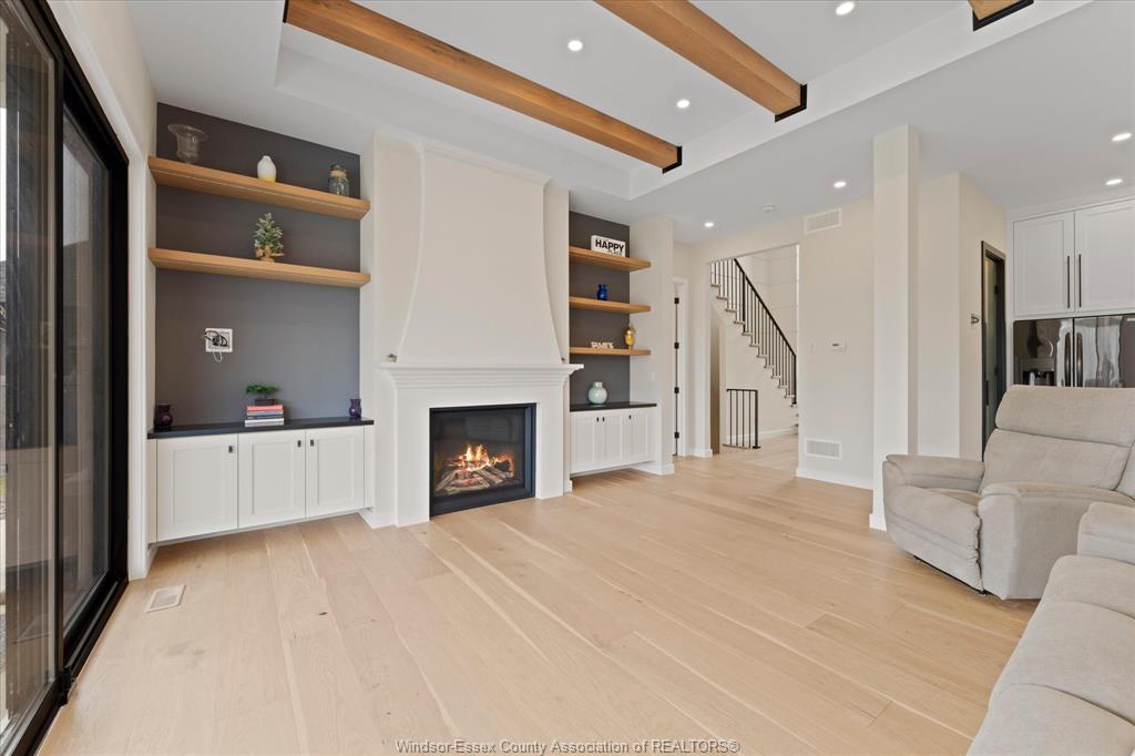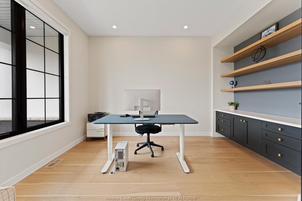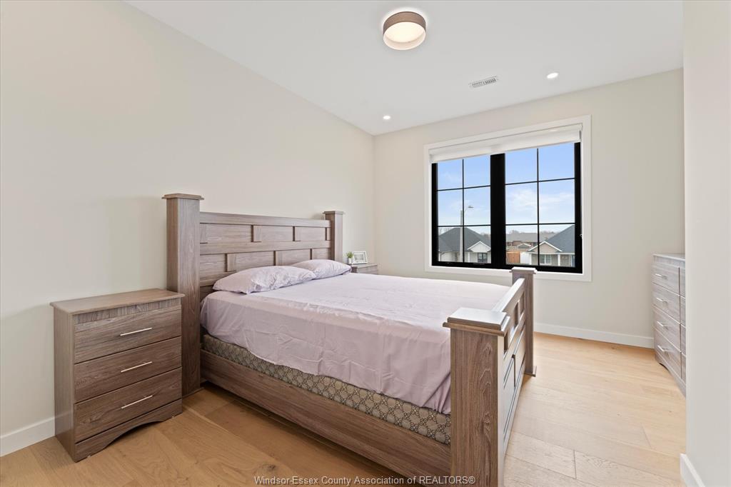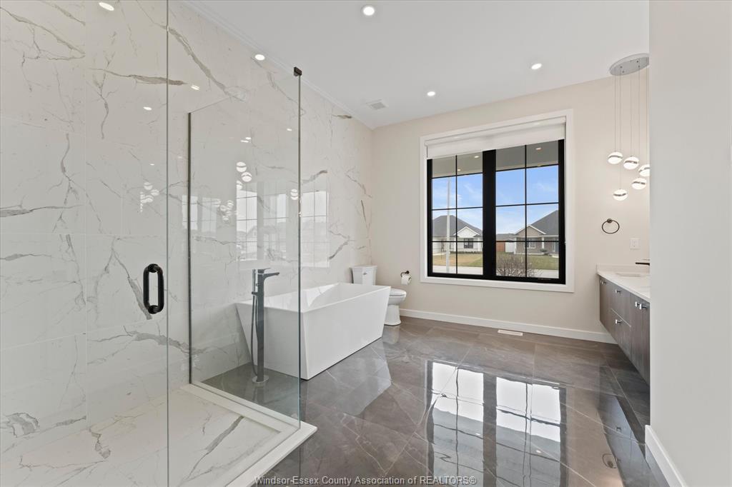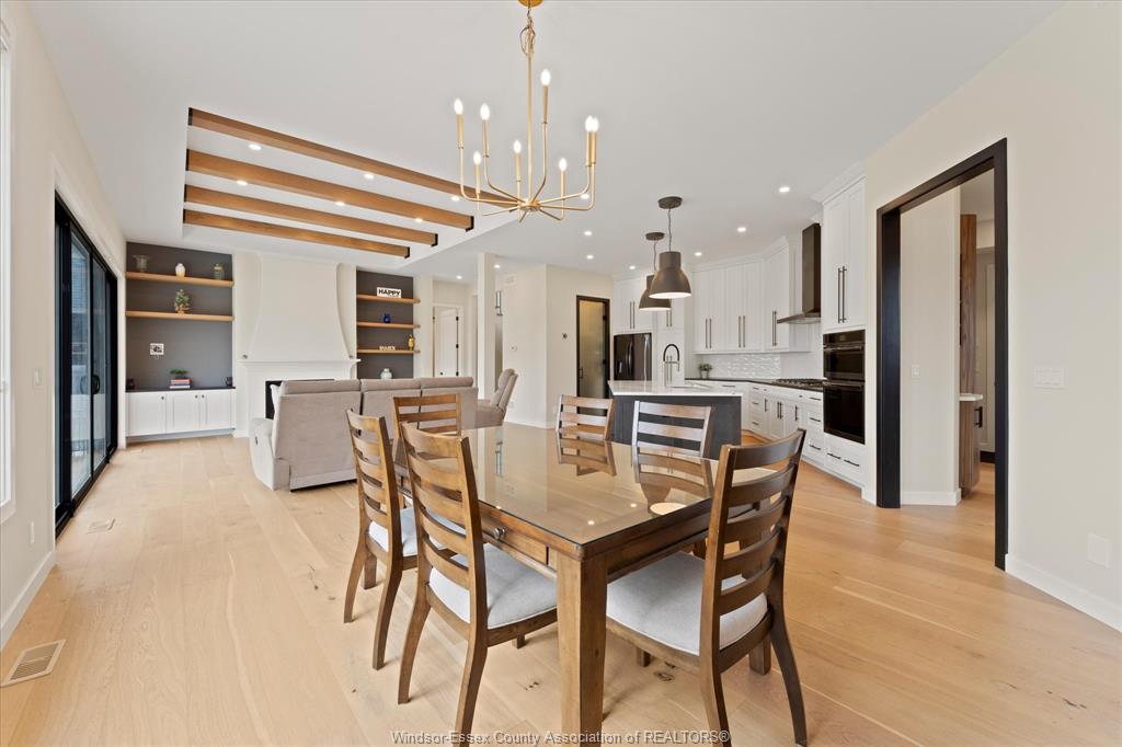 Stunning custom-built two-storey home (2022) set on an exceptional 80 x 350 ft lot backing onto a conservation area, offering rare privacy and picturesque natural views. Boasting over 3,200 sq ft plus a fully finished basement, this home is filled with natural light, highlighted by expansive windows and soaring 12 ft ceilings on the main floor. Thoughtfully designed with elegant, modern finishes throughout, the main level features a luxurious primary suite with a spa-inspired ensuite and heated floors, and a private office with full glass doors. The beautifully appointed chef’s kitchen showcases a large angled center island with quartz countertops and integrated sink, ceiling-height custom cabinetry, stylish backsplash, and high-end stainless steel appliances including a built-in oven and gas cooktop. The open-concept layout flows seamlessly into the dining and living areas, where you’ll find custom ceiling details, built-in shelving, and a gas fireplace, along with an extra-wide patio door leading to a covered porch overlooking the serene natural setting. Upstairs offers three spacious bedrooms, including a junior ensuite, along with skylights that enhance the bright and airy ambiance. The fully finished basement provides exceptional versatility with a summer kitchen, two additional bedrooms, a family room, and a grade-level entrance. Additional highlights include hardwood flooring throughout, a landscaped yard, two-zone heating and cooling, a double car garage, and an extra-wide driveway. Ideally located in one of kingsville’s most desirable areas, just steps from the kingsville golf club and minutes to downtown, the lake erie waterfront, parks, and local wineries. An exceptional opportunity to enjoy refined living in a setting that perfectly balances tranquility and convenience.