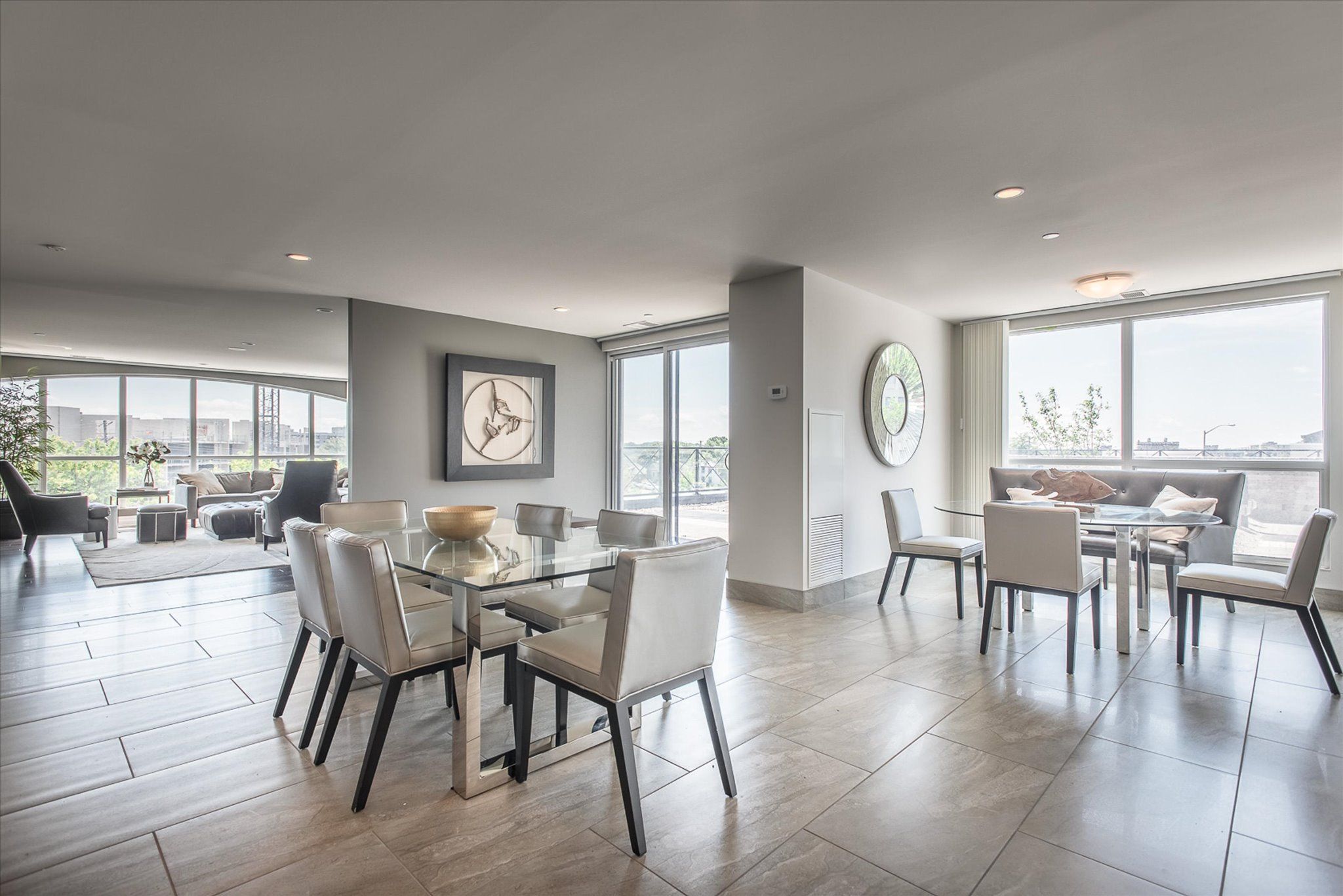 • Open-concept layout with large windows and city views from the balcony.