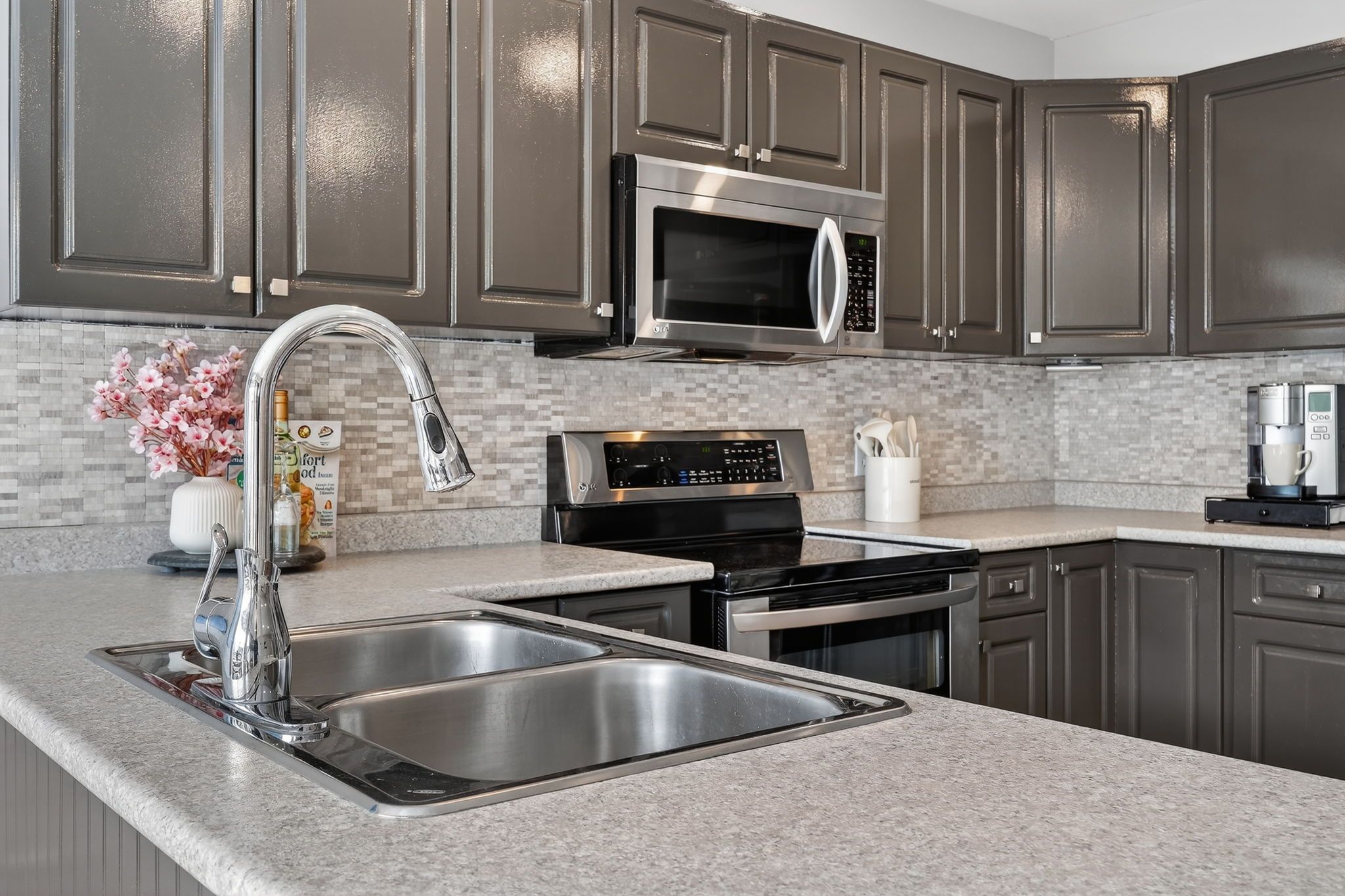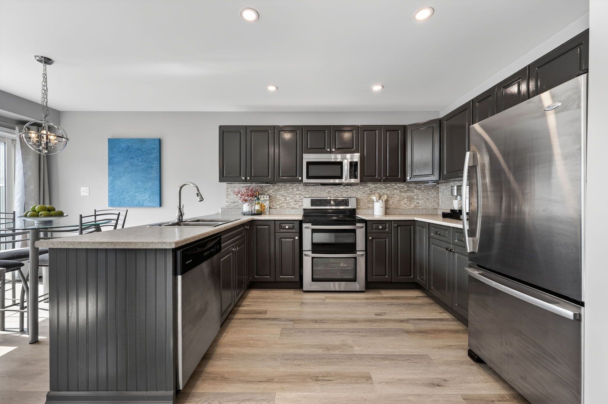 • Stylish kitchen with stainless steel appliances and elegant backsplash.