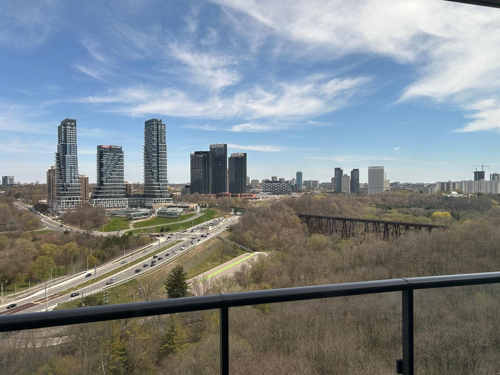 Stunning 1 br+1 den suite (670 sqf+ balcony), the unit features: 9'ft ceiling, open concept, laminate floors throughout, floor to ceiling windows. Den can be the 2nd br. W/ unobstructed panoramic view! At a prime location! In leaside cozy large balcony overlooks sunnybrook park & e. T seton park. Located steps to ttc, lrt & minutes to dvp. Close to smart center , supermarkets & everything. Stainless steel fridge, stainless steel stove, rangehood, b/i dishwasher, washer & dryer. Light fixtures, blinds. 1 parking ( just across to the entrance ) & 1 locker !