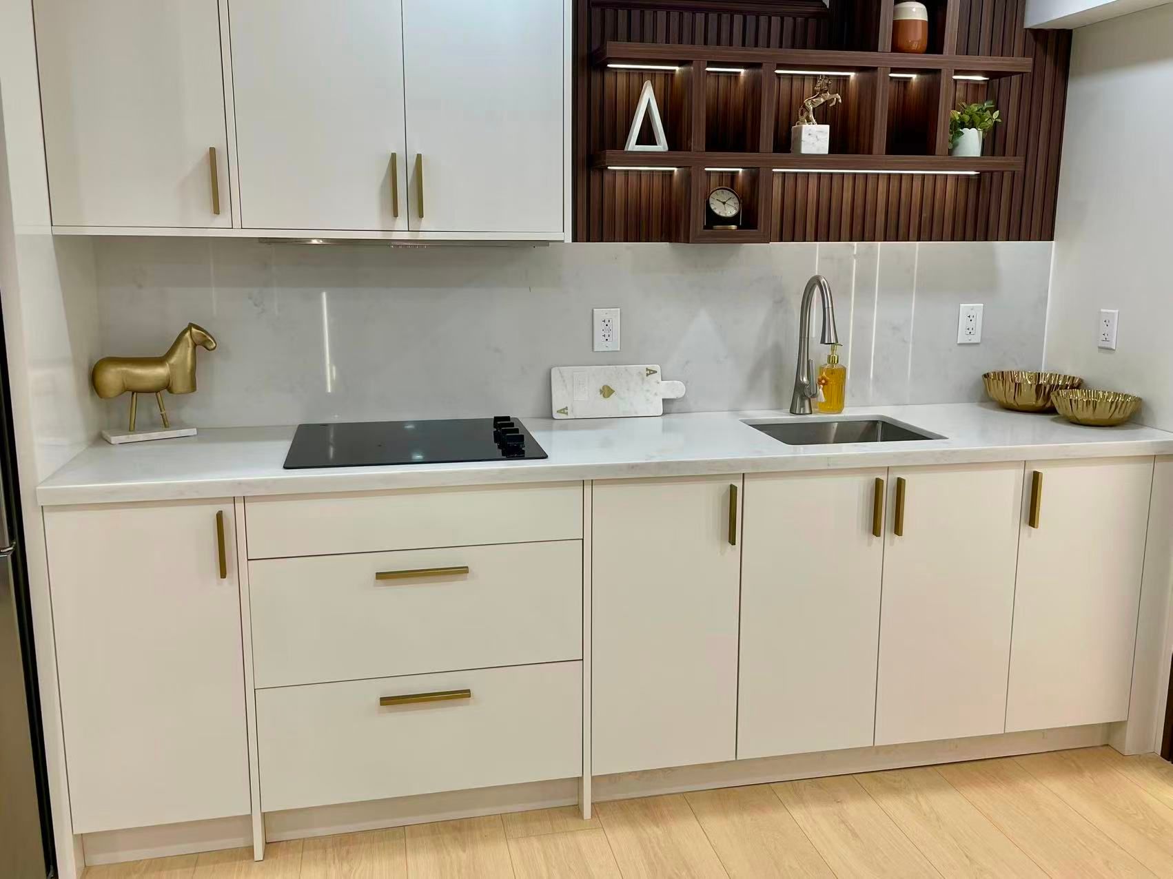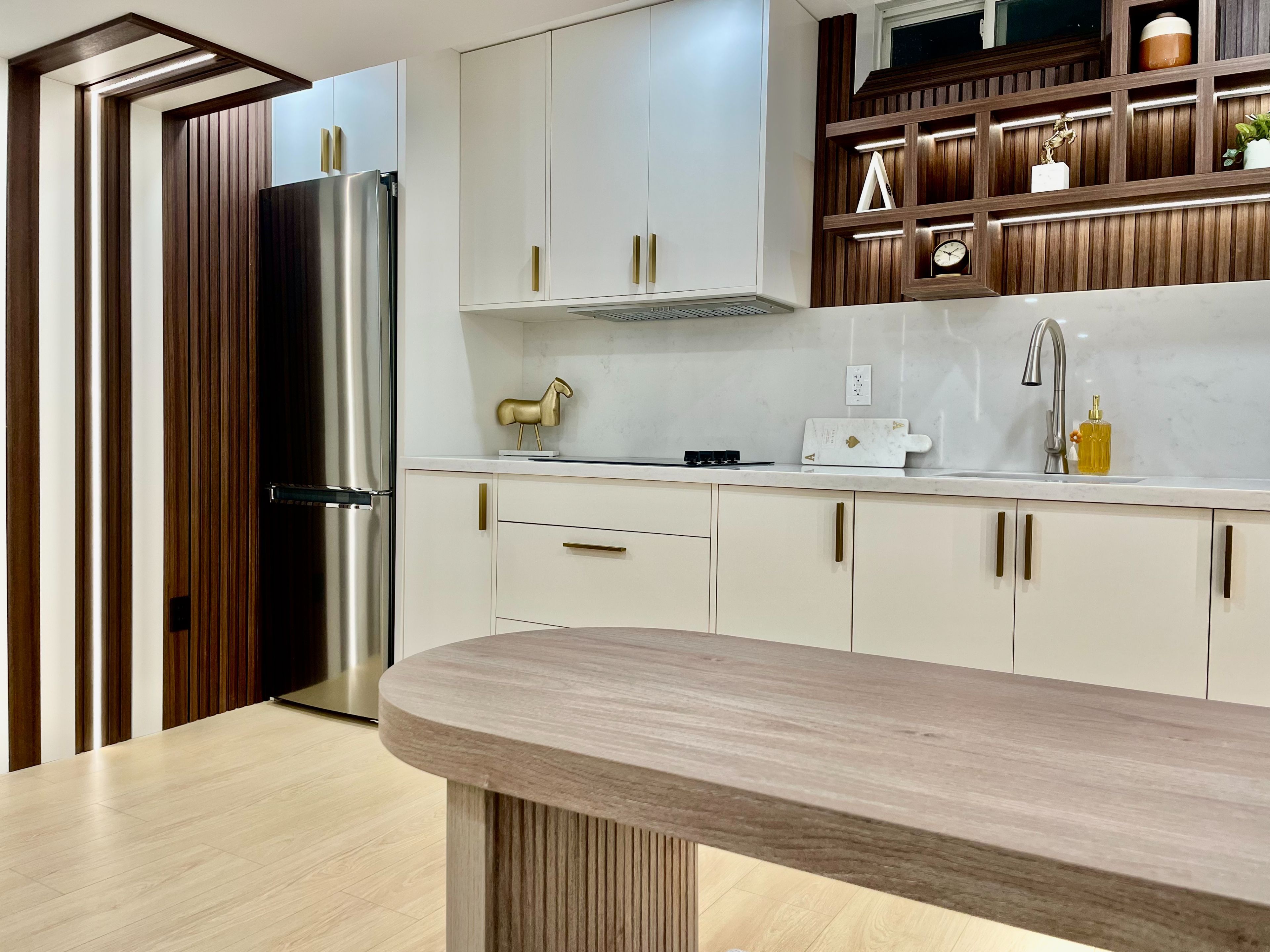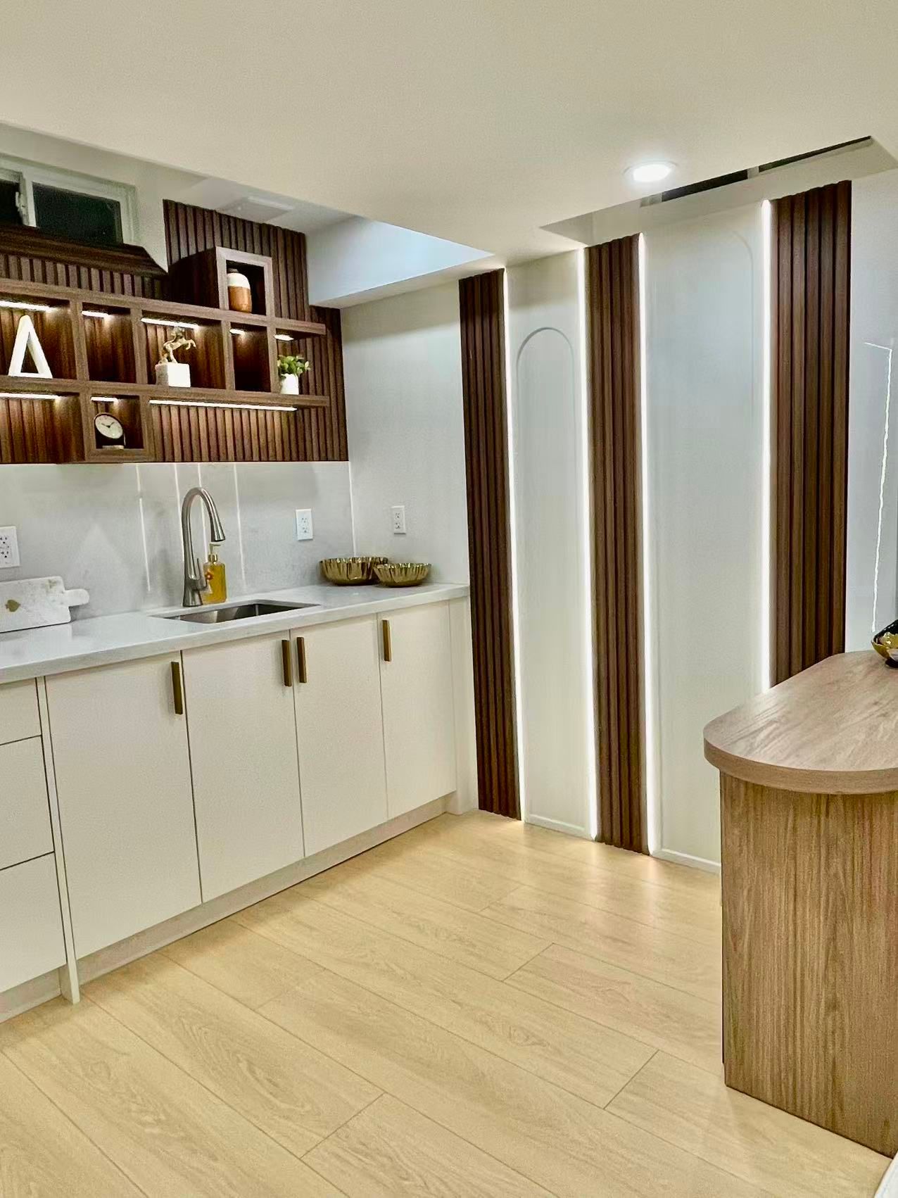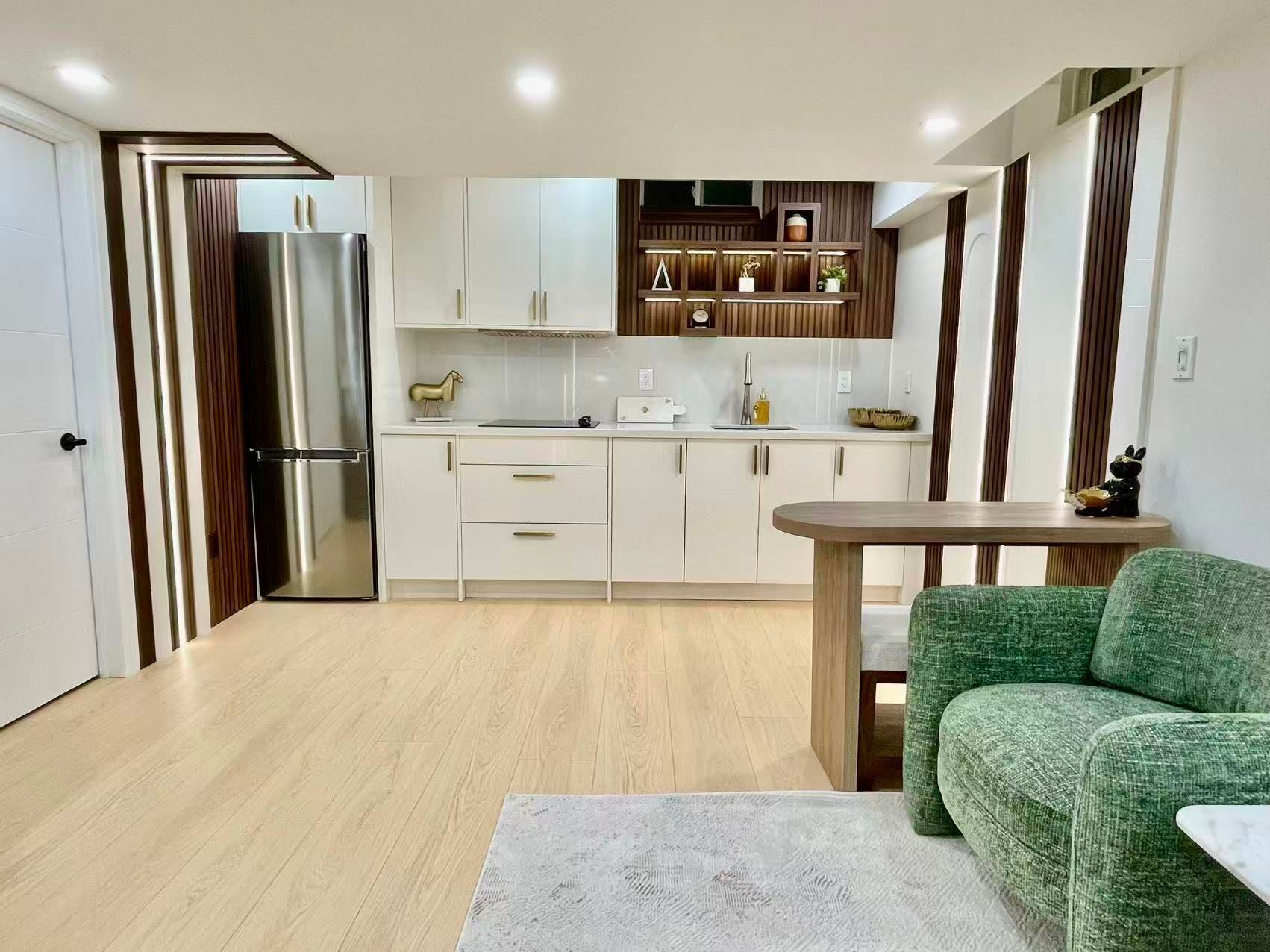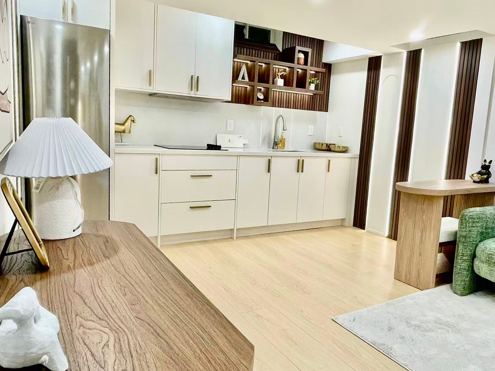 • Contemporary kitchenette for convenient cooking and meal prep.