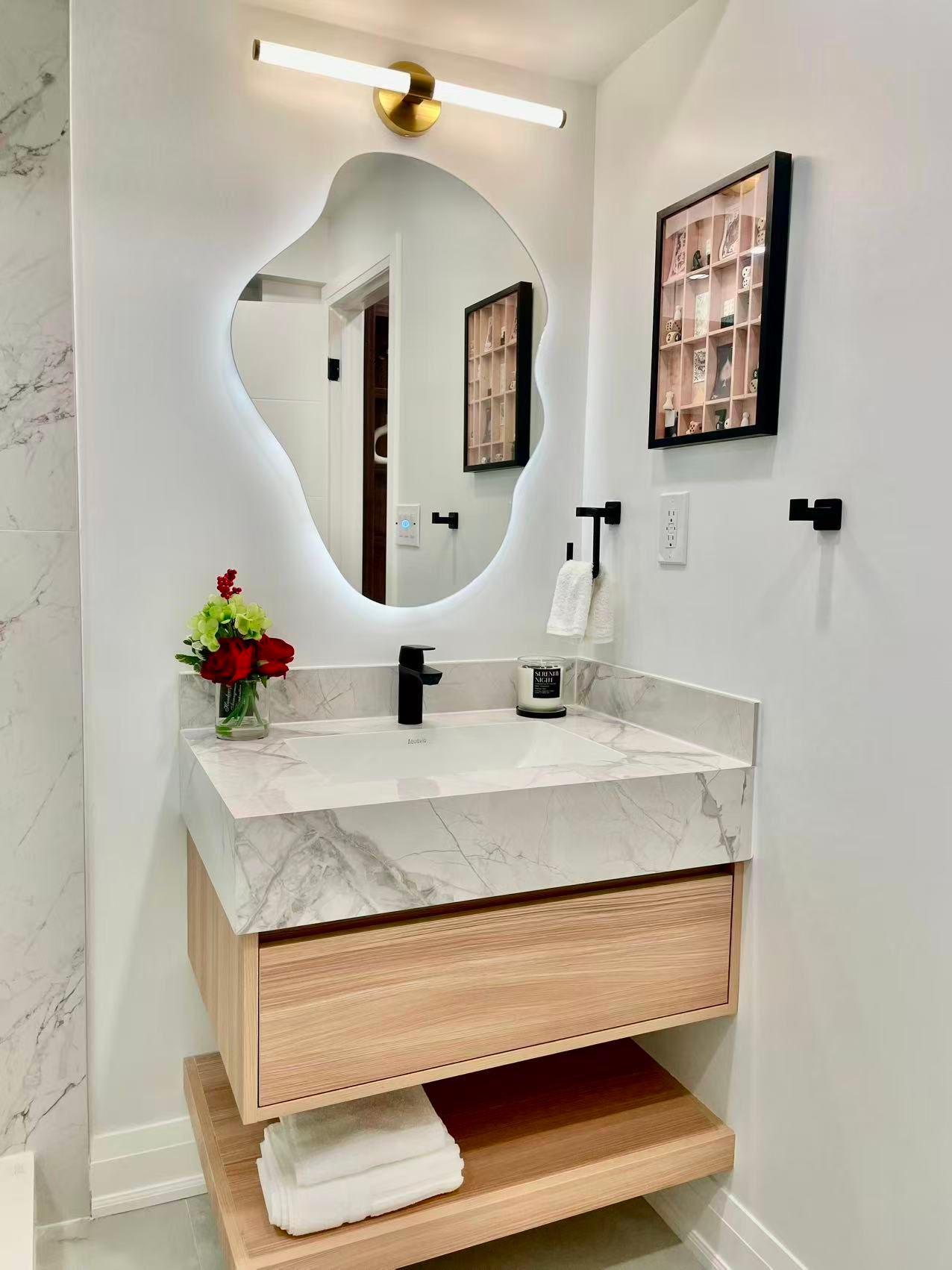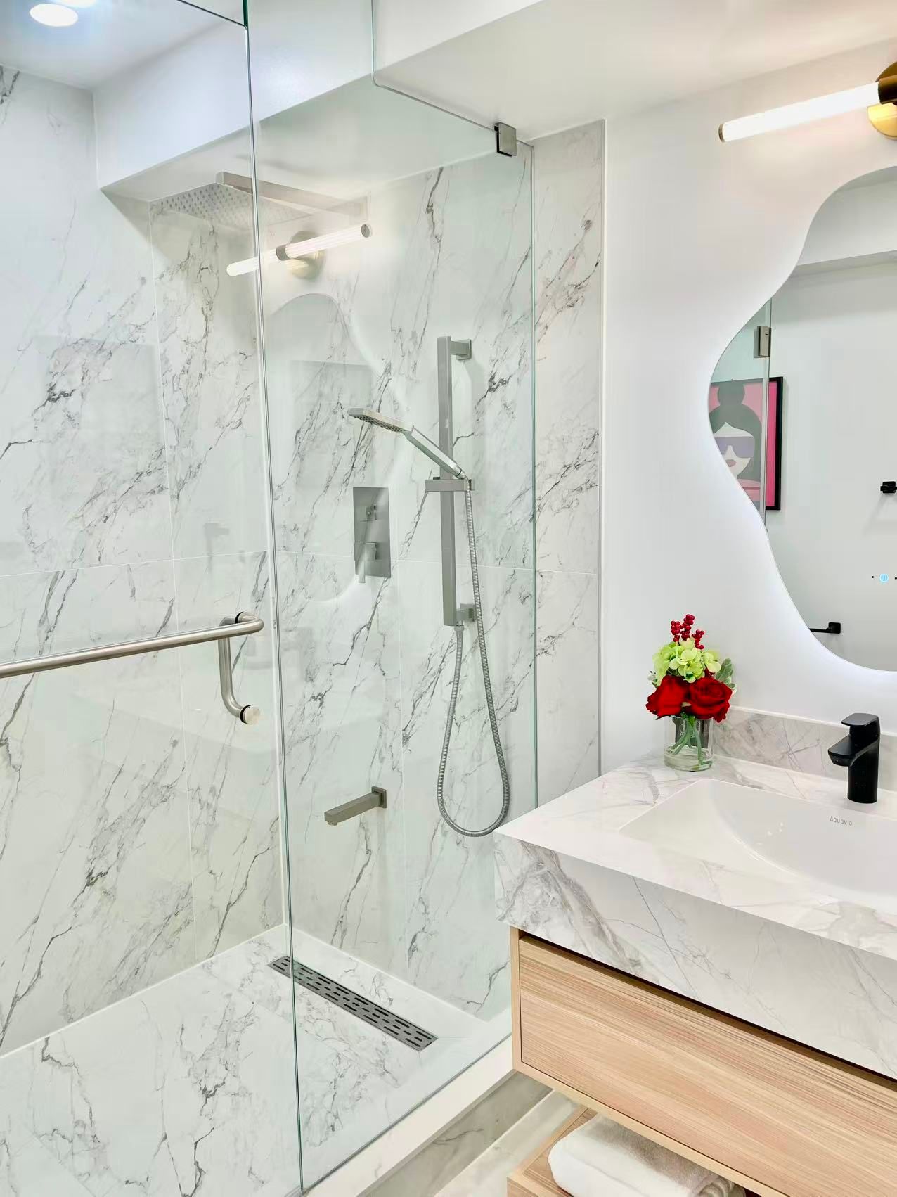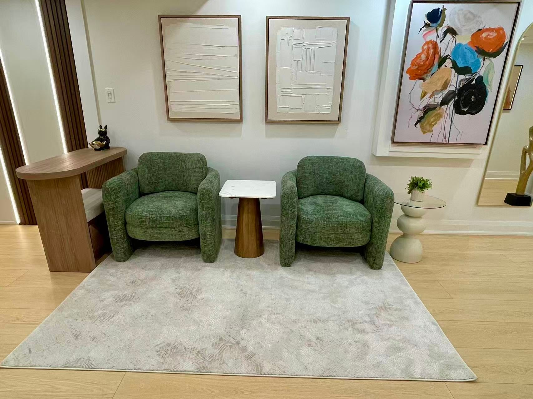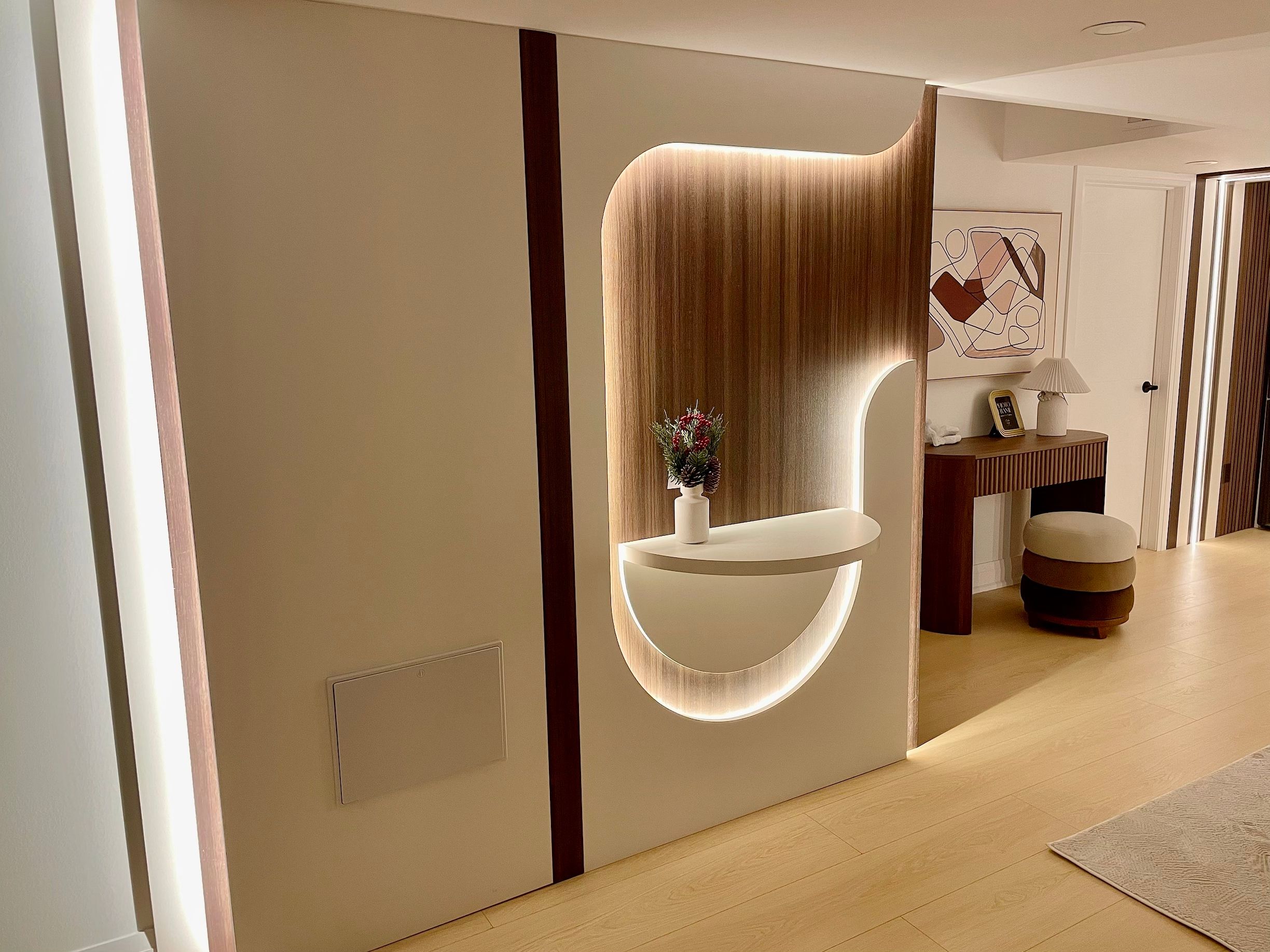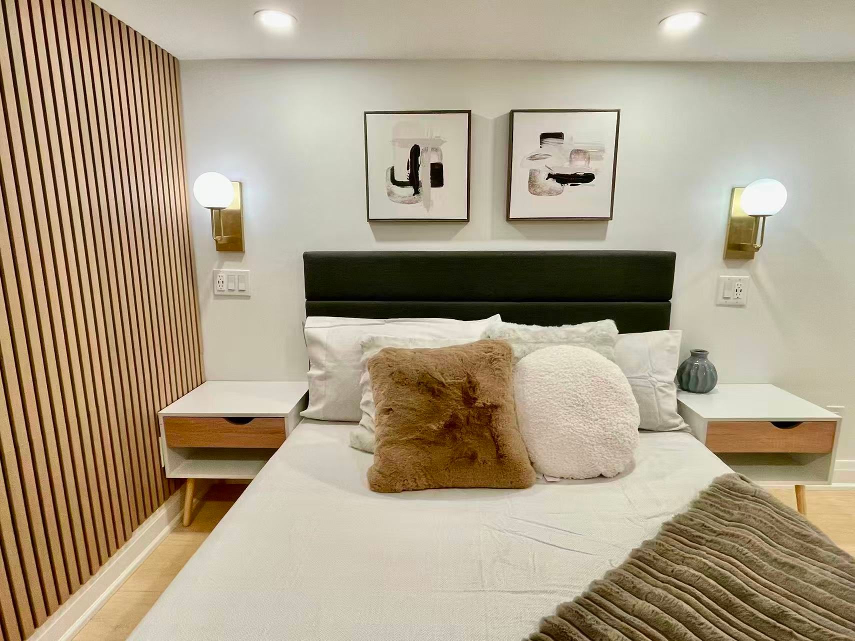 • Contemporary kitchenette for convenient cooking and meal prep.