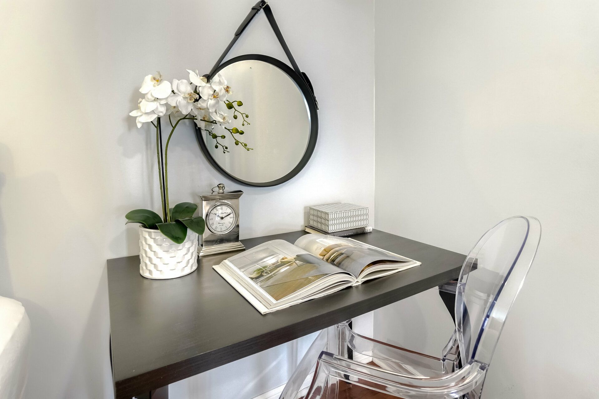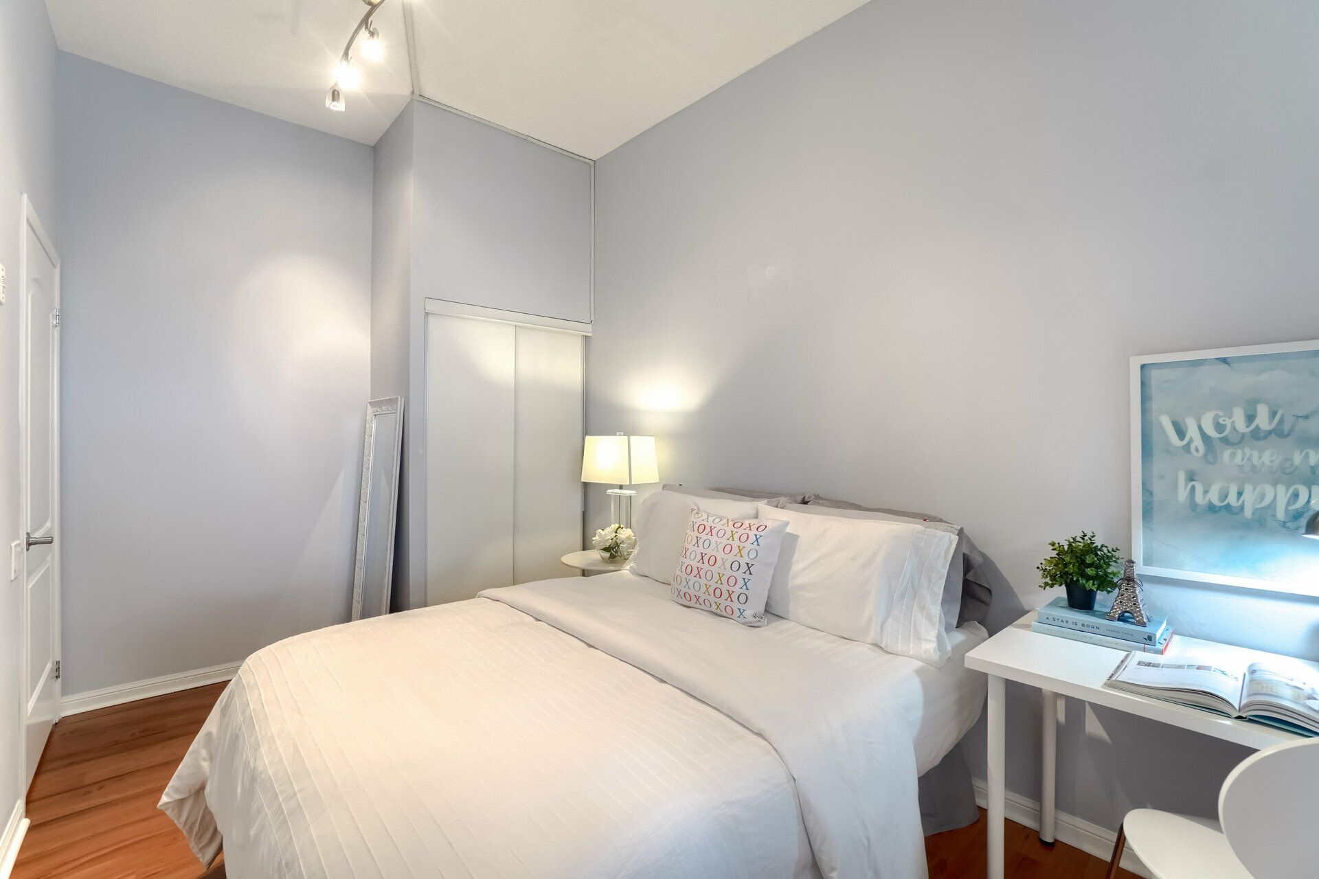 • Two spacious bedrooms for a primary, office, or gym setup.