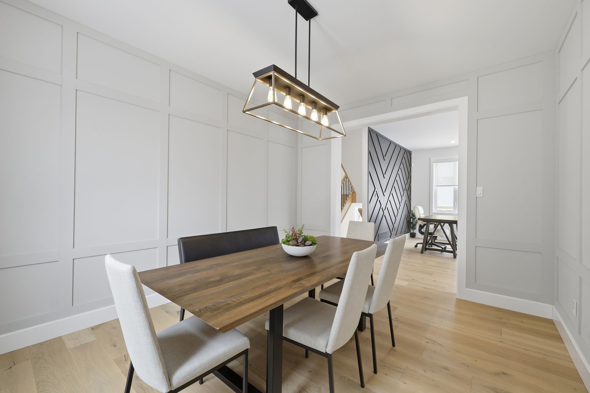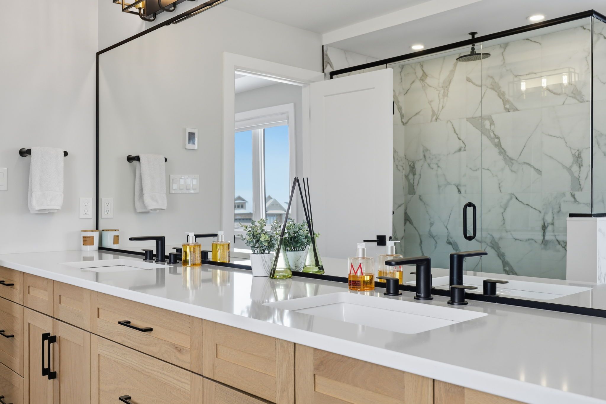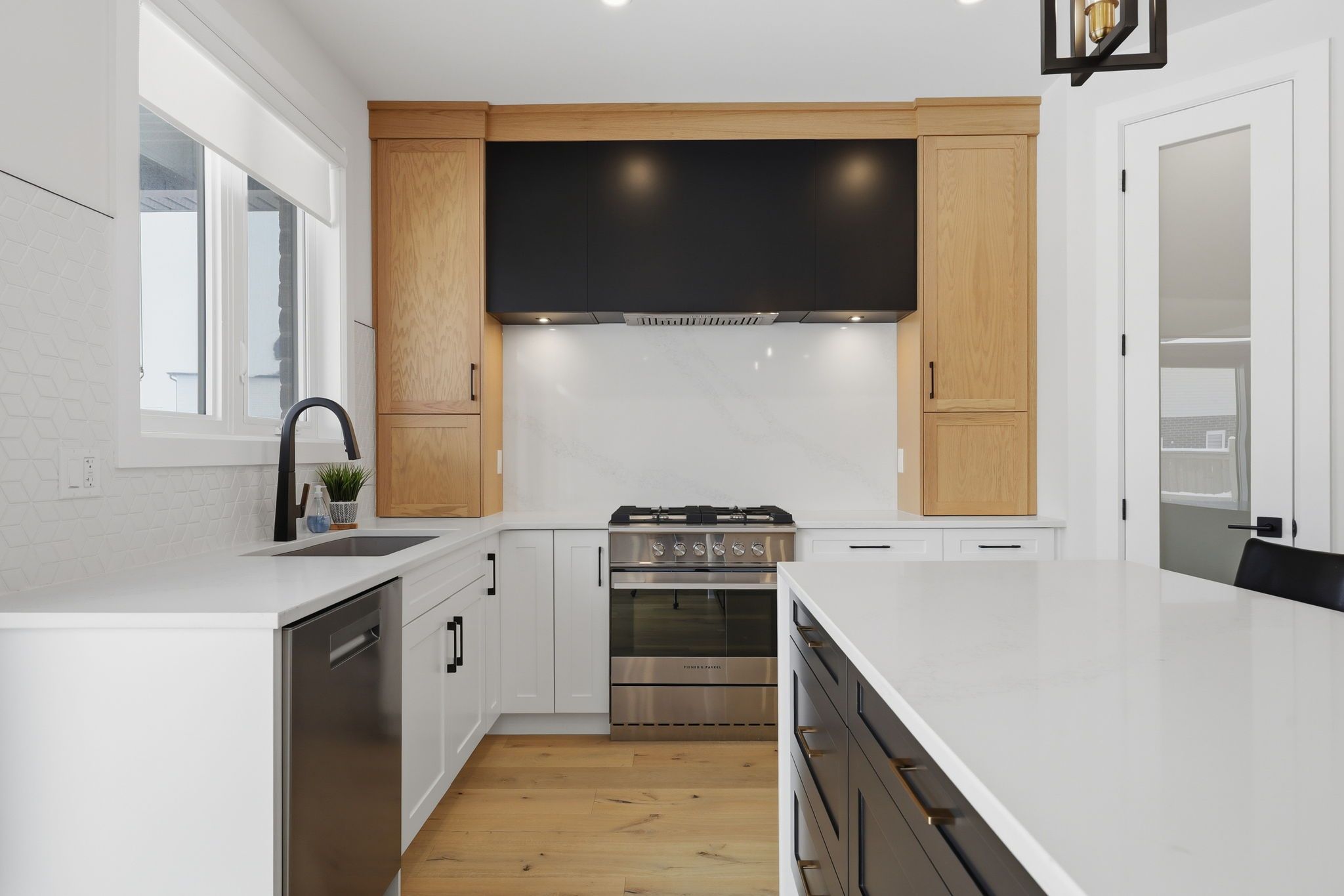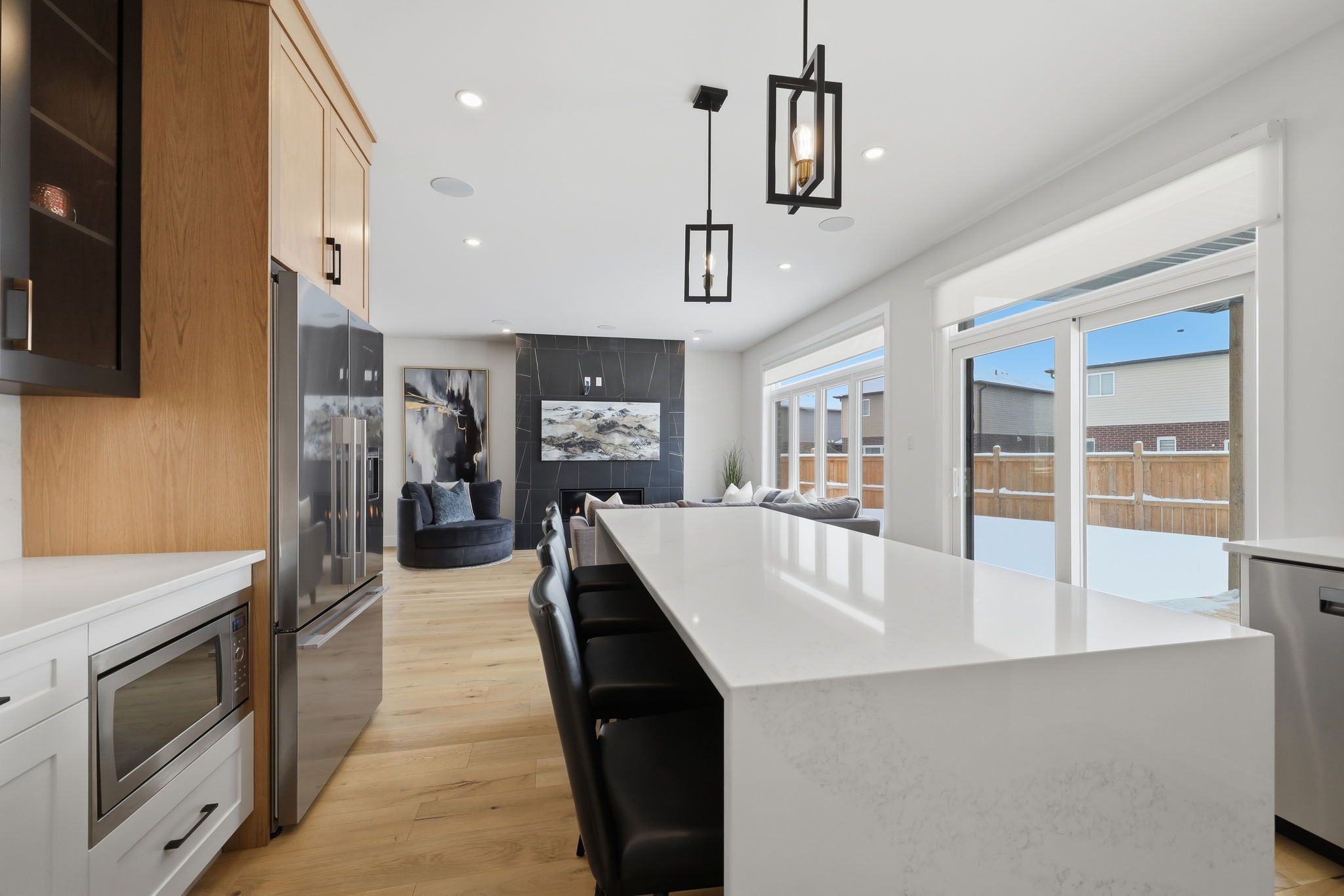 • Modern kitchen with quartz countertops, high-end appliances, and a walk-in pantry.