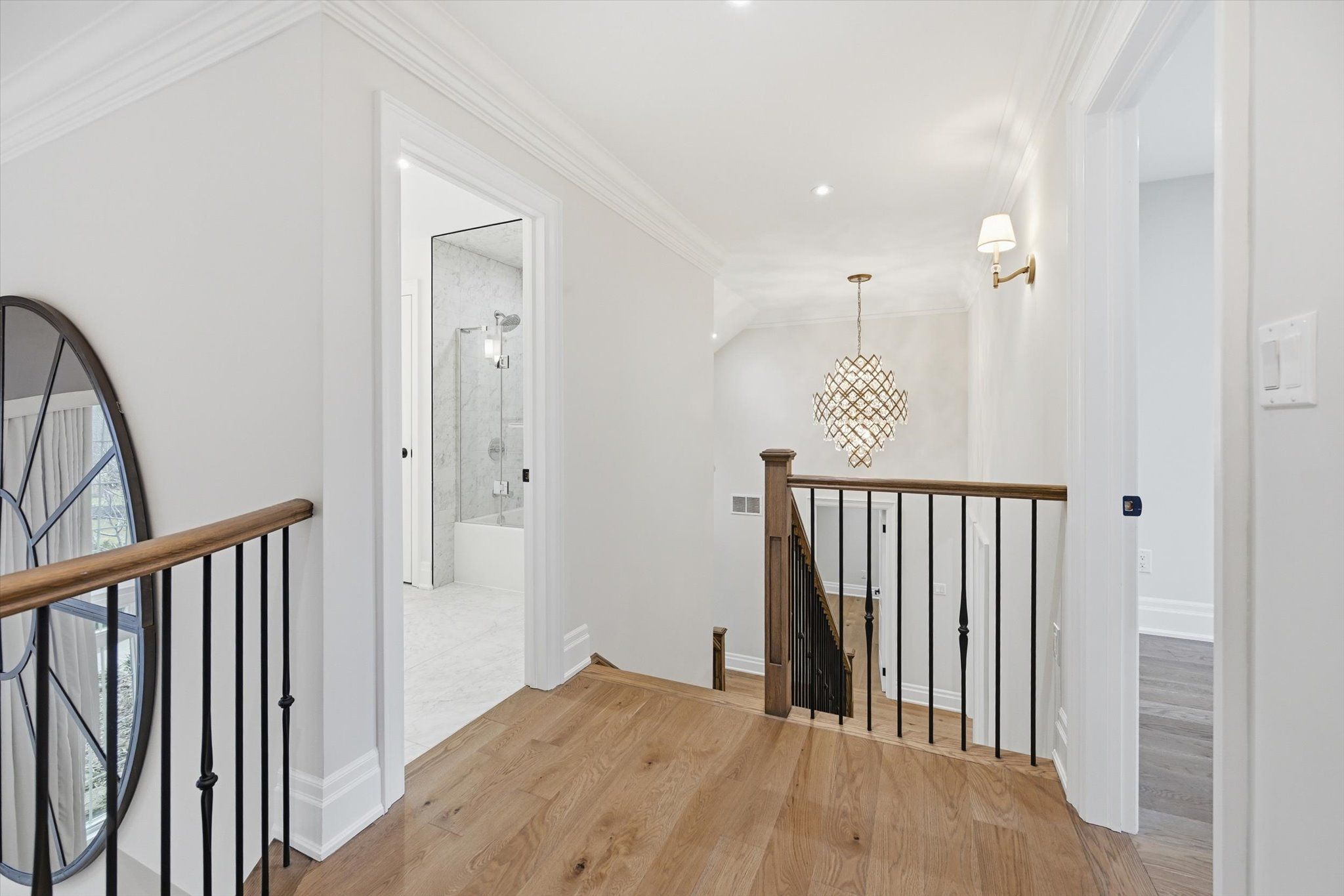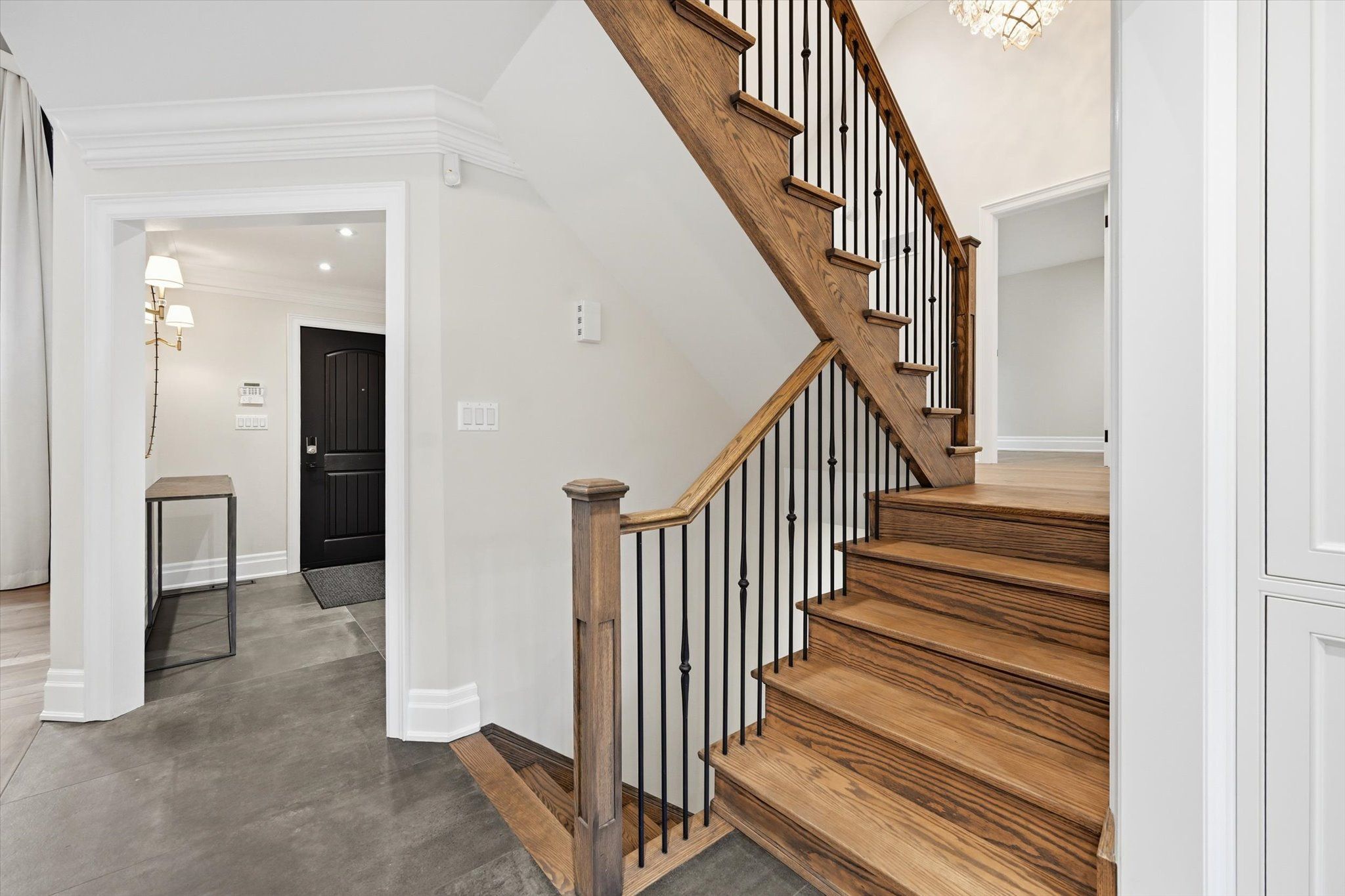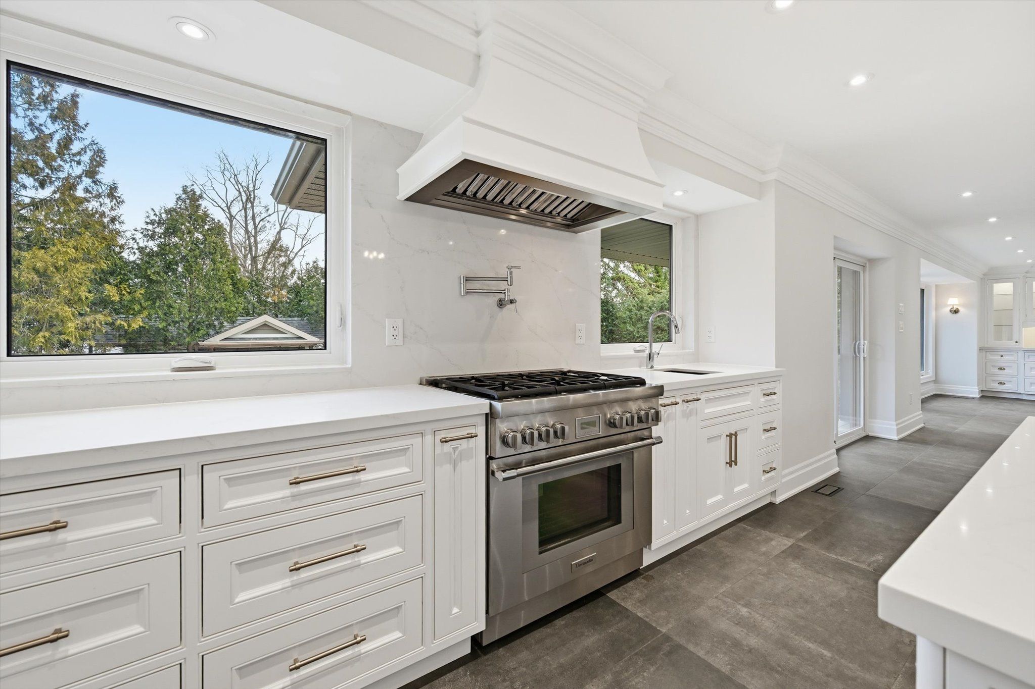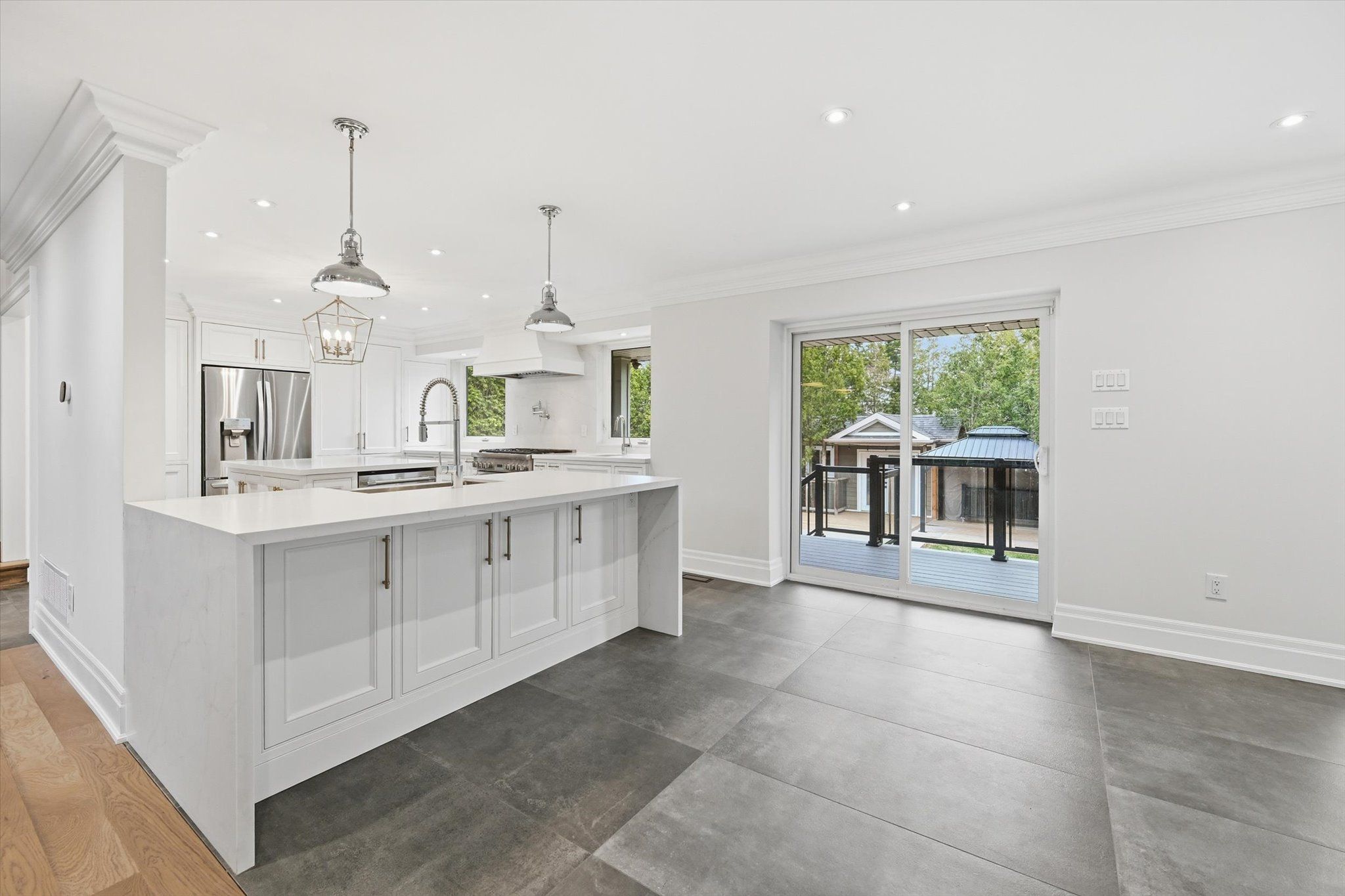 Situated in the prestigious coronation park enclave of south-west oakville, this reimagined custom residence offers over 4,500 square feet of finished living space on a premium 90' x 125' mature lot. Designed for modern family living, the home features 6 bedrooms and 4. 5 bathrooms with refined finishes and a highly functional layout. A grand double-height living room with 17' ceiling and architectural windows anchors the main level, complete with a gas fireplace and automated drapery. The chef-inspired kitchen features peninsula seating, a farmhouse sink, separate prep island, quartz surfaces, a 36" thermador gas range with pot filler, integrated hood, prep sink, and thermador dishwasher, opening to the dining area with walkout to a composite deck with glass railing. The second level includes two spacious bedrooms, one with a four-piece ensuite, powder room, and a versatile vaulted lounge. The third level is dedicated to a private primary retreat with dual walk-in closets, including a laundry rough-in, and a spa-inspired five-piece ensuite with freestanding tub, oversized glass shower, and heated floor. Two additional bedrooms and a five-piece bath complete this level. The finished lower level offers a media room with built-in shelving and av rough-in, along with a sixth bedroom or office. A recreation area with walkout, dedicated gym, full bath, laundry, and built-in storage with direct garage access can be found on the basement level. Additional highlights include engineered hardwood flooring throughout, dual hvac systems, ecobee thermostats, soffit lighting, a five-car driveway, and a backyard with saltwater pool, outdoor wet bar, pergola, and multiple seating areas. Walking distance to coronation park, the lakefront, and top-ranked schools. (certain images have been digitally enhanced and virtually staged)