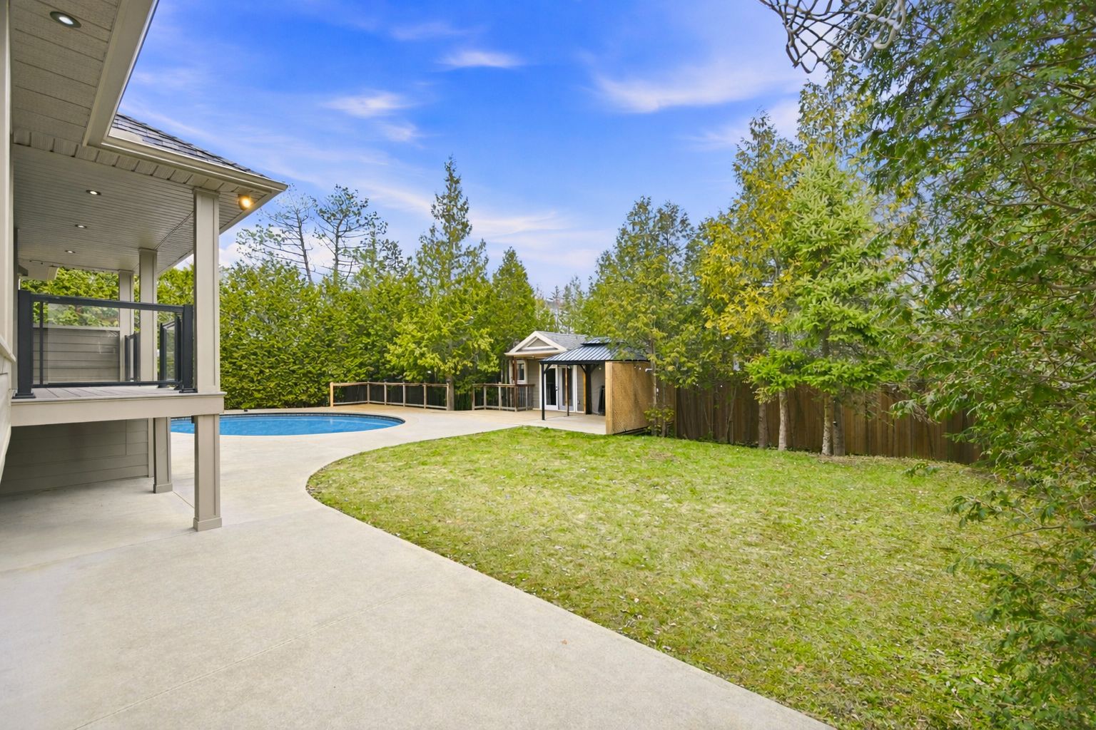 • Backyard oasis featuring a saltwater pool, outdoor wet bar, and multiple seating areas.