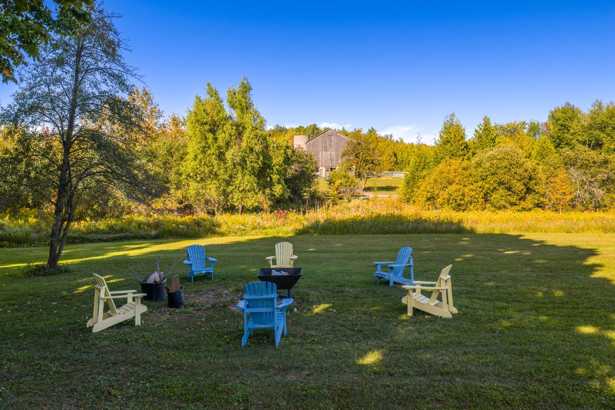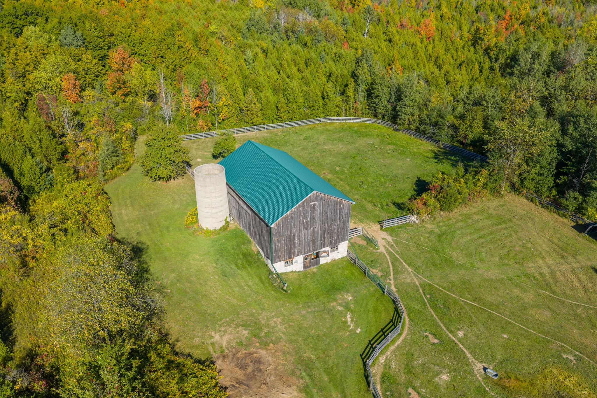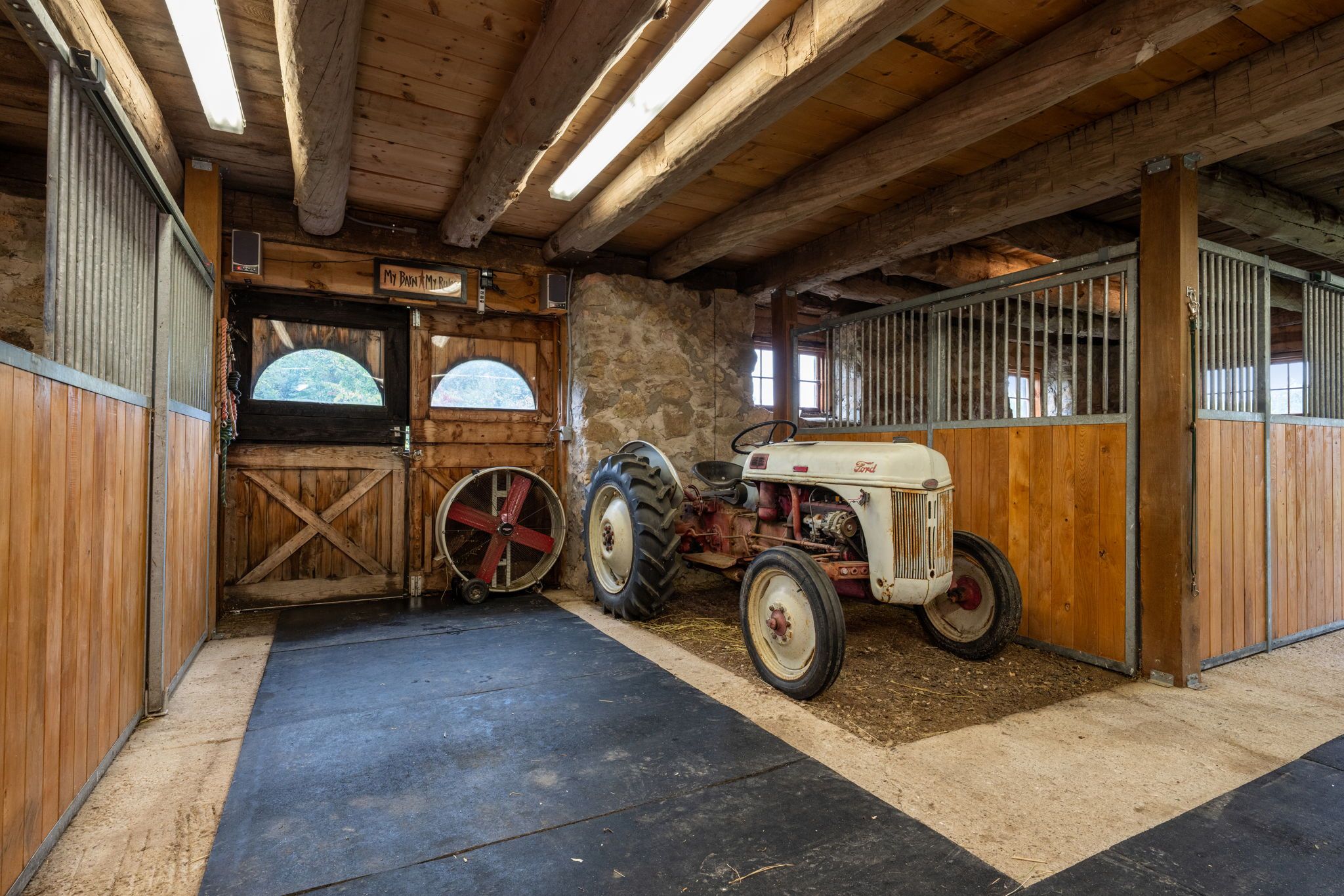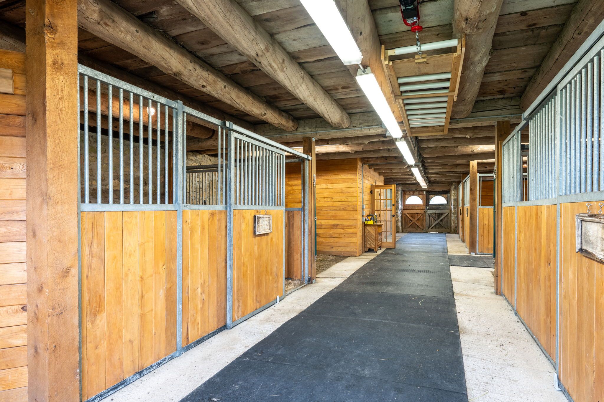 • Equestrian-ready barn with five stalls and a heated workshop for various uses.
