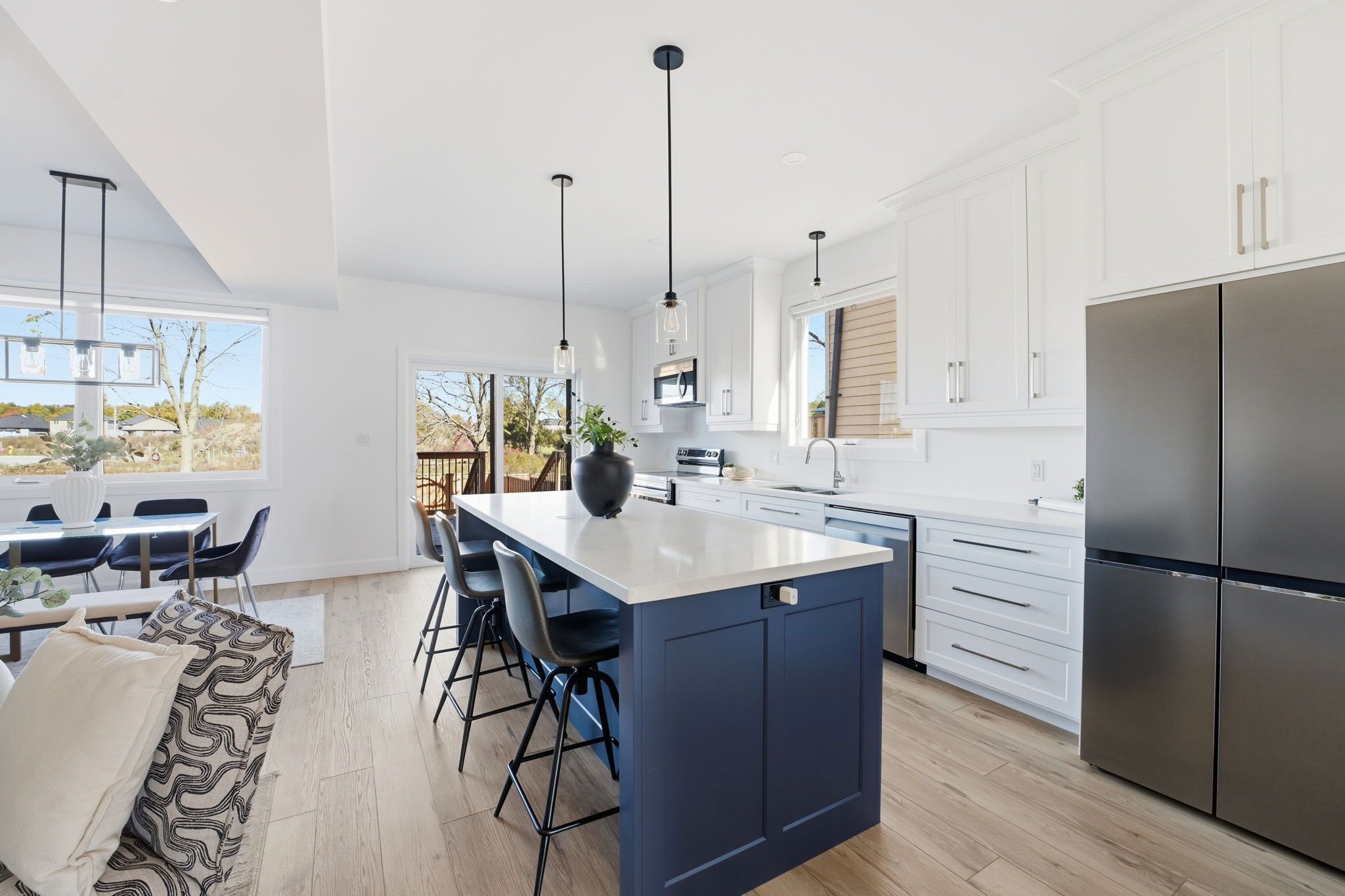 Welcome to this beautifully updated two-storey semi-detached home in the heart of tillsonburg, where small-town charm meets modern comfort. Step inside to a bright, open-concept main floor designed for both everyday living and entertaining. The stylish kitchen impresses with floor-to-ceiling white cabinetry, a striking navy island, and sleek, contemporary finishes. The adjoining dining area flows seamlessly through patio doors to a private deck-perfect for summer barbecues or quiet morning coffees. Upstairs, the primary suite features a walk-in closet and a private ensuite, while two additional bedrooms and the convenience of second-floor laundry complete this level. The unfinished basement offers exciting potential for a future family room, playroom, or home office-customize it to suit your lifestyle. Situated close to parks, schools, and local amenities, this home combines modern living with the warmth of a welcoming community.