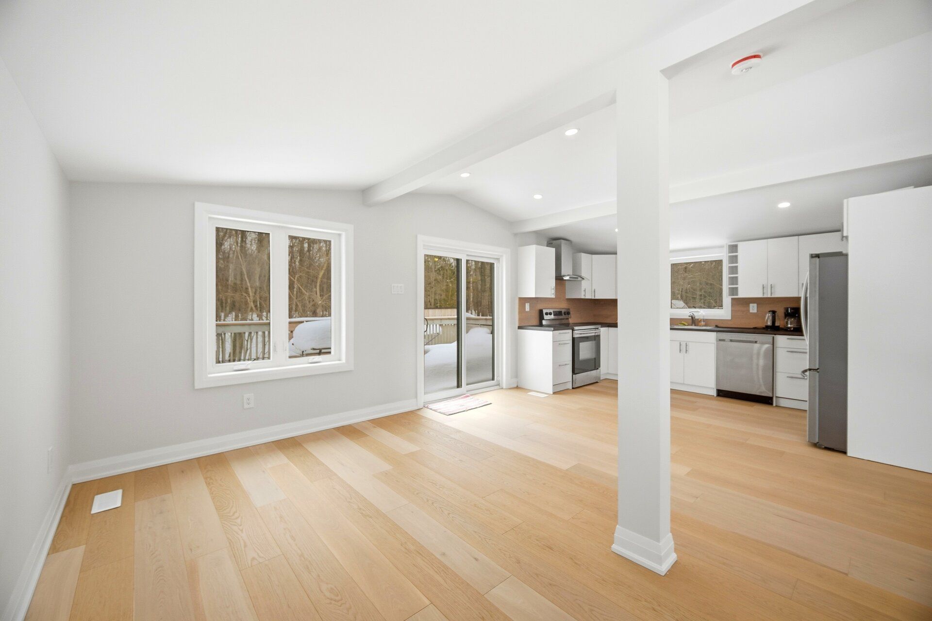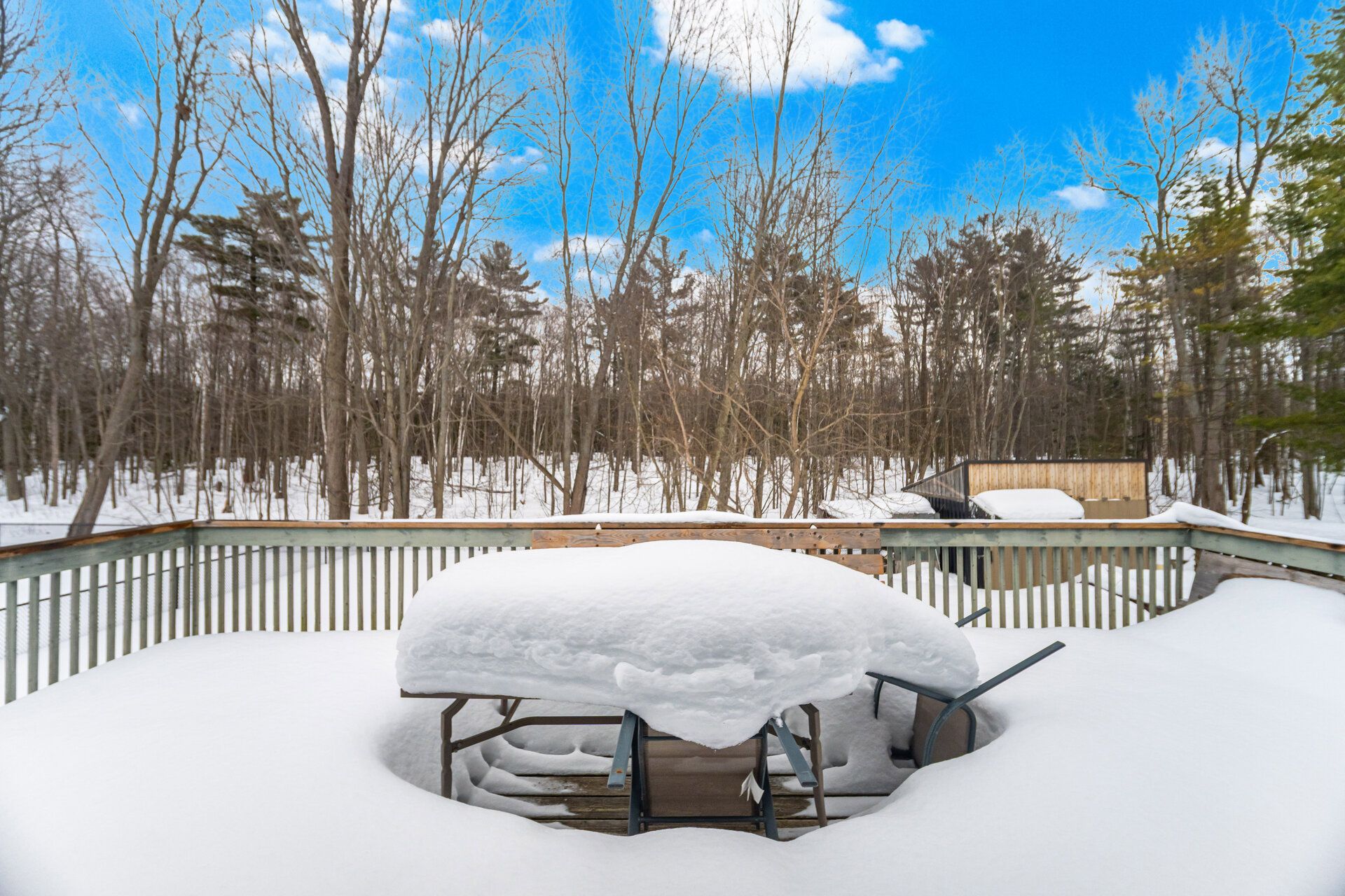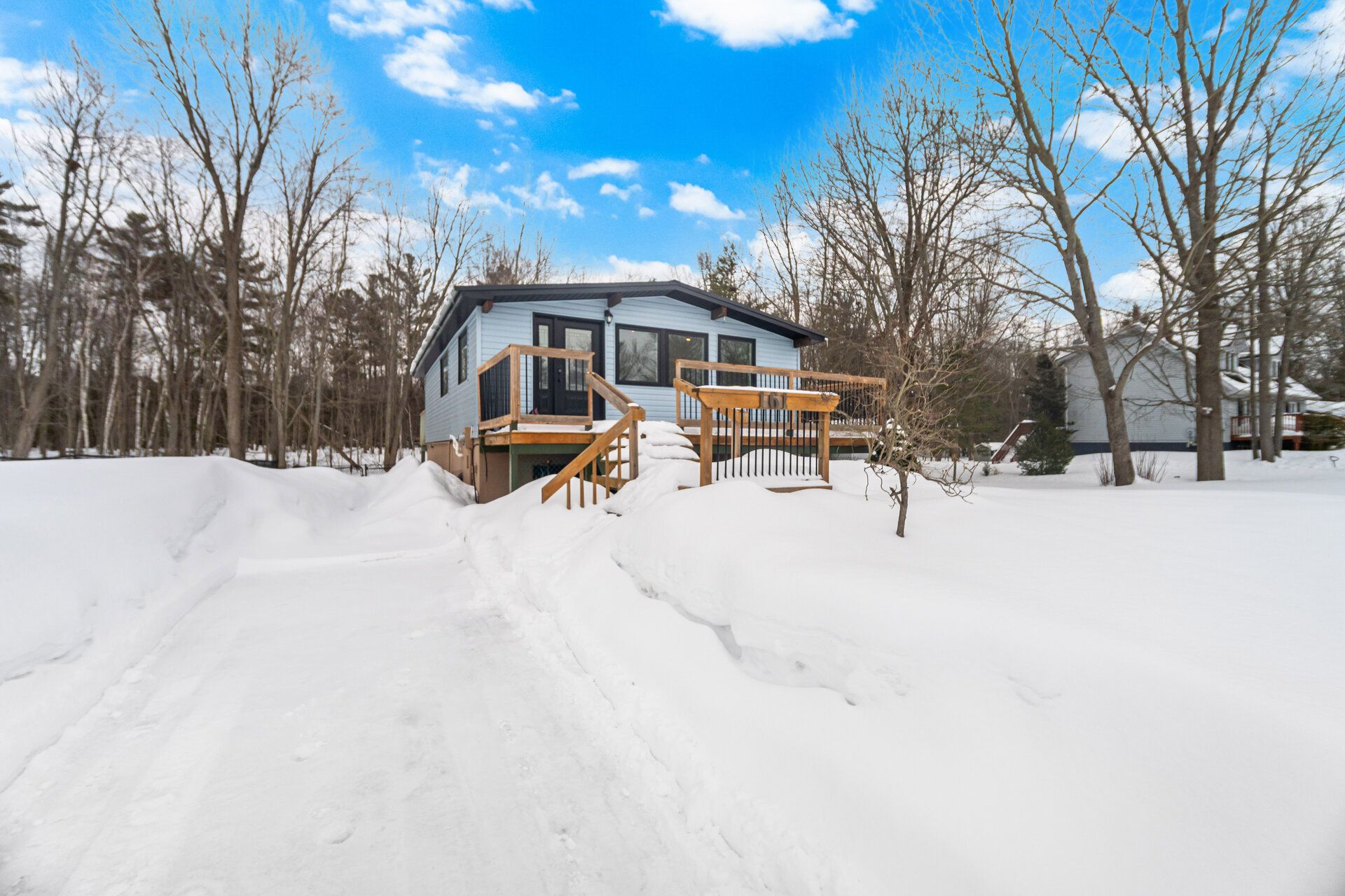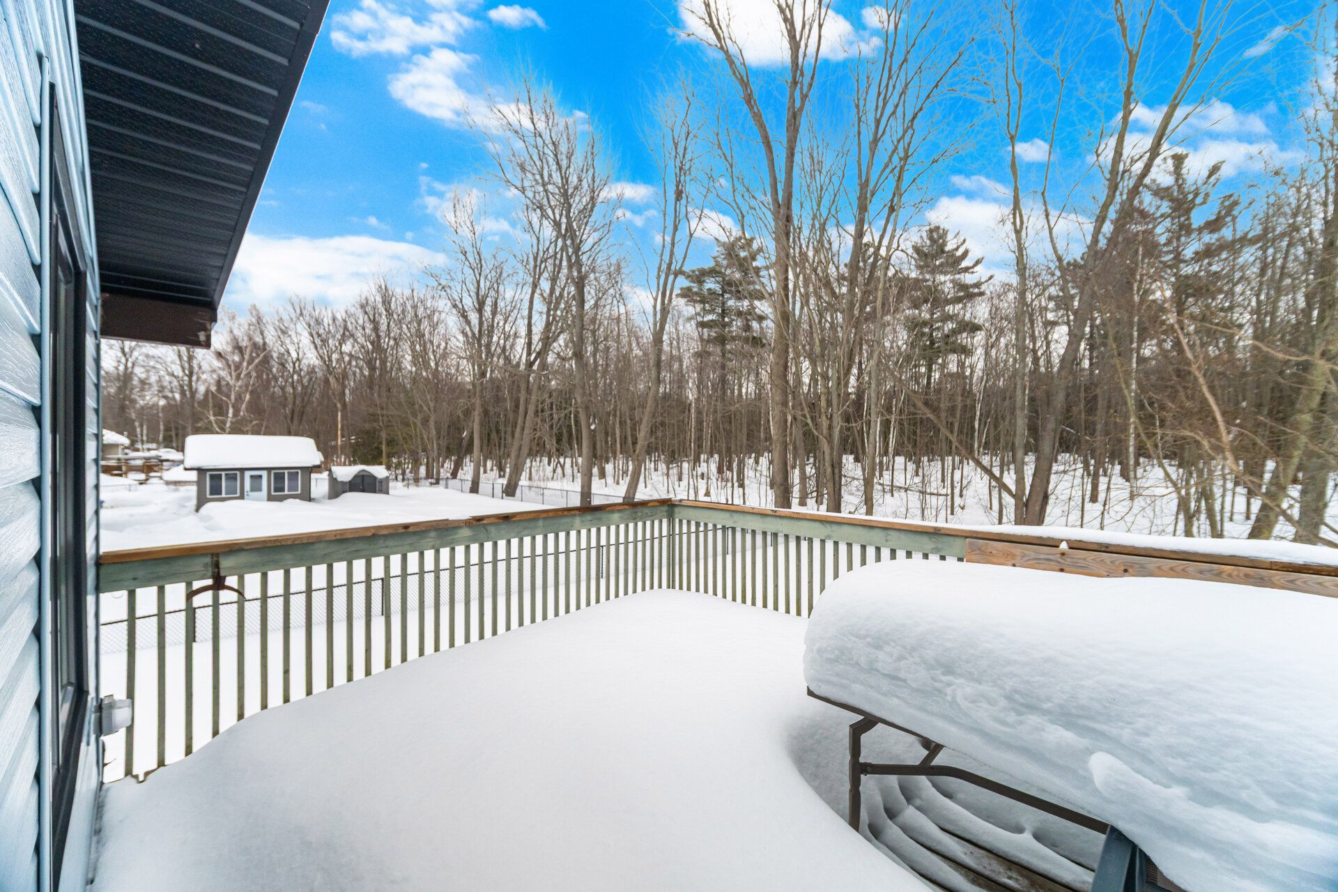 • Large rear deck offering peaceful views of trees and nature.