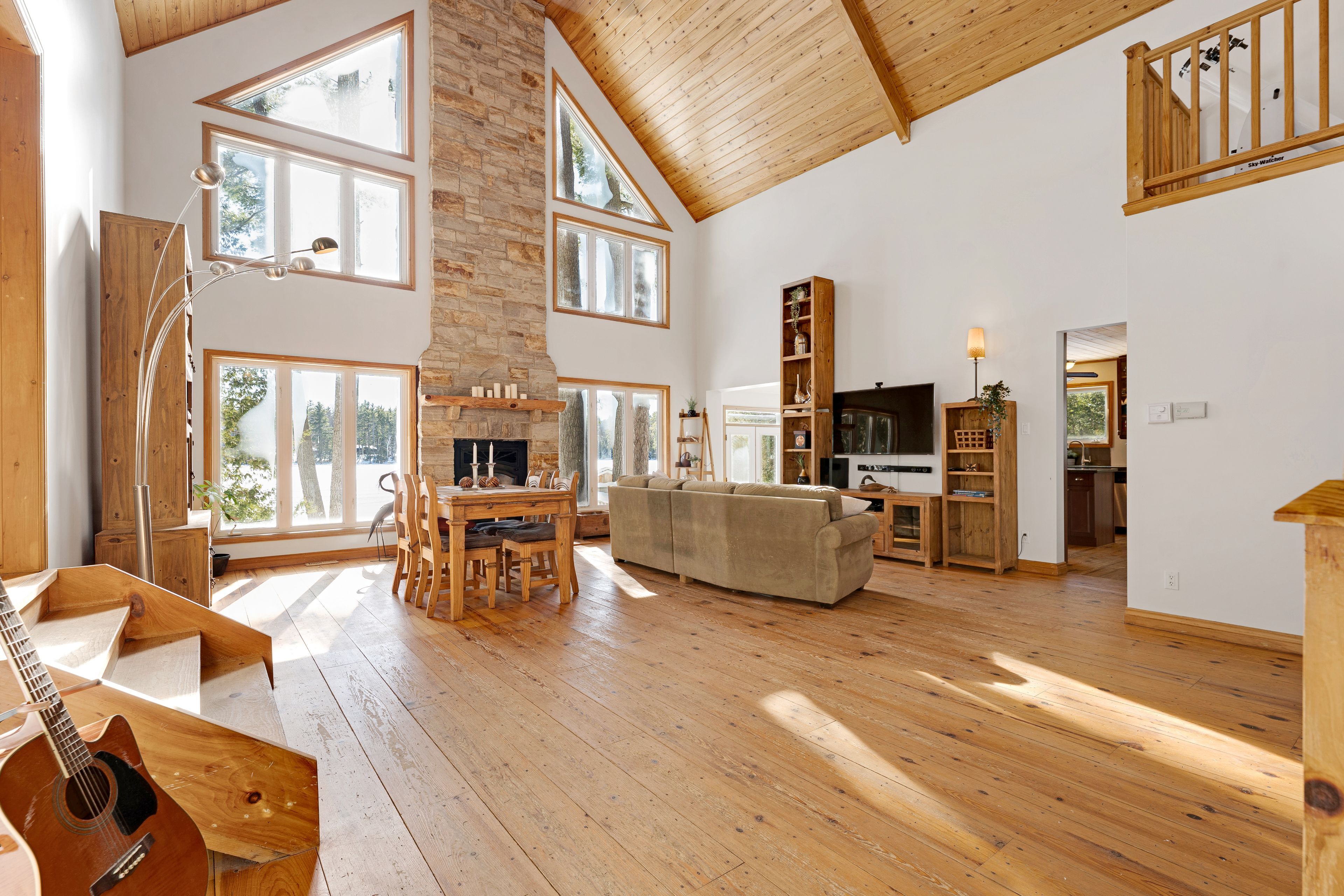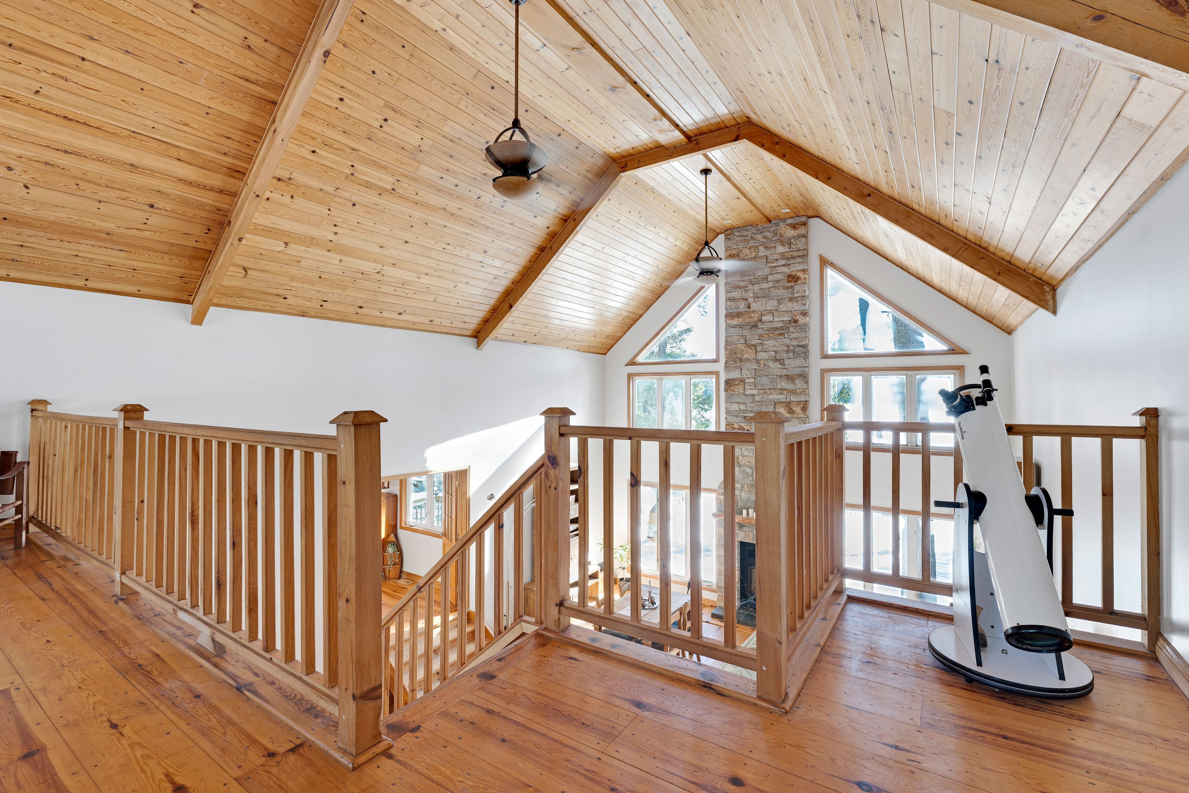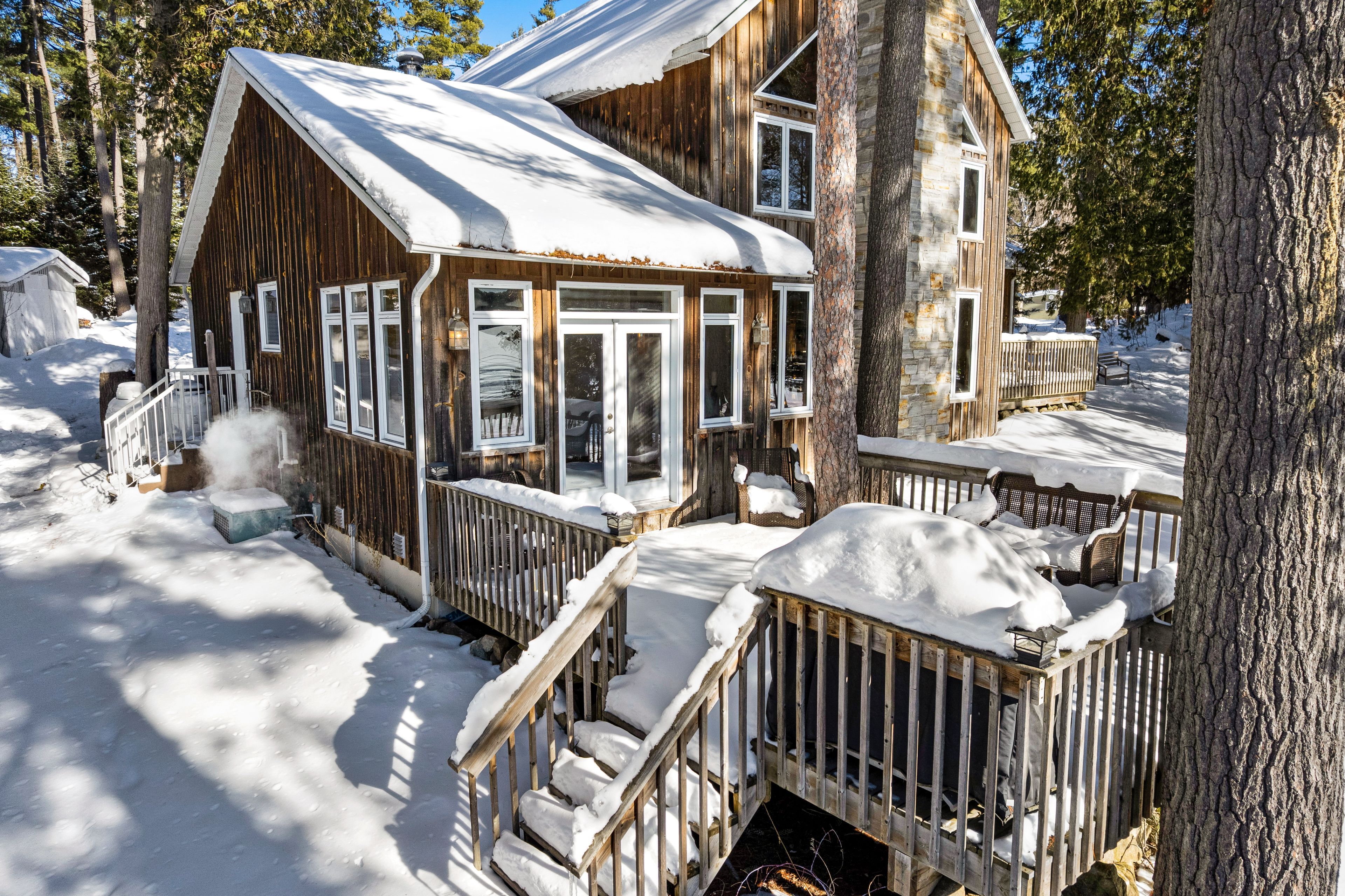 In a quiet bay on white lake, sunny and spacious home with warm wood tones that blend beautifully into the natural surroundings. Ideally sited, this home offers full lake views. Your boat is also well taken care of, with a boathouse and marine rail for proper winter storage. The home's front foyer welcomes you with easy-care ceramic floor and convenient closet. From here, step into the great room with big light-filled spaces opening up to the soaring 22' high cathedral ceiling. Lovely hand-chiseled stone fireplace adds charming character and includes woodstove insert. Pine plank and ceramic flooring flow thru the home. In the sunroom, relax while soaking in views of the continuous beauty of each season. Warmly inviting kitchen features granite countertops, granite island and attractive tongue & groove pine ceiling. Primary suite vaulted ceiling and garden doors to your own deck; the ensuite has two-sink quartz vanity and glass shower. Primary suite also has sitting nook with woodstove, for a cozy retreat. Comfortable second bedroom and four-piece bathroom. Main floor laundry room with window. The second floor has large loft for flex space - with amazing panoramic lake views. Large deck perfect for lounging and watching the sun and then the moon cross over the lake. Oversized detached single garage has workbench, two 240 v outlets, concrete floor and overhead electrical heater. New septic installed 2014; septic inspected in 2024. The boathouse has hydro, ramp plus electronic winch to help put the boat in and out of the lake. The boathouse, garage and home all have metal roofs. Boat launch and huge storage shed with three doors. Easy, level access to 245' of clear, sandy and rocky waterfront. Approx 8' deep off end of dock. Great swimming, boating and fishing. In winter enjoy cross-country skiing, snowshoeing and ice fishing on the lake. Hi-speed and cell service. 25 mins to arnprior for shopping or 25 mins to pakenham ski hill and golf course. 45 mins to kanata.