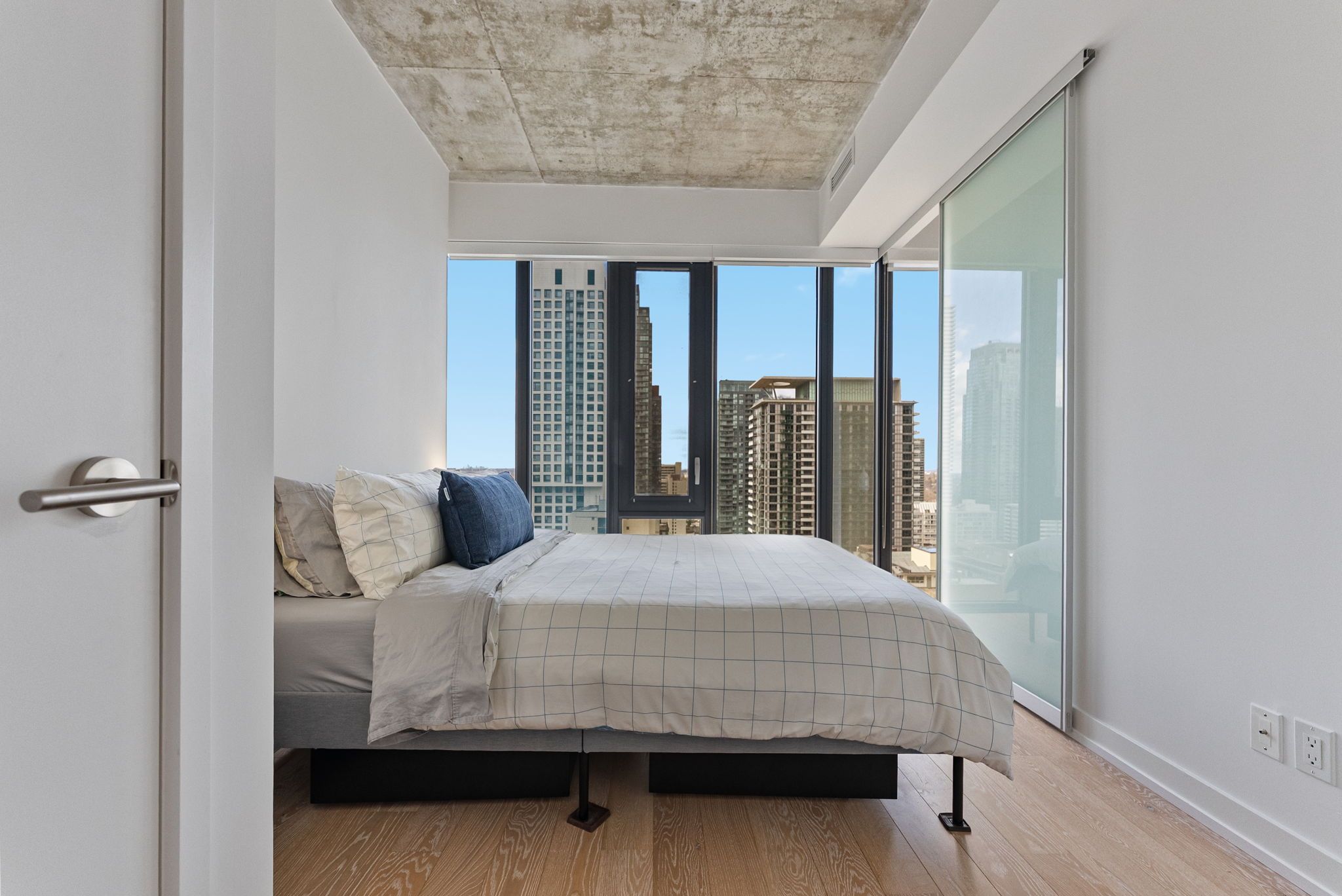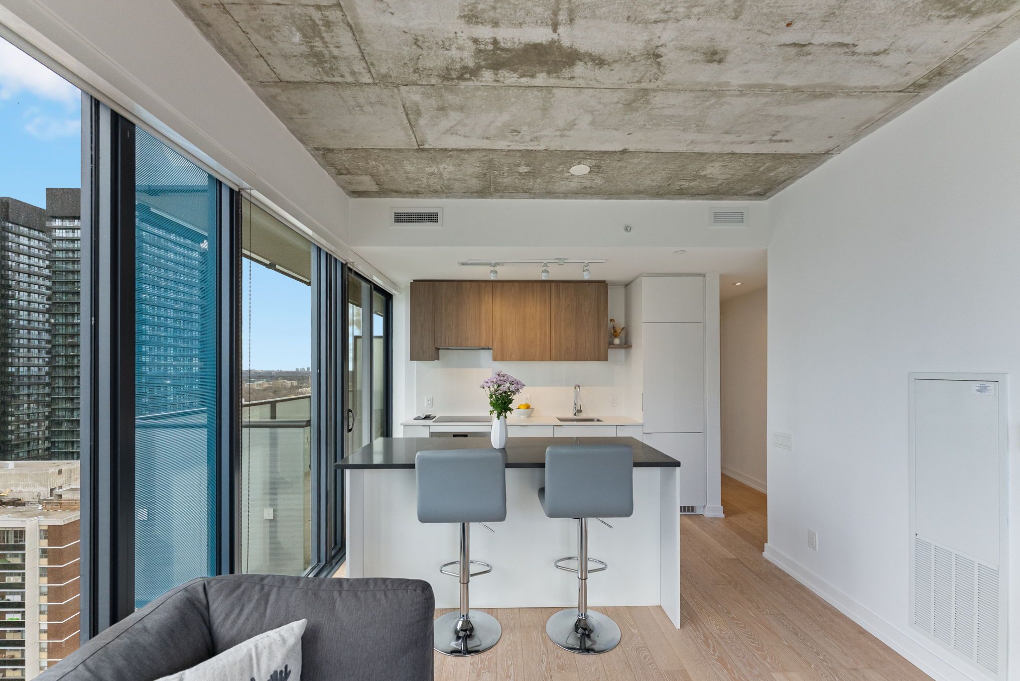 Suite 2303 at 161 roehampton avenue presents an exceptional opportunity to own a truly elevated corner residence in the heart of yonge and eglinton; one of midtown toronto's most dynamic and well-connected neighbourhoods. Developed by the acclaimed freed developments in 2020, the building is surrounded by stately multi-million dollar homes and set within a mature, highly desirable community known for its outstanding schools, including eglinton junior public school, hodgson middle school, and north toronto collegiate institute. The new eglinton crosstown lrt is steps from your door, yonge-eglinton ttc station is just minutes away, and downtown toronto is a short 15-minute subway ride away. Suite 2303 is a meticulously maintained corner unit offered by its original owner, boasting over $25,000 in developer and custom upgrades. Spanning 681 square feet of interior space plus an 80 square foot open balcony, the suite features floor-to-ceiling glass on two walls, exposed concrete ceilings, and unobstructed north and west exposures delivering abundant natural light and breathtaking sunset views. 5" hardwood flooring, a custom-built island, blackout roller blinds in both bedrooms, and 3% shade rollers throughout the living areas complete the finishes. Both bedrooms are true exterior rooms, and the primary features a four-piece ensuite. Building amenities include the cave games room with golf simulator, fitness centre, eighth-floor outdoor pool, spa with sauna, and two rentable guest suites. One parking space and one storage locker included. This is a rare opportunity to own a beautifully upgraded corner suite with sunset views in one of midtown toronto's most established communities.