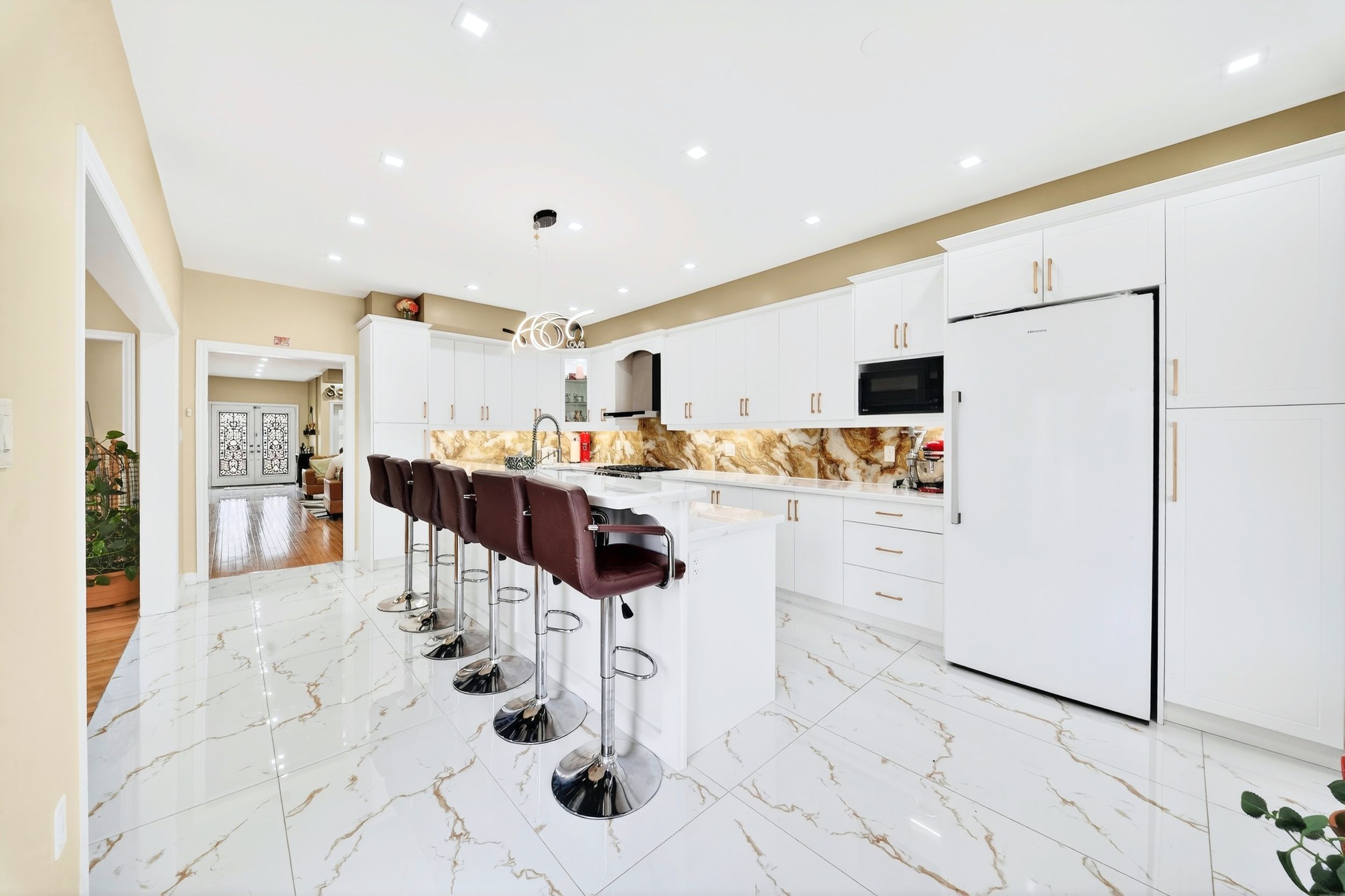 • Large principal rooms with 9-ft ceilings and updated designer kitchen.