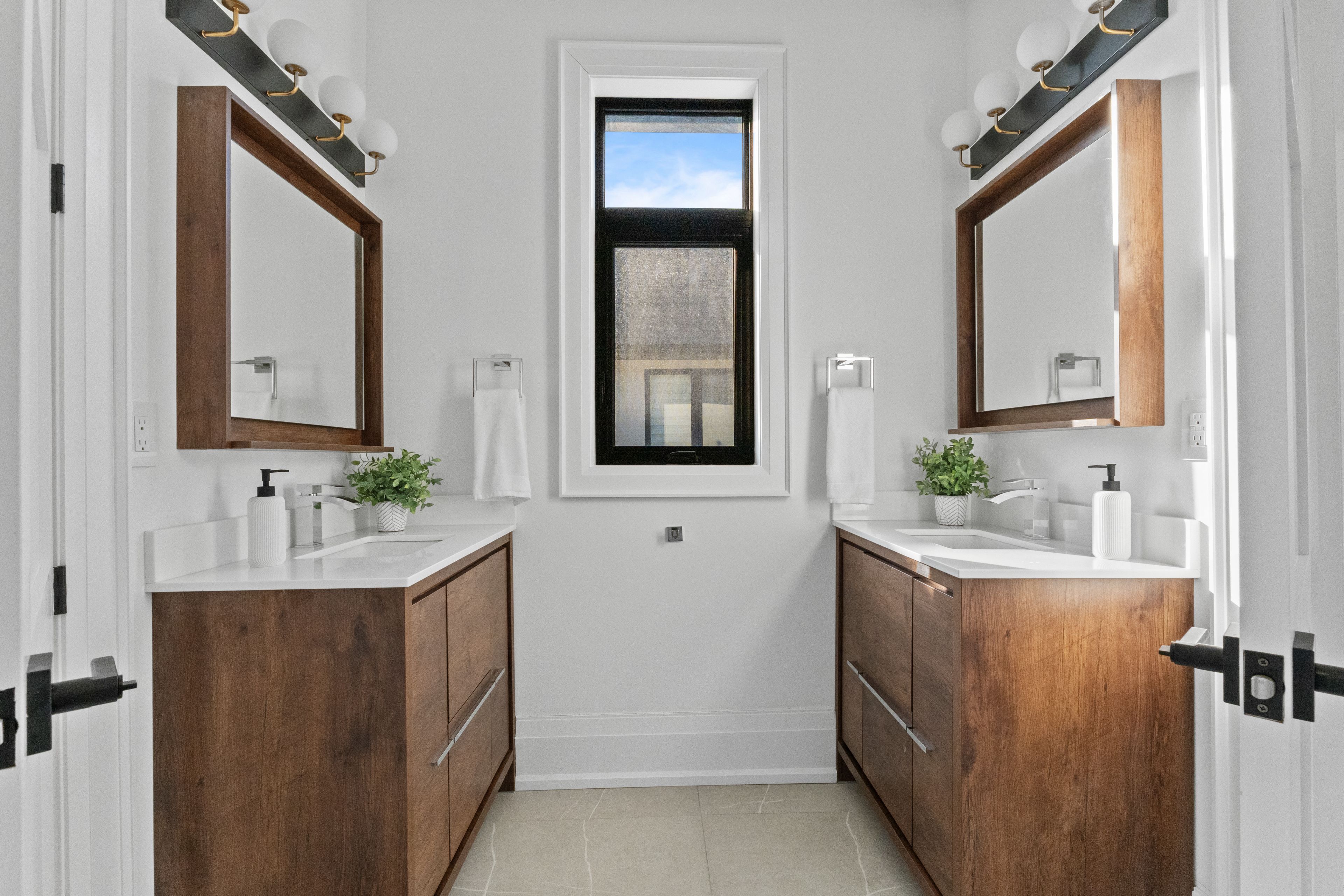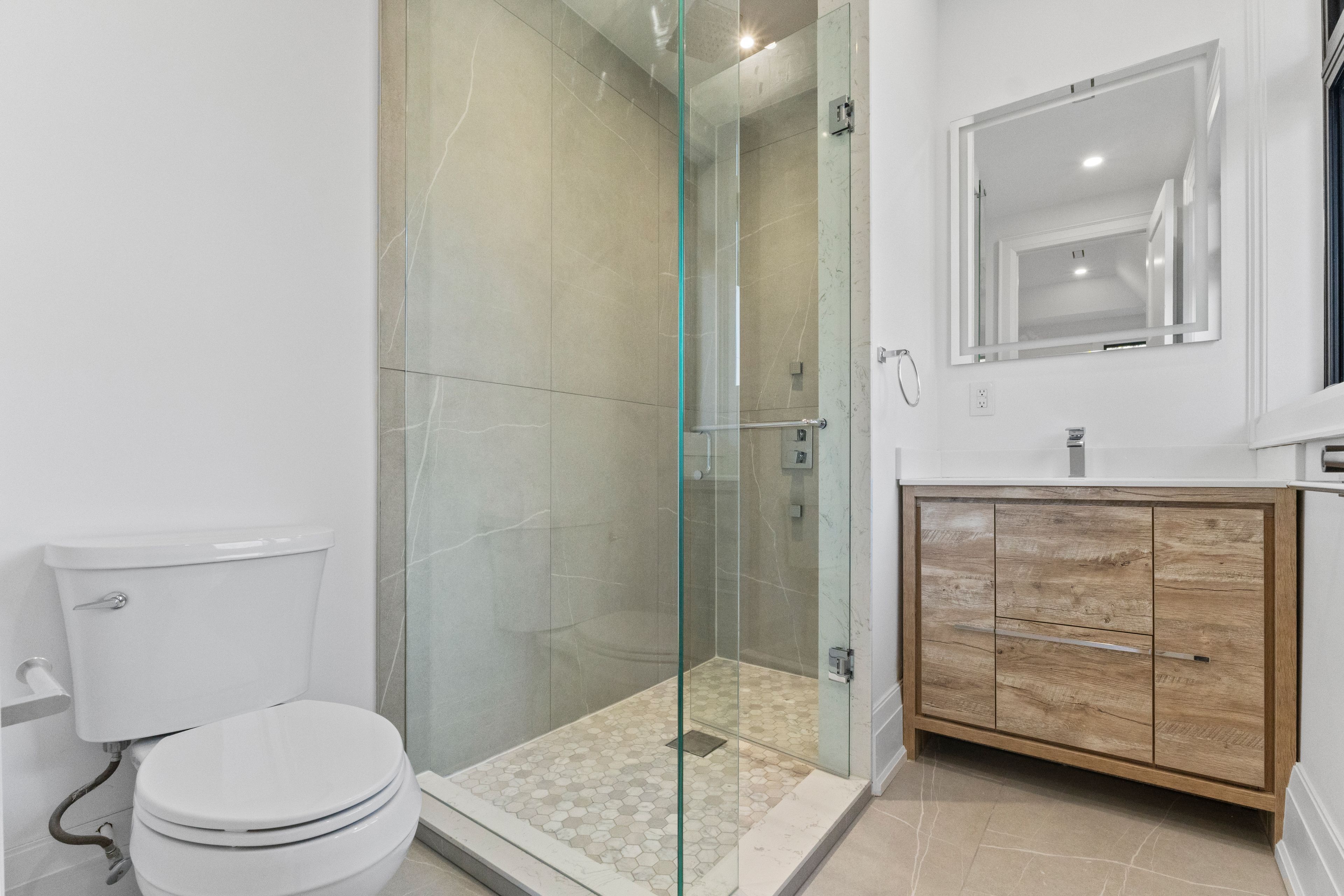 • Grand foyer featuring dramatic marble-look porcelain and walnut accents.