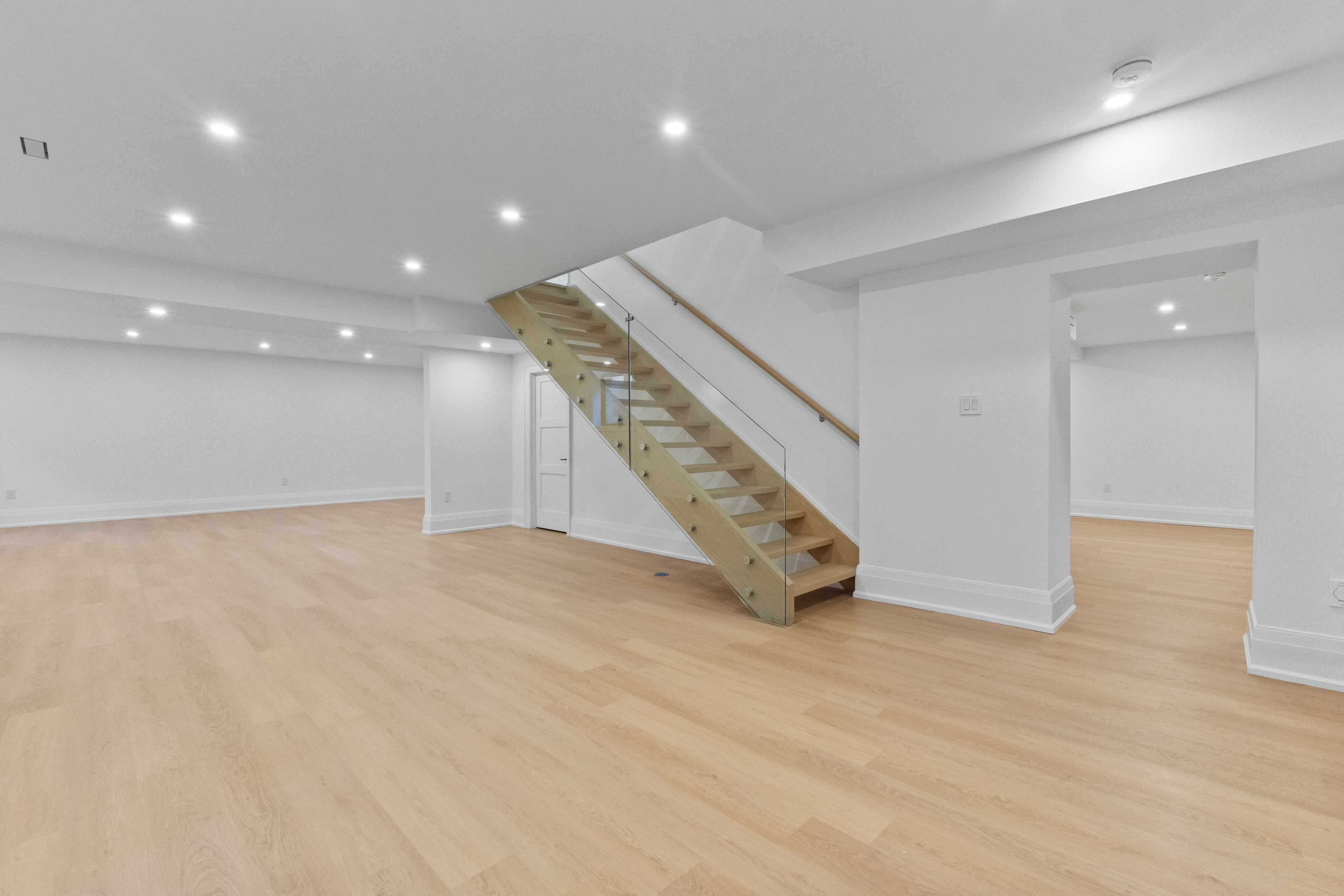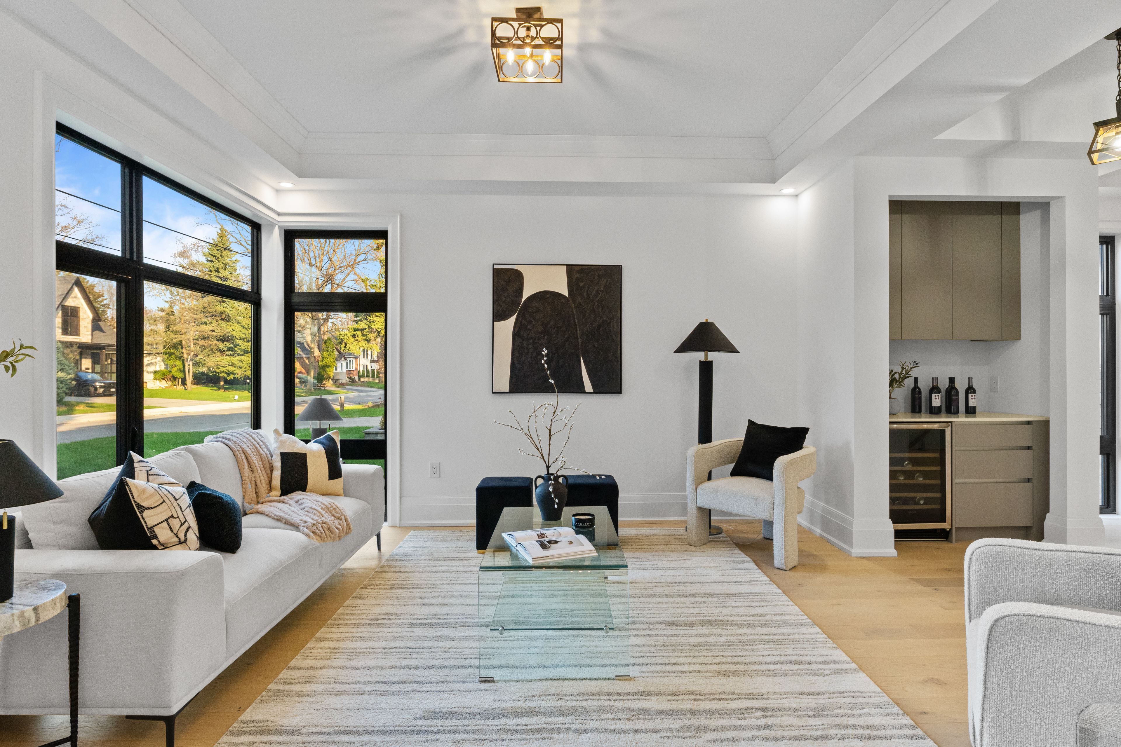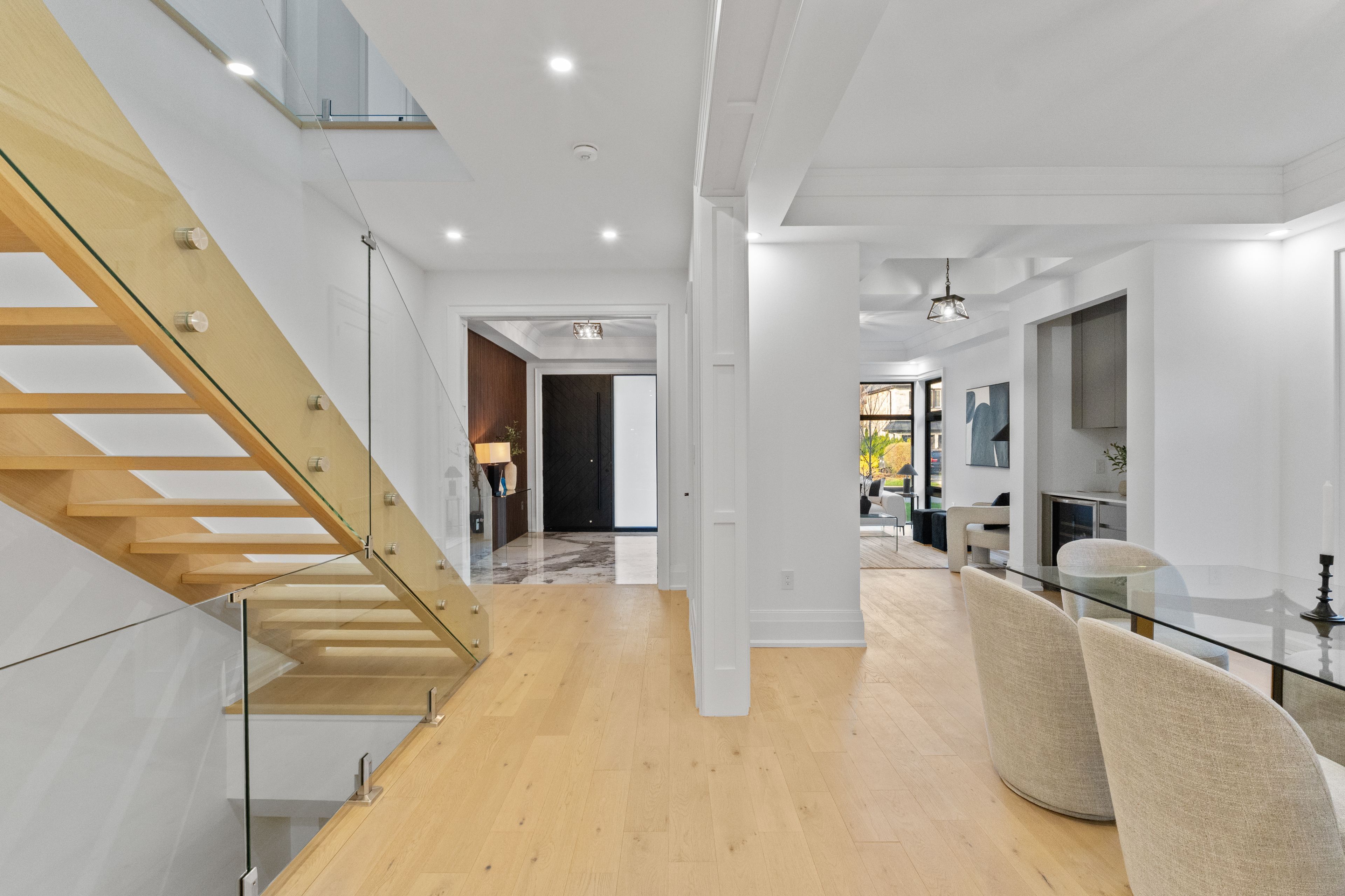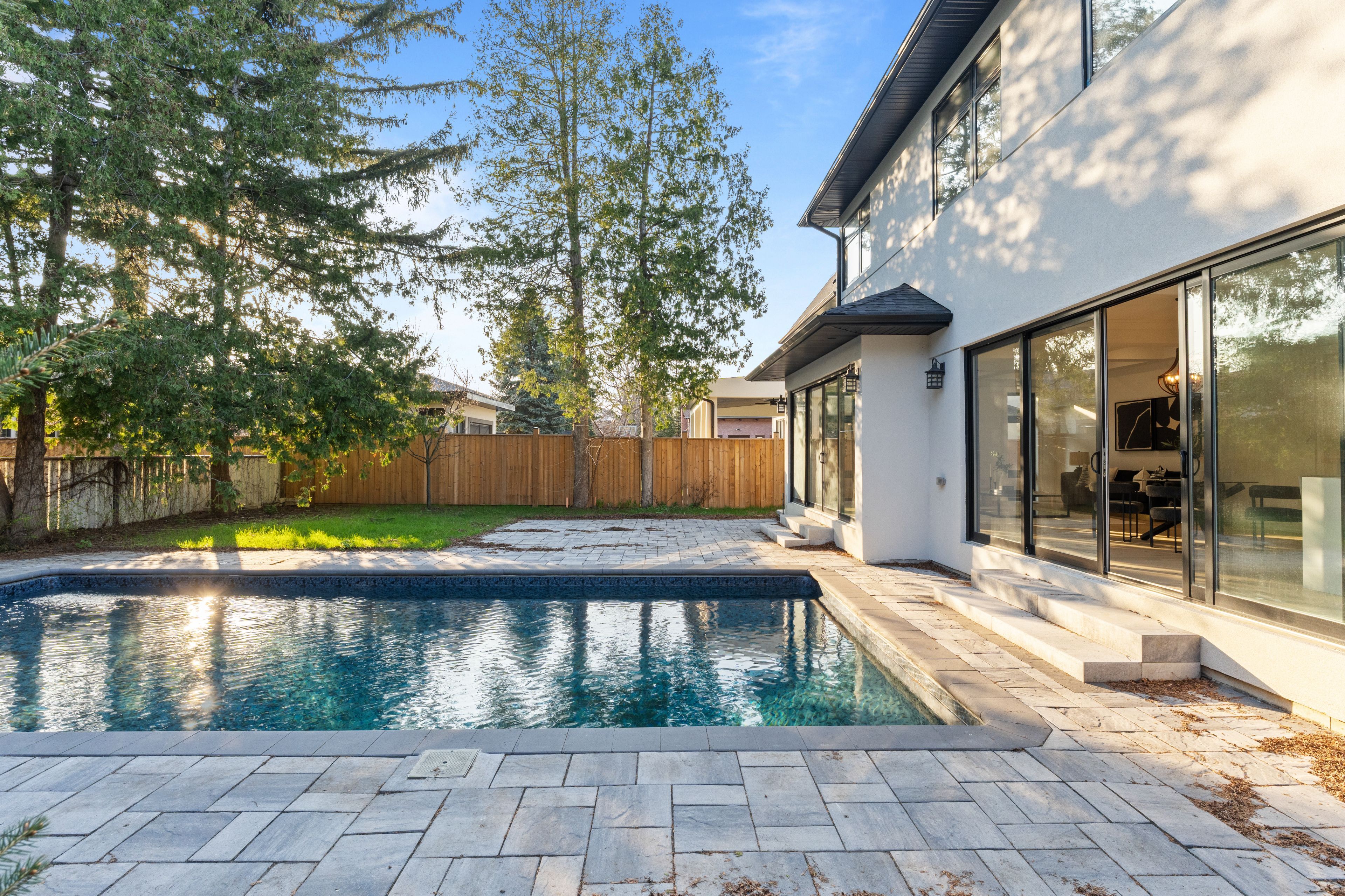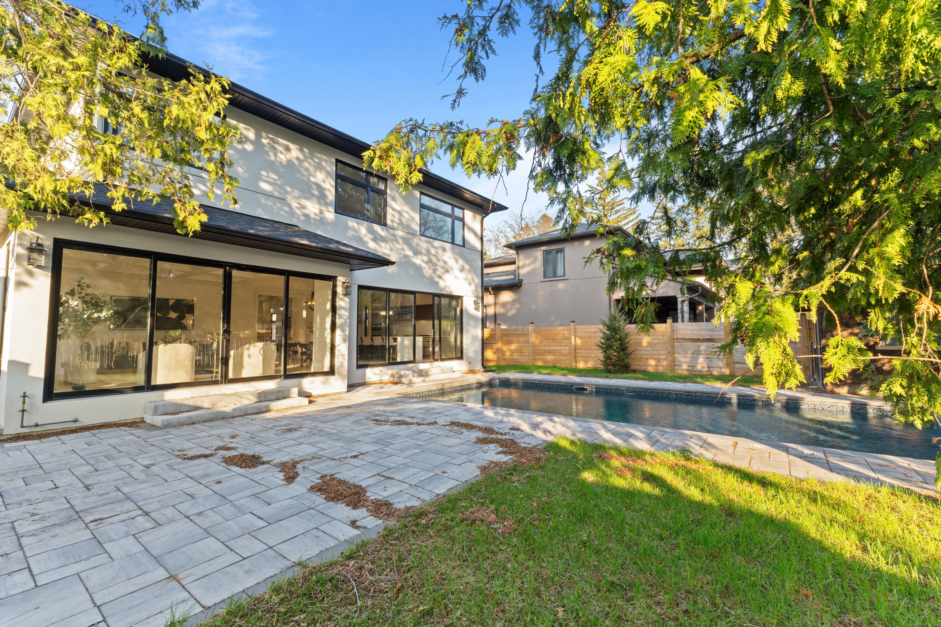 Located in one of mississauga's most sought-after enclaves, 1610 kenmuir ave is a bespoke custom residence offering nearly 5,800 sf of finished living across three impeccably crafted levels. Behind a striking modern facade, the home announces itself with a grand foyer dressed in dramatic marble-look porcelain and a slatted walnut accent wall that sets the tone for what unfolds throughout. Pot lighting cascades across every level, illuminating every room. The formal living room is a study in refined restraint, anchored by a built-in beverage bar and wine fridge, while the open-concept kitchen, breakfast area, and family room form the true heart of the home. A linear fireplace wrapped in floor-to-ceiling wood slat millwork commands the family room, as the chef's kitchen dazzles with a waterfall quartz island, integrated appliances and custom cabinetry. Sliding doors from both the family room and kitchen open directly to the stone patio and shimmering in-ground pool, where entertaining becomes effortless and every season becomes an occasion. Above, the primary suite is a sanctuary unto itself, featuring coffered ceilings, a custom walk-in closet with organizers, and a spa-calibre ensuite with a freestanding soaker tub, oversized rain shower, and a dual vanities glowing beneath warm sconce lighting. Four additional bedrooms, each with closet organizers, and a dedicated upper laundry complete the second floor with quiet intention. The lower level delivers on lifestyle with a sprawling recreation room, a versatile media room ready to be transformed to suit your vision, a wet bar, and generous storage throughout. Outside, mature trees and a cedar-fenced yard frame the pool and stone patio in natural privacy. Perfectly situated moments from the waterfront trails of lake ontario and the vibrant village energy of port credit, lakefront promenade park, sherway gardens, and seamless qew access.