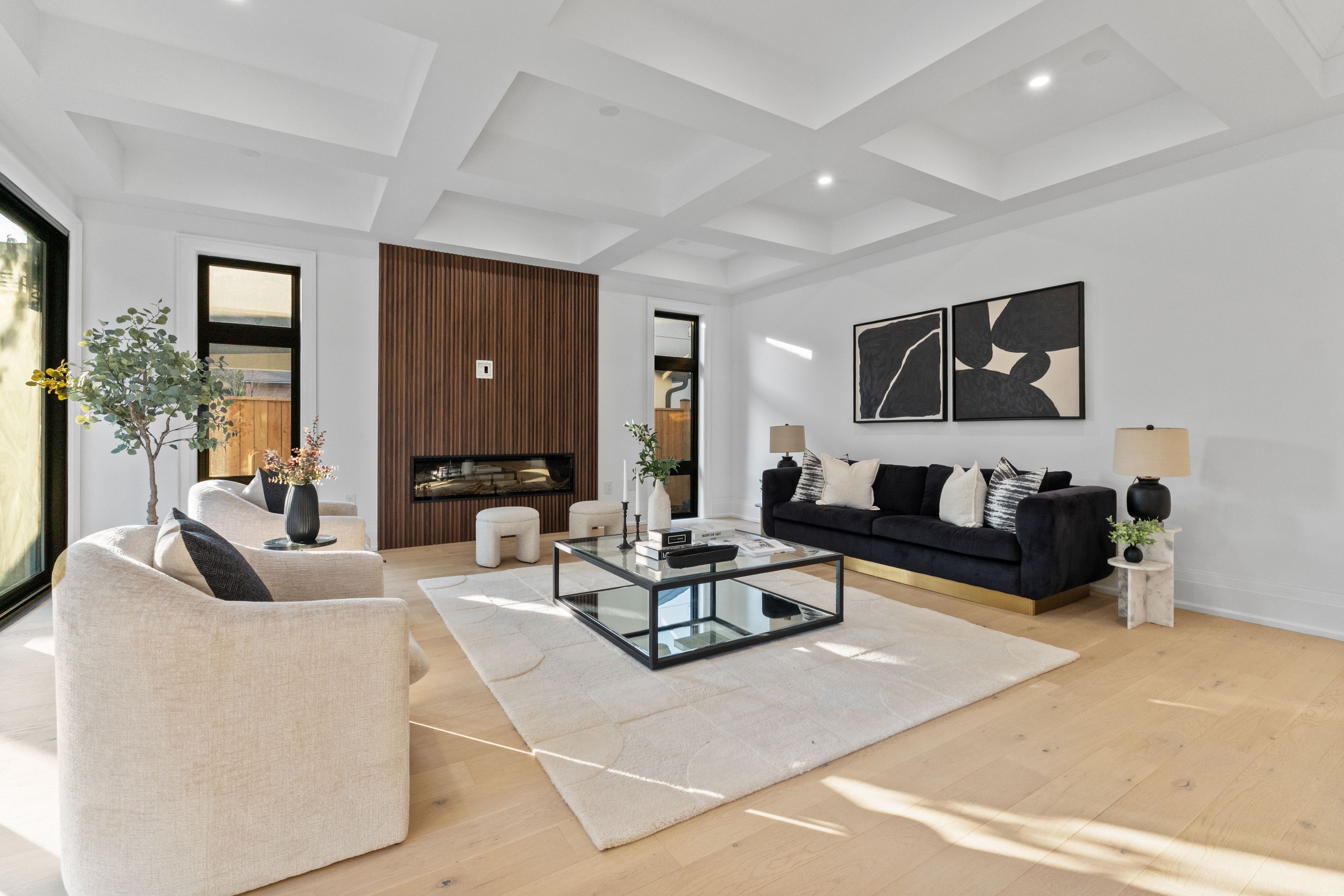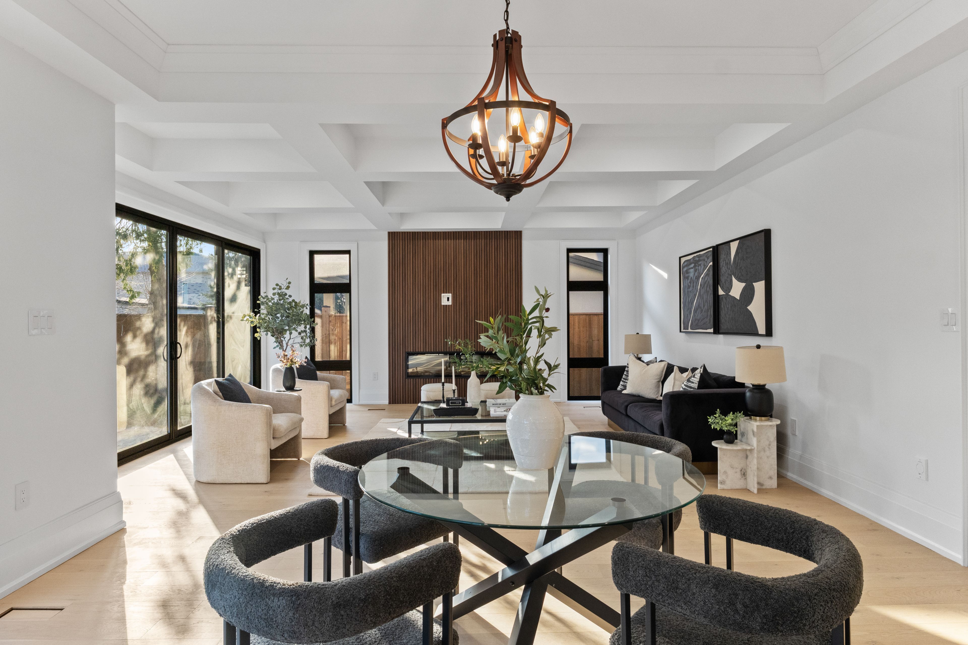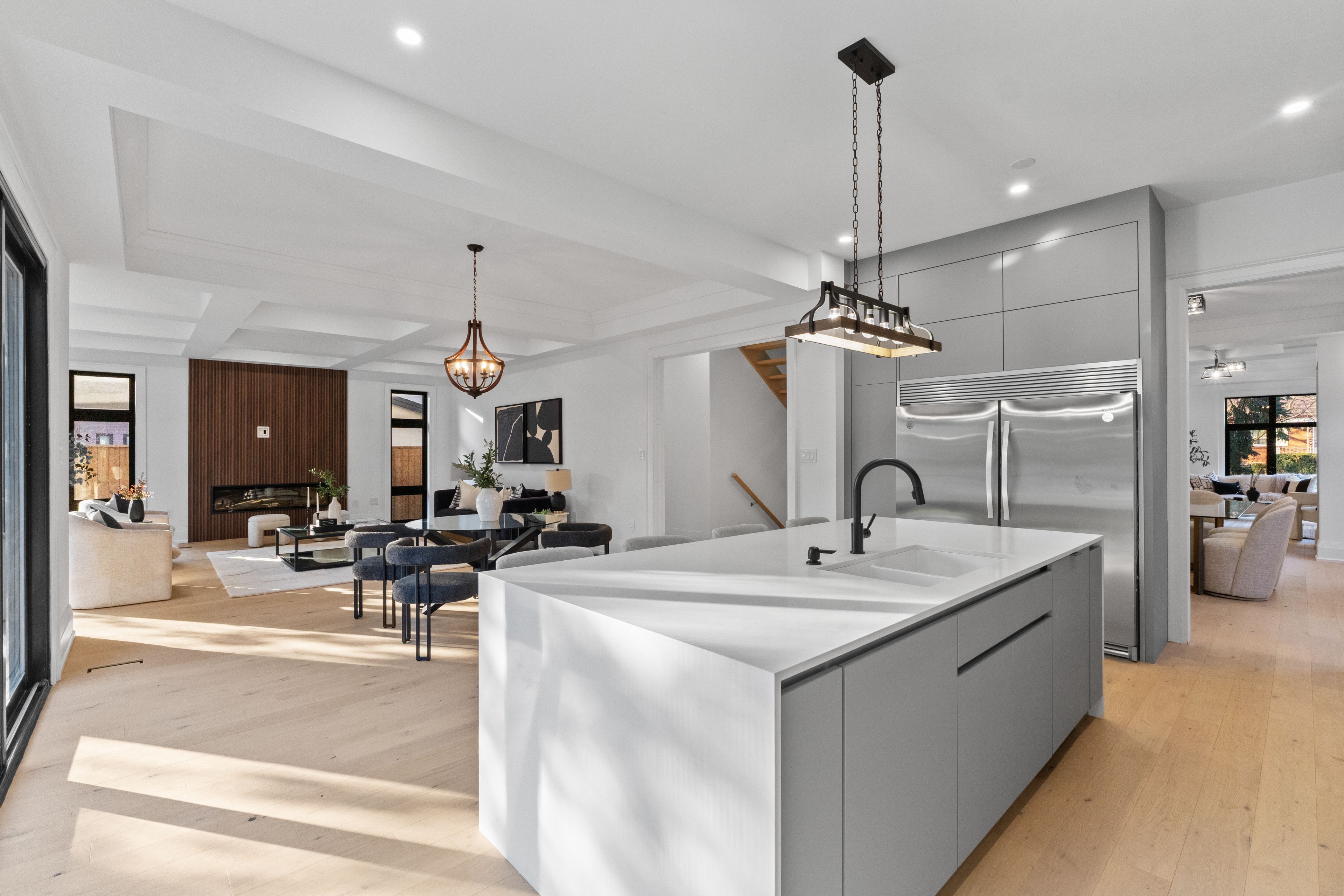 • Open-concept kitchen and family room with linear fireplace and quartz island.