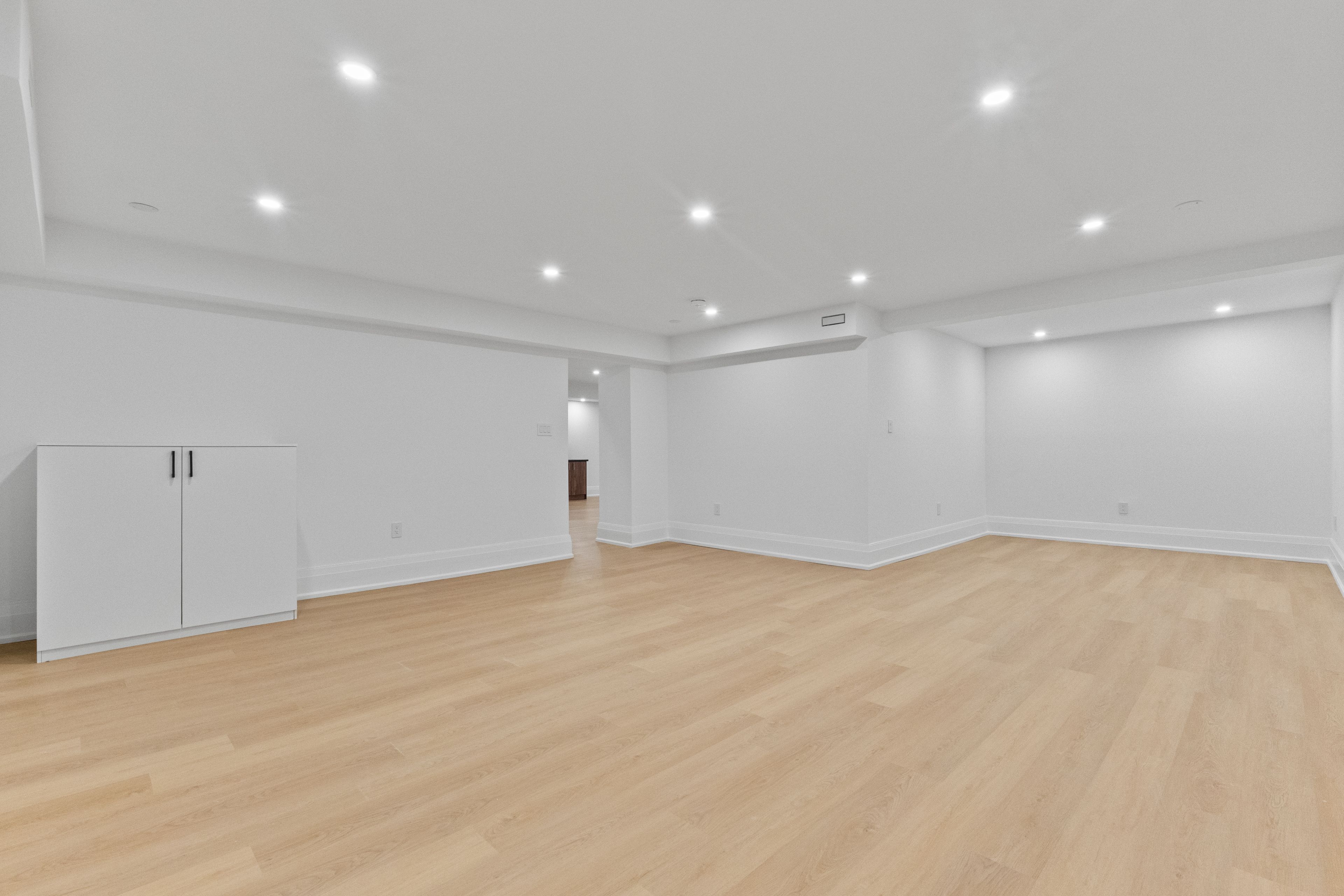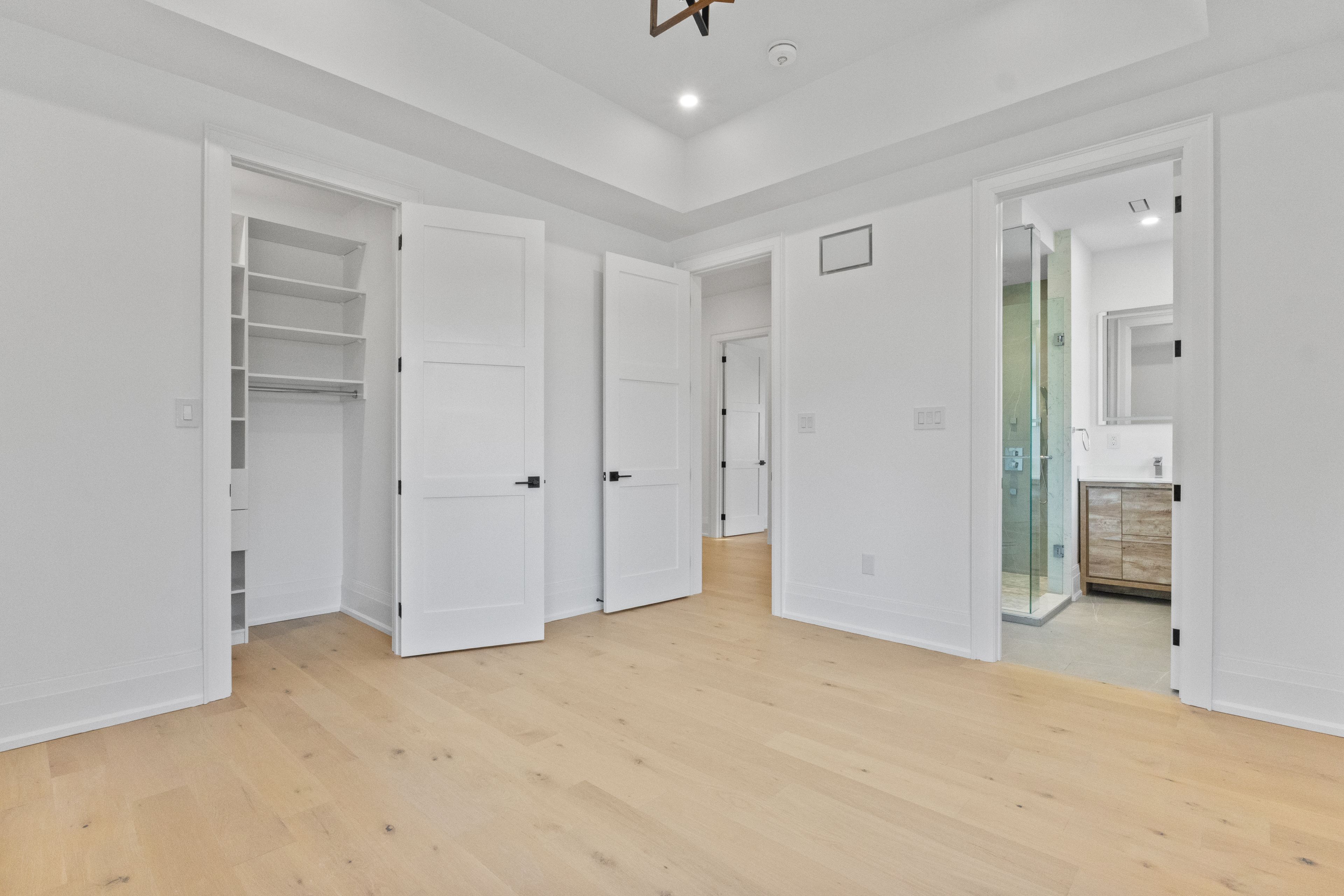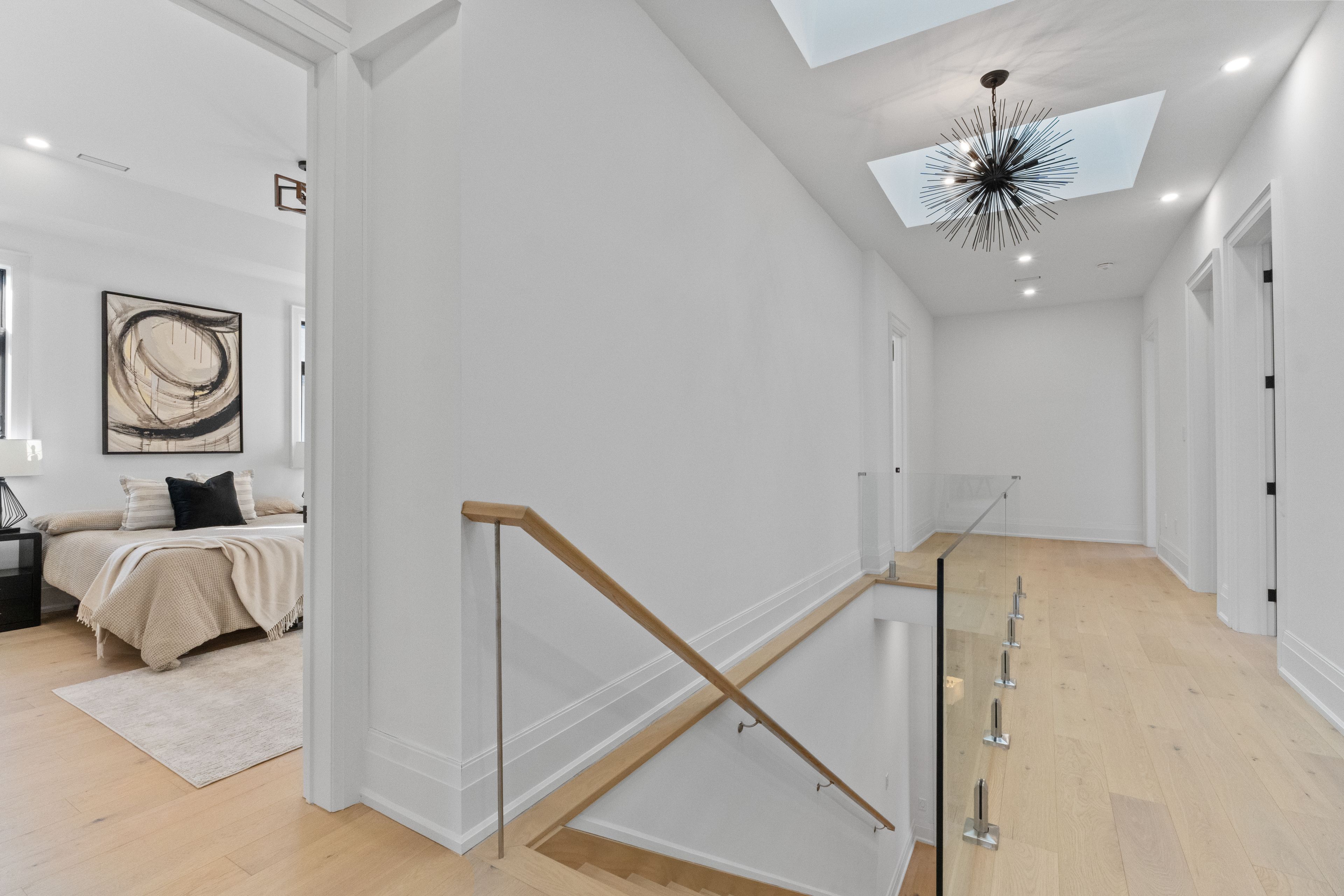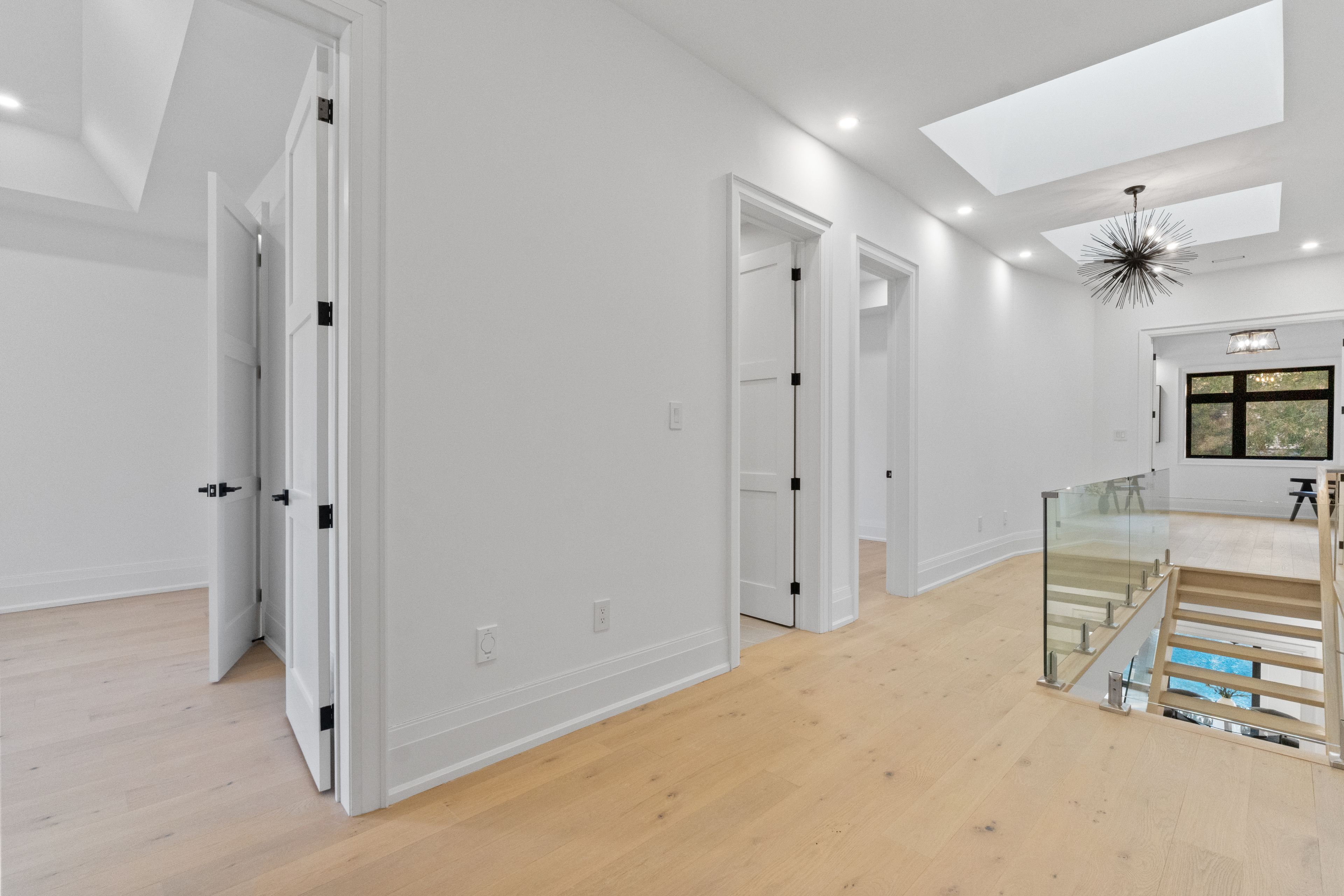 • Open-concept kitchen and family room with linear fireplace and quartz island.