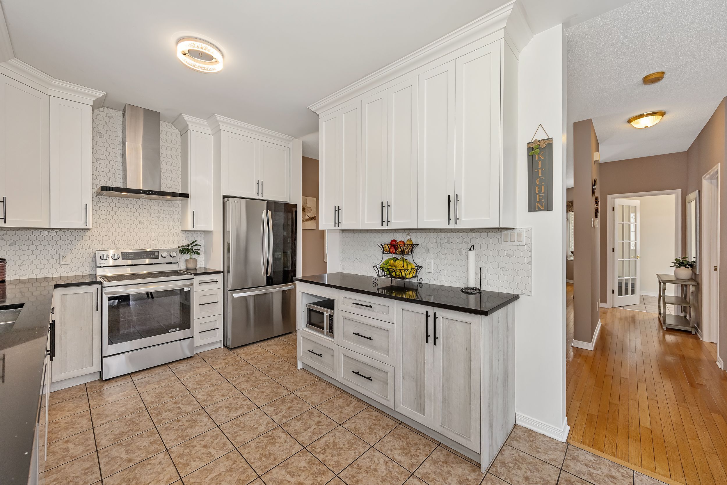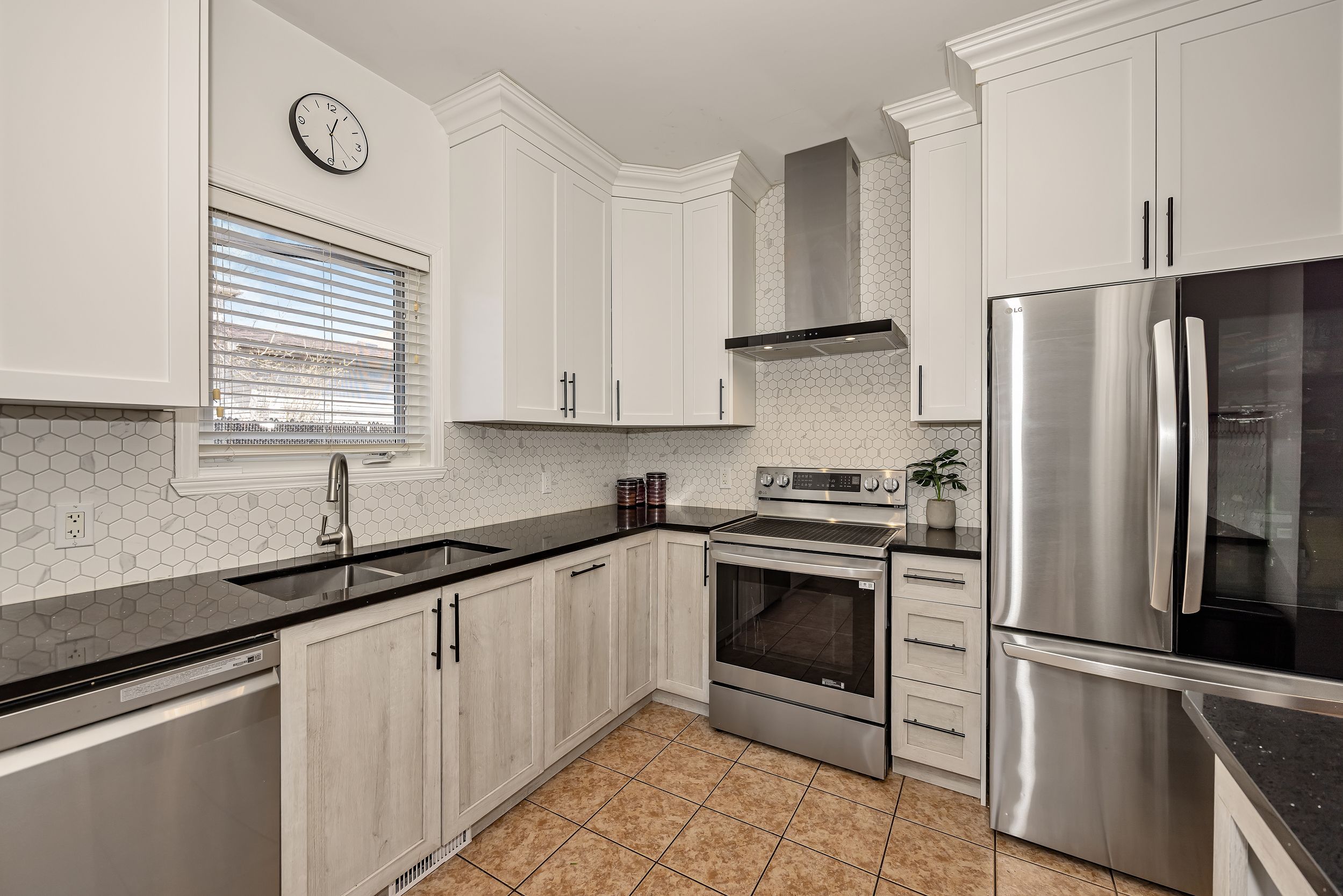 • Renovated kitchen featuring stone countertops and stainless steel appliances.