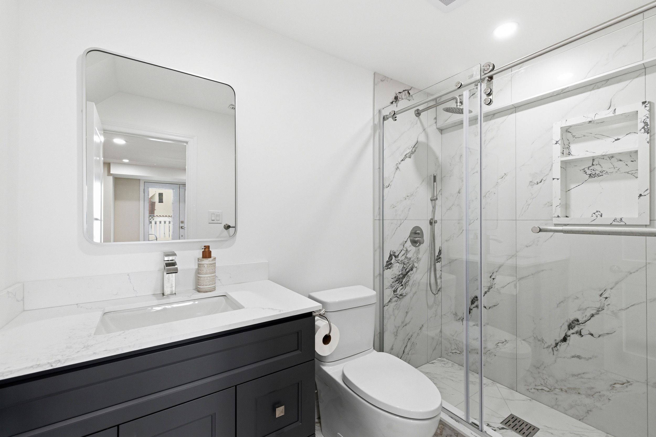 • Contemporary kitchen with quartz countertops and stainless steel appliances.