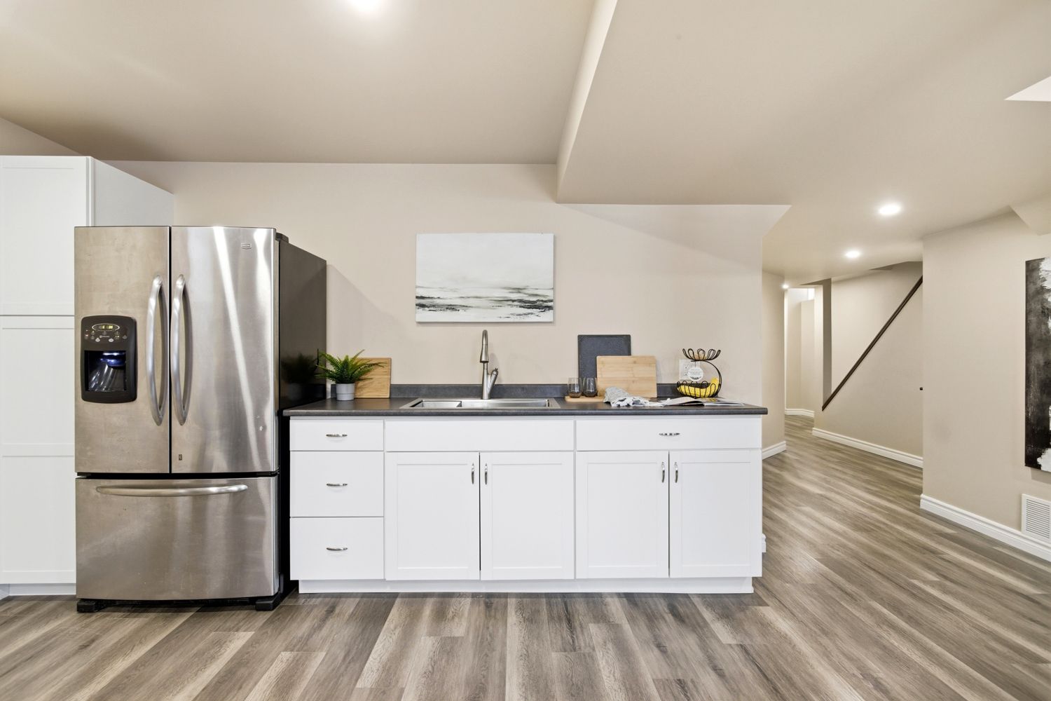 • Open concept kitchen with stone counters and stainless steel appliances.