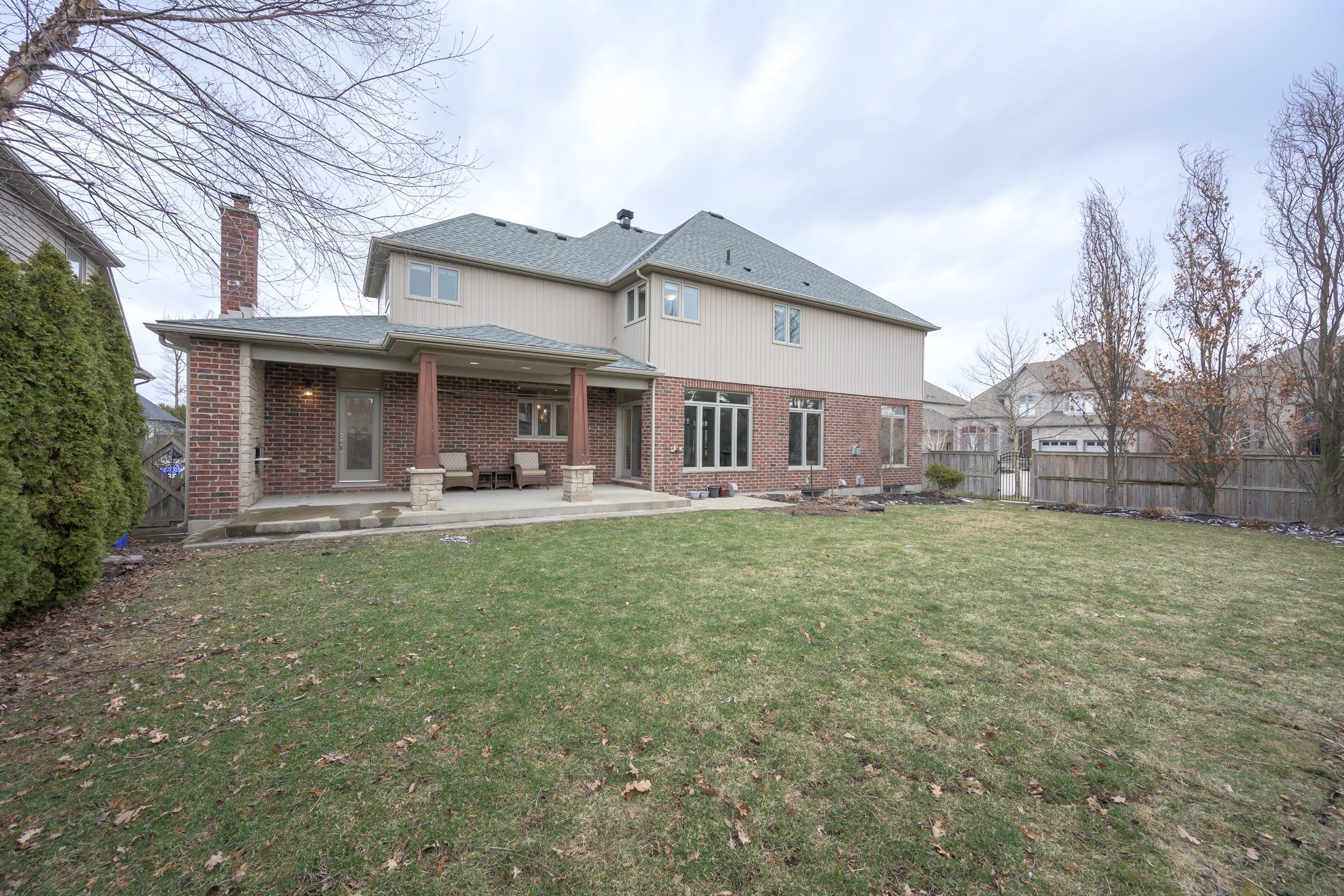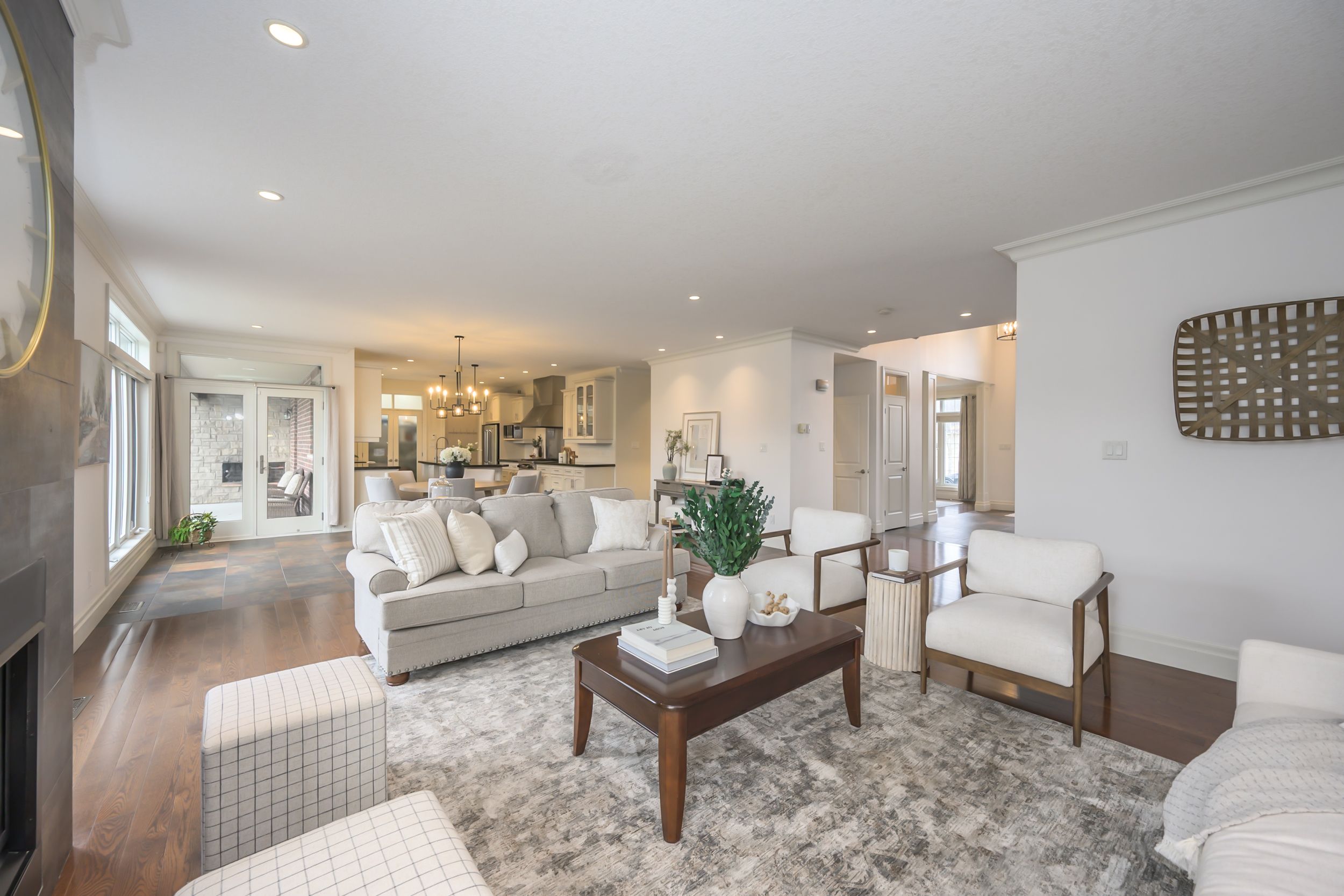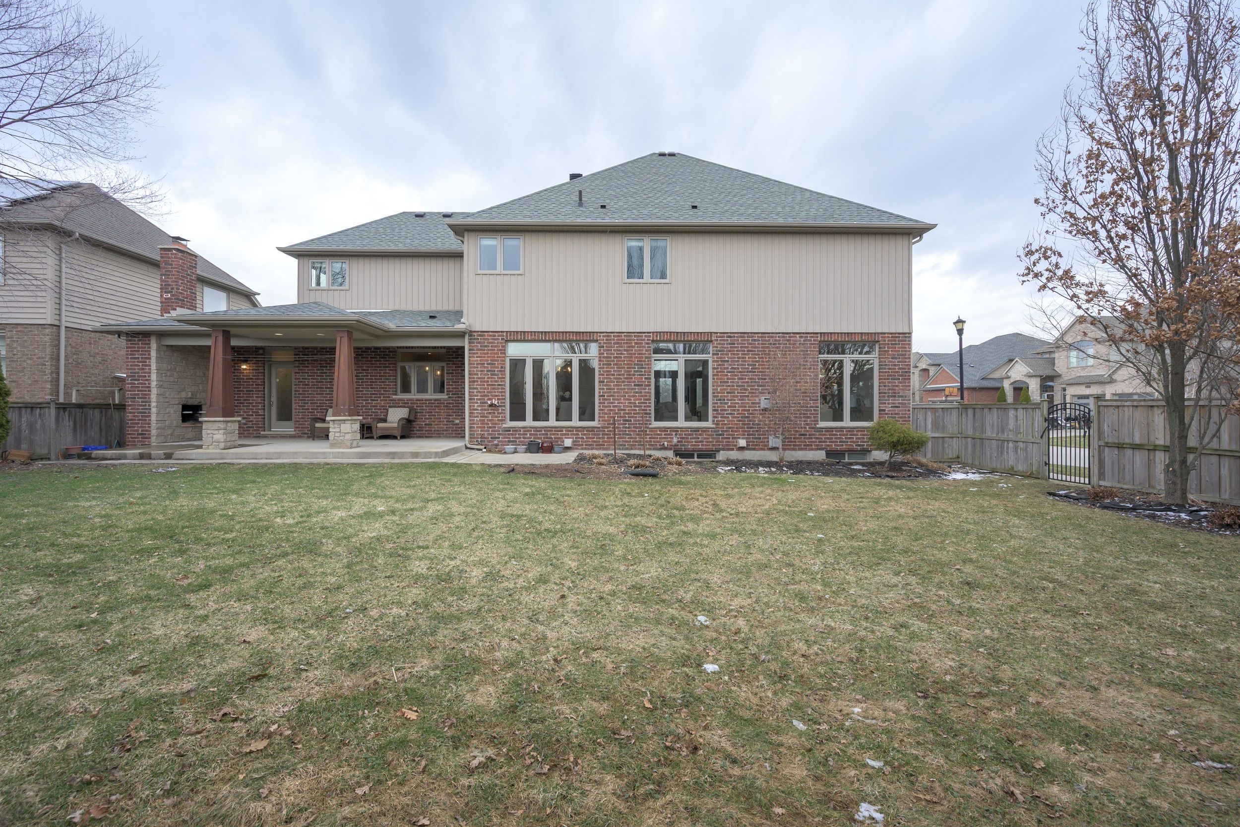 A rare combination of scale, presence, and setting begins at the covered front porch, where substantial columns, stonework, and a stately entry create an immediate sense of arrival. A triple car garage and wide driveway reinforce the home's presence from the street. Inside, the two-storey foyer rises with natural light, framed by an arched opening and statement lighting-introducing the volume and architectural detail that define this home. The main level is anchored by expansive principal rooms that feel both open and intentional. Rich hardwood, substantial crown moulding, and custom millwork carry throughout, while a wall of windows across the back of the home draws in natural light and connects seamlessly to the outdoor living space. The living area is centred around a fireplace, with clear sightlines into the kitchen and dining spaces-designed for both everyday function and larger gatherings. The kitchen delivers on both presence and practicality, with extensive cabinetry, a large centre island with prep sink, gas range, and a walk-in pantry. A wet bar/servery enhances flow to the dining area. A private office is located off the foyer, along with convenient main floor laundry. Garden doors lead to a covered patio with an integrated wood-burning fireplace-an outdoor space that feels private and purposeful. Upstairs, a wide landing overlooks the foyer below. Four well-proportioned bedrooms include a primary suite with space to unwind, complemented by an ensuite with soaker tub, glass shower, double vanity, and skylight. The fully finished lower level adds flexibility with a large media/games room, fireplace, bedroom, full bath, and workshop.. A separate staircase from the garage supports multi-generational or private use. A fully fenced, pool-sized yard and wide corner lot offer added frontage, privacy, and a more open streetscape, set in wickerson heights at the edge of byron village. Nearby trails, thames river, west 5, riverbend golf & hunt club golf.
