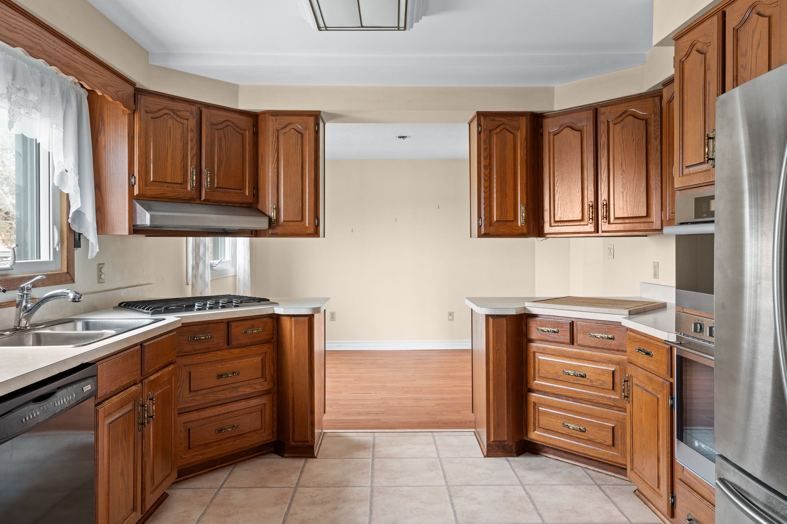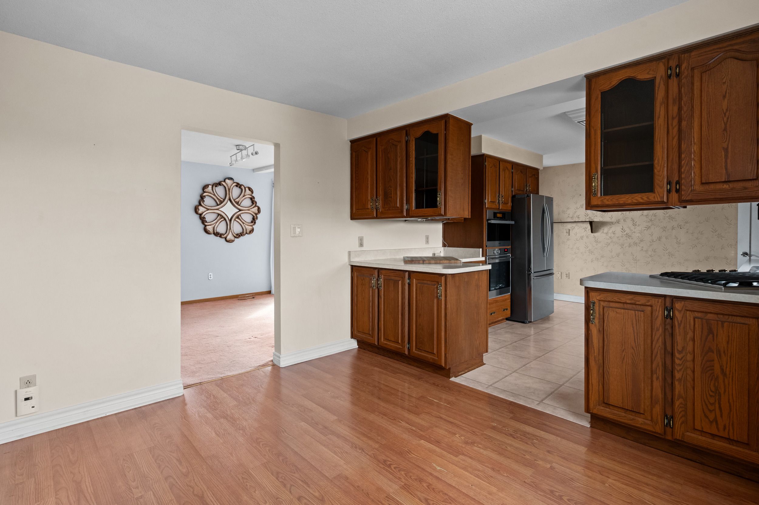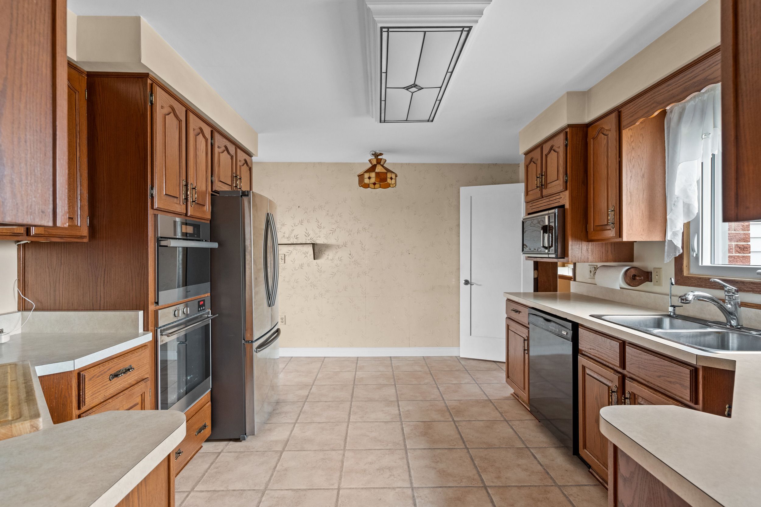 • Bright living room and functional kitchen with built-in steam and conventional ovens.