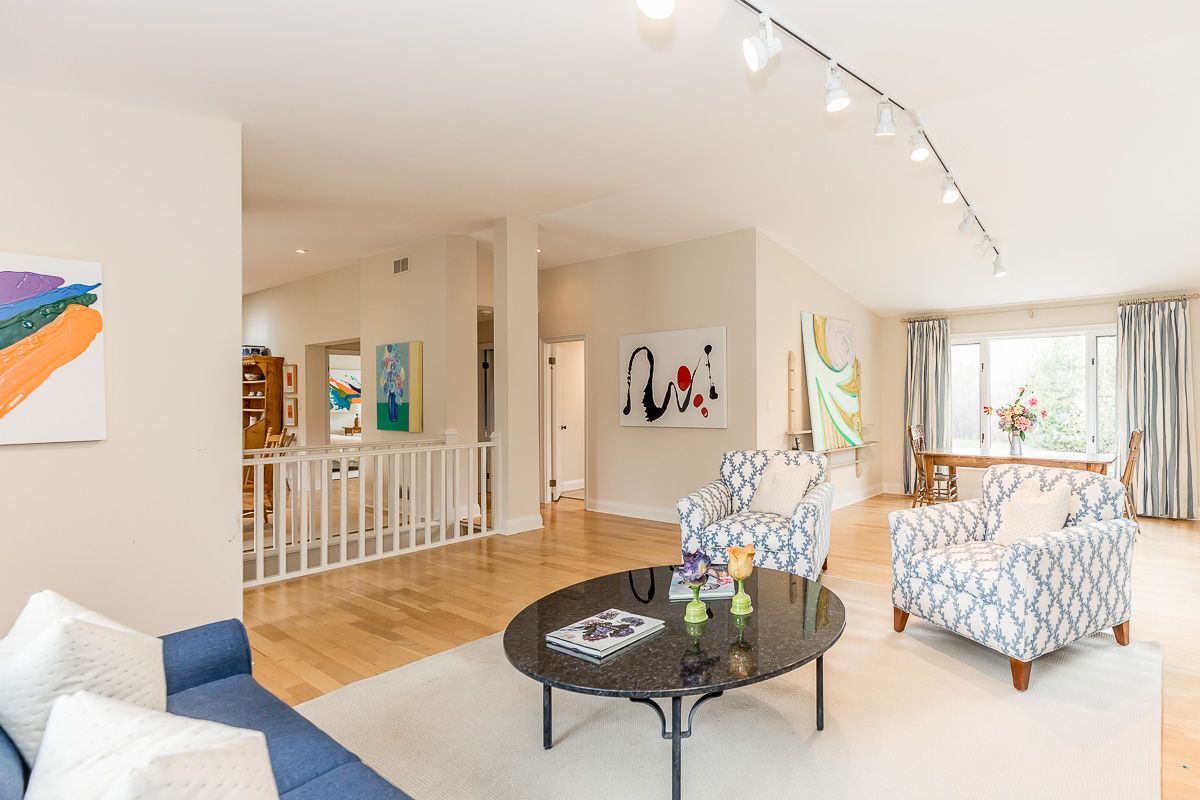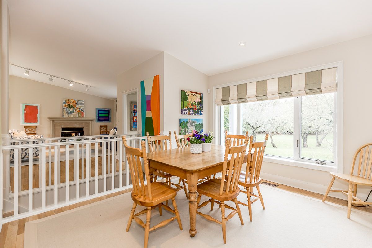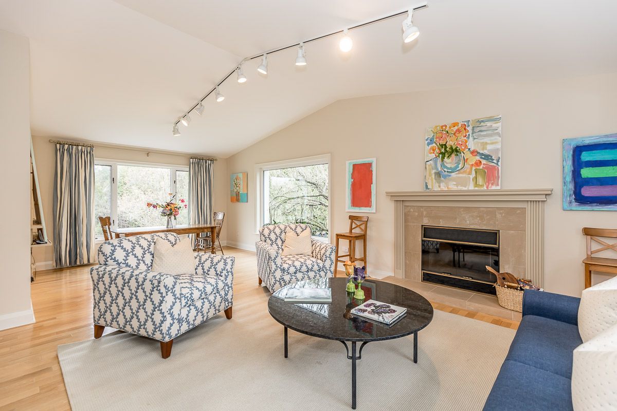 • Cozy living room with a wood-burning fireplace and expansive windows.