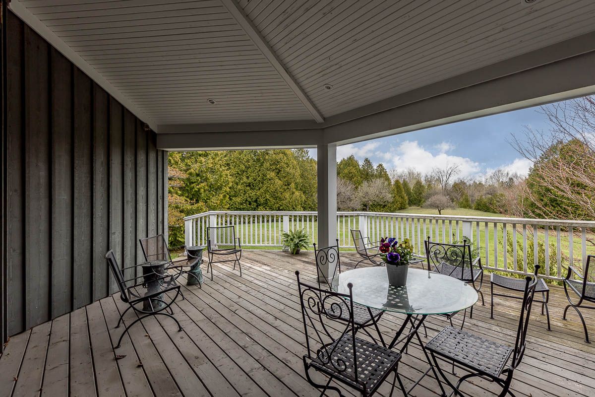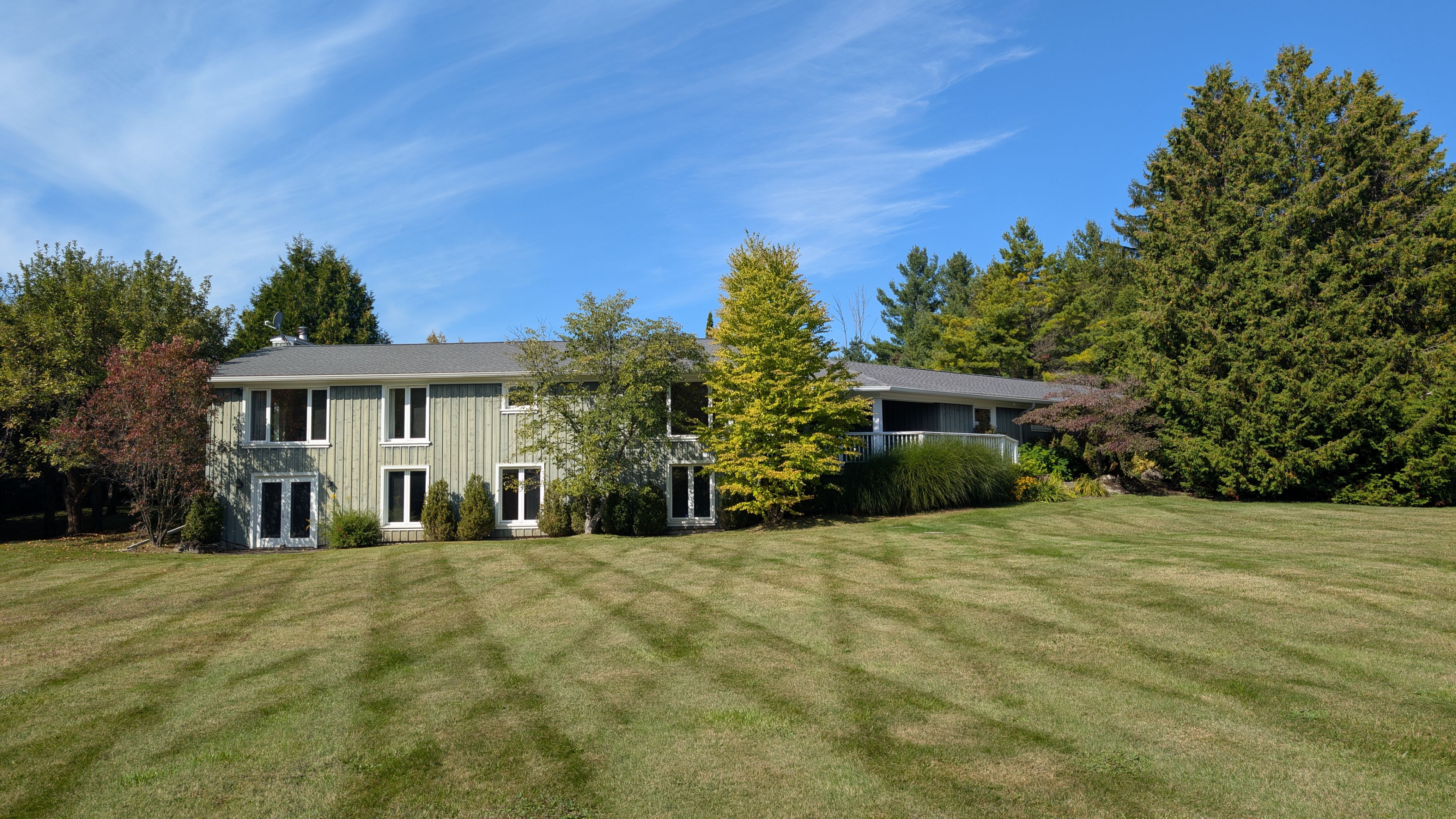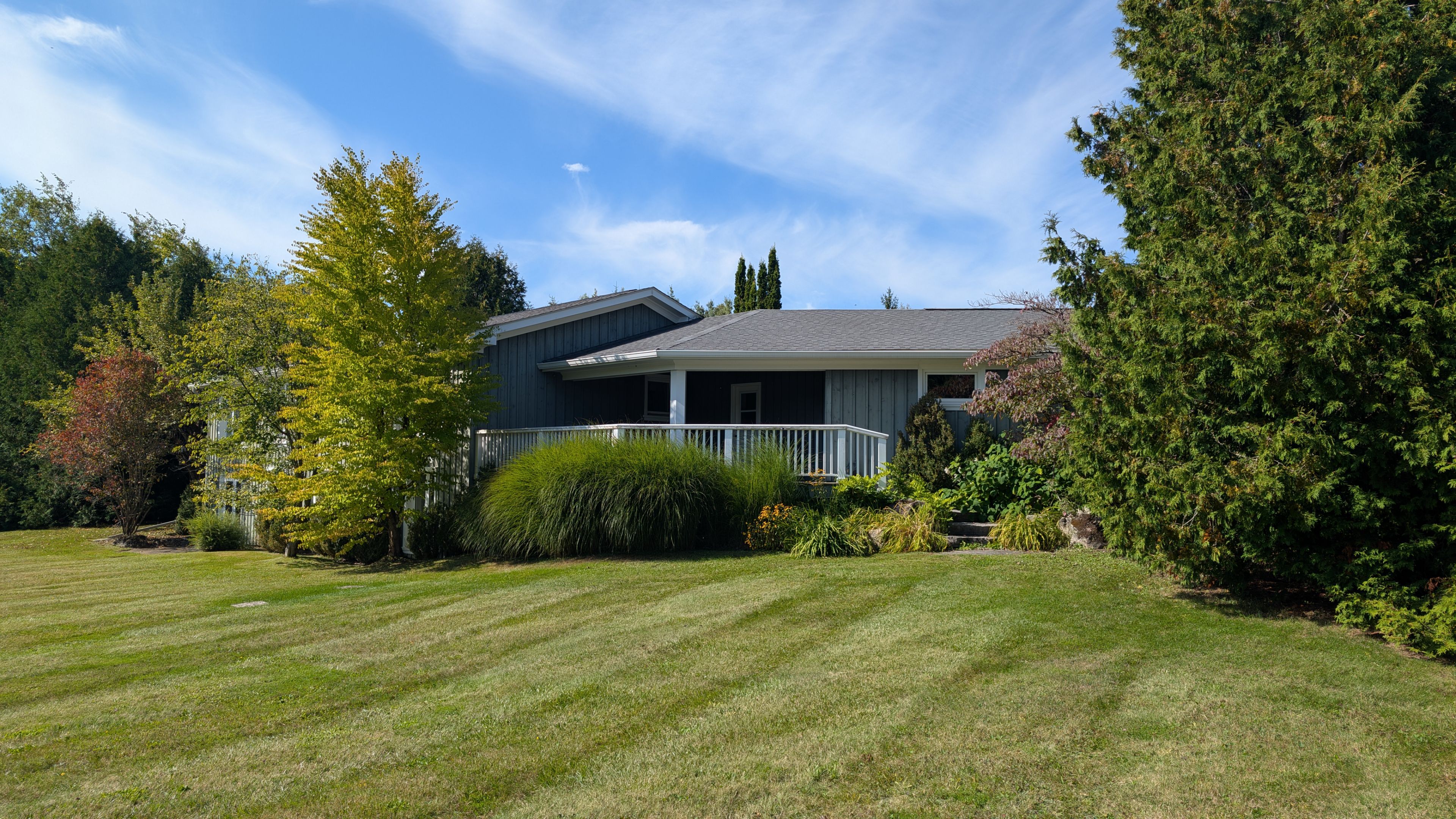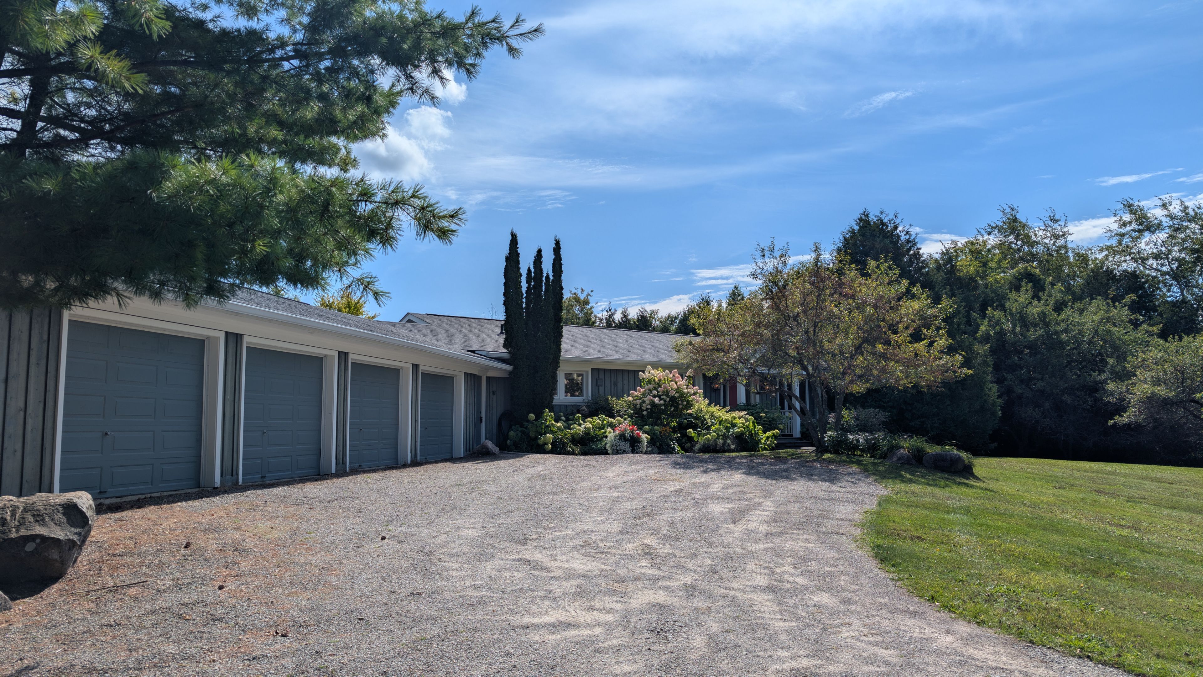 This bright sun-filled bungalow offers the perfect balance of comfort, charm, and quiet privacy! Set on 3. 76 acres of peaceful countryside, with beautiful vaulted ceilings and an open-concept layout, the main floor feels spacious and inviting, ideal for everyday living and family gatherings. The living room features a cozy wood-burning fireplace and expansive windows with lovely views of the property. A spacious kitchen with a dedicated eating area provides plenty of room to create your dream culinary space. Step out to a private, covered deck, a quiet spot to enjoy morning coffee or an evening breeze. The mudroom with built-in hooks and cupboards for easy organization connects the home to an attached 4-car garage. Downstairs, the fully finished lower level offers a large family room with a gas fireplace, built-in entertainment unit, and walk-out access to a level lawn surrounded by trees perfect for kids, pets, or simply enjoying the outdoors. Well-maintained and full of potential, this is a wonderful opportunity to create your ideal family home in a peaceful, private setting.