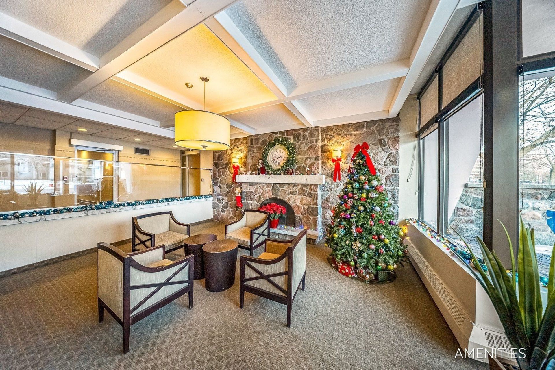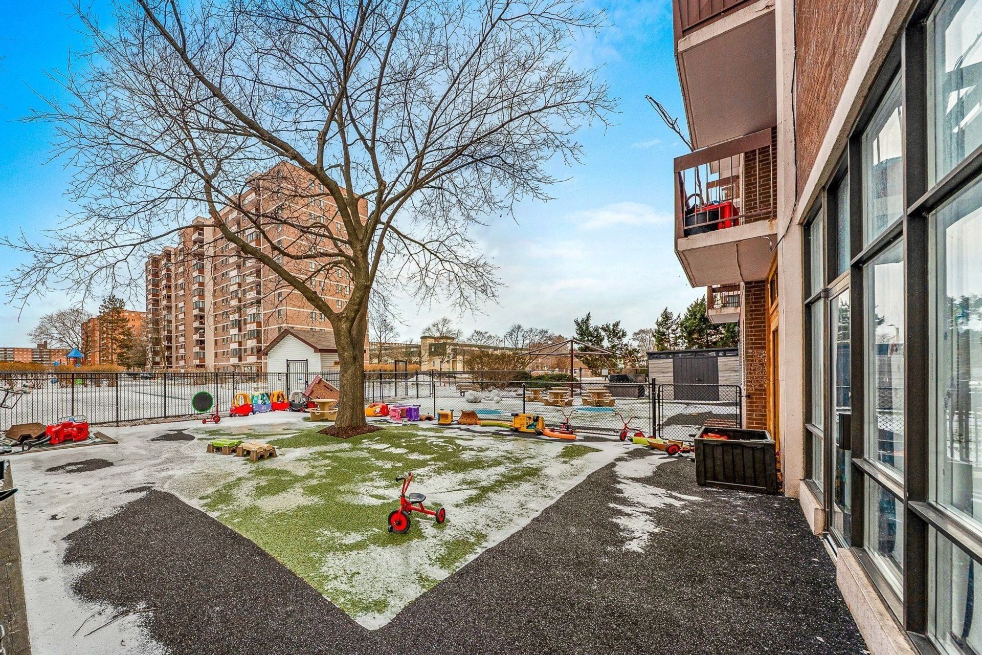 • On-site amenities include exercise room, sauna, and childcare center.