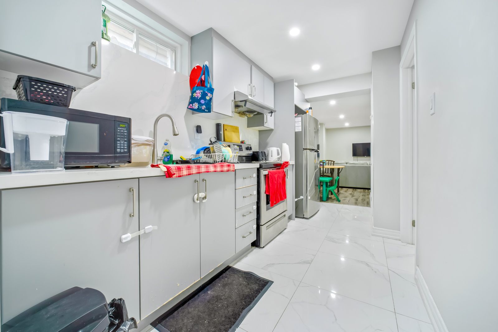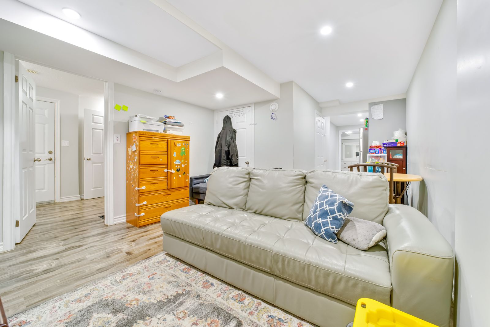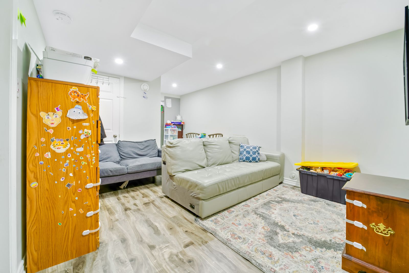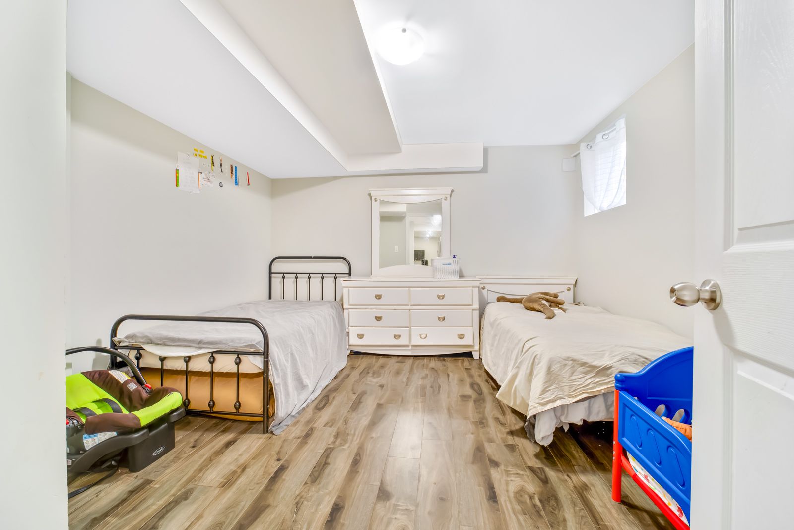• Finished basement includes two separate apartments with large windows.