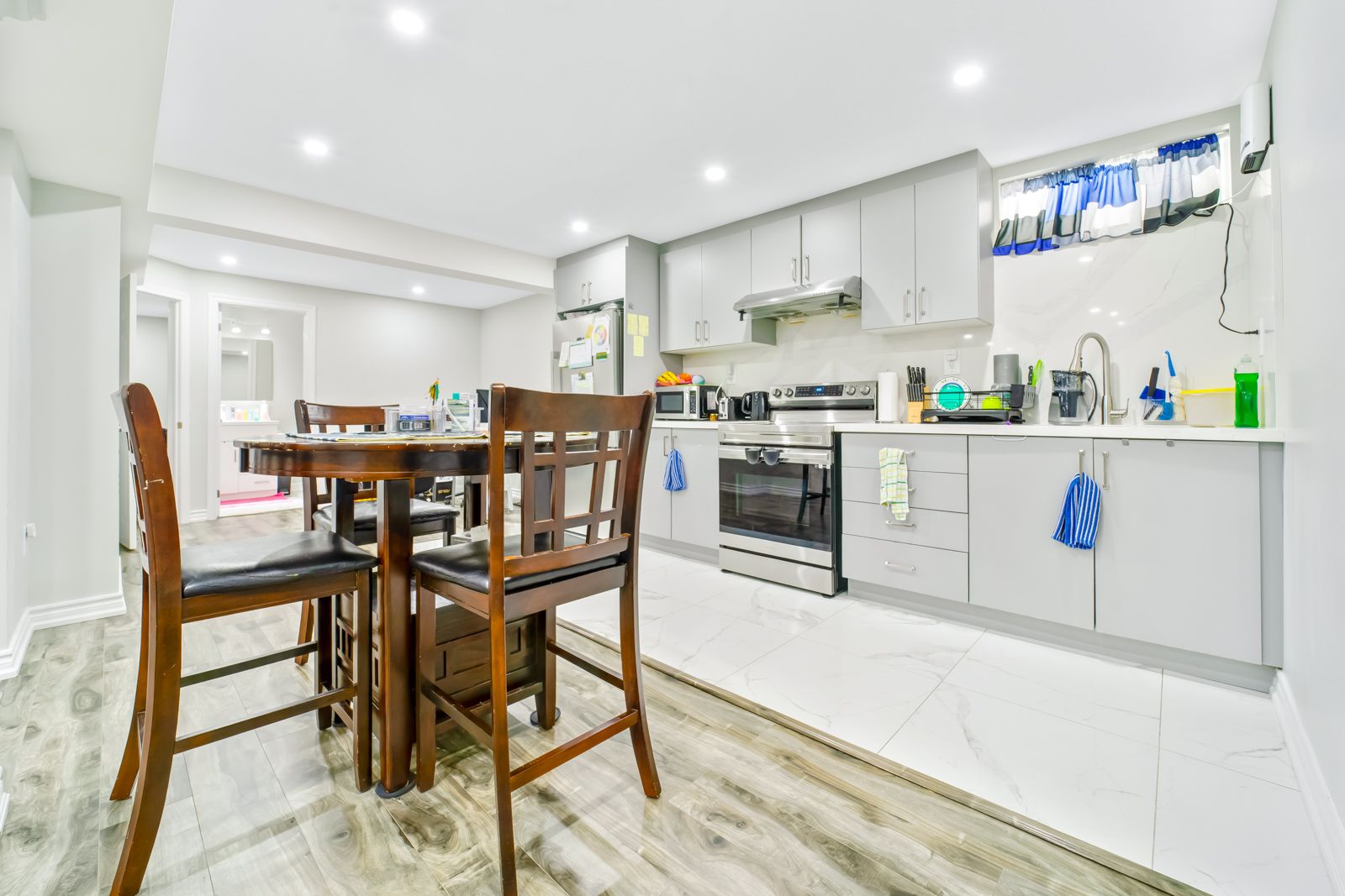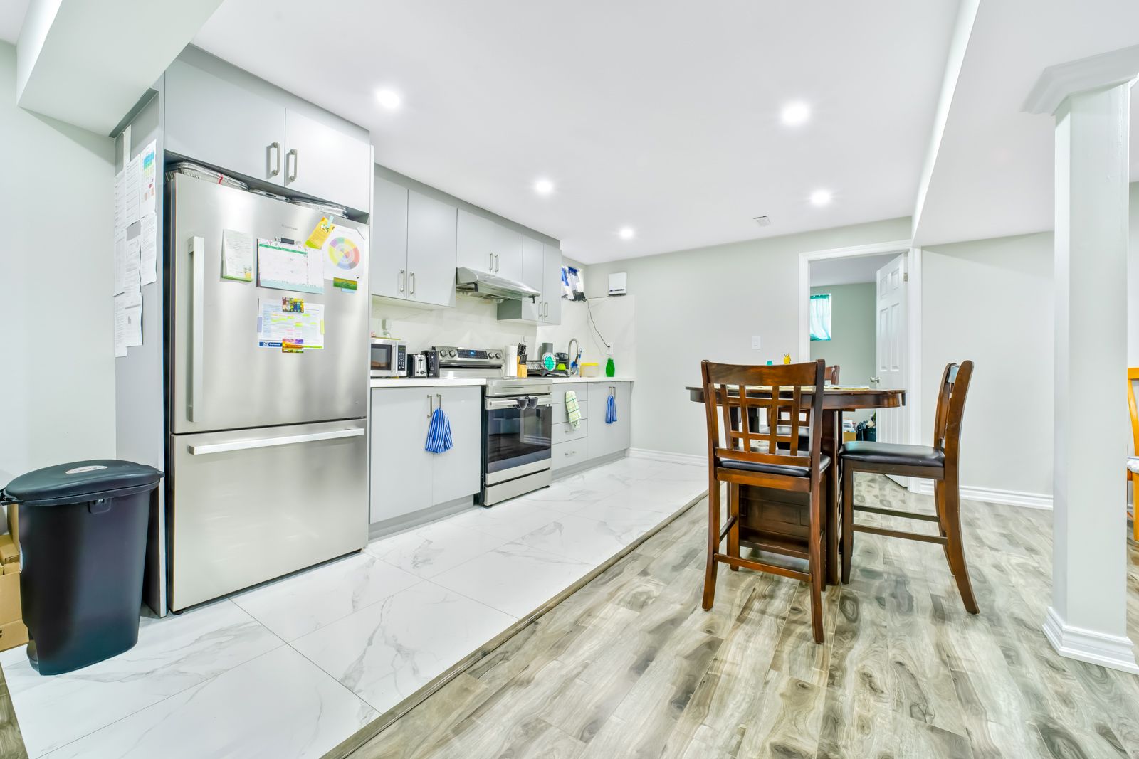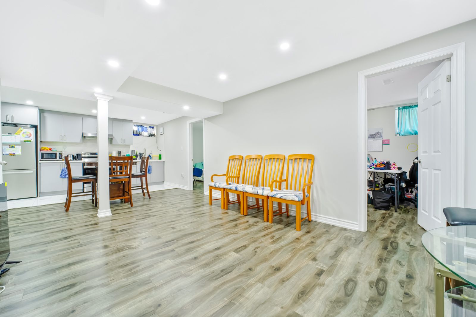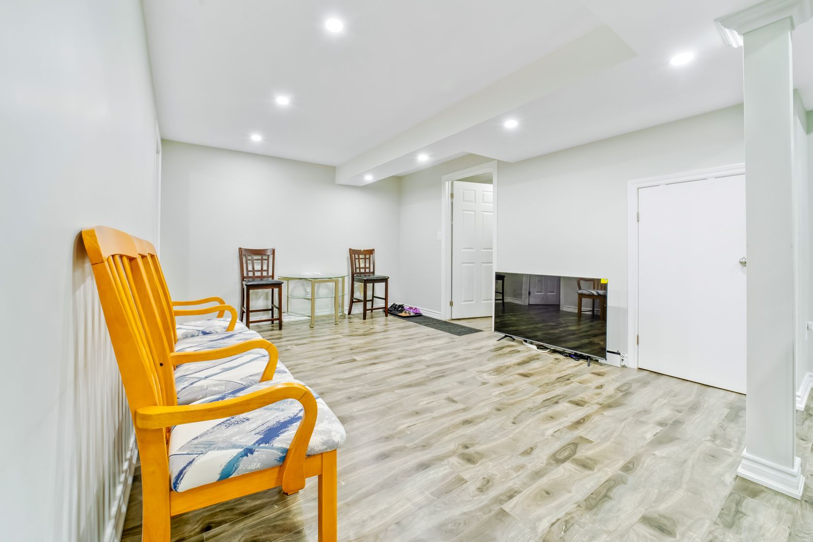 • Finished basement includes two separate apartments with large windows.