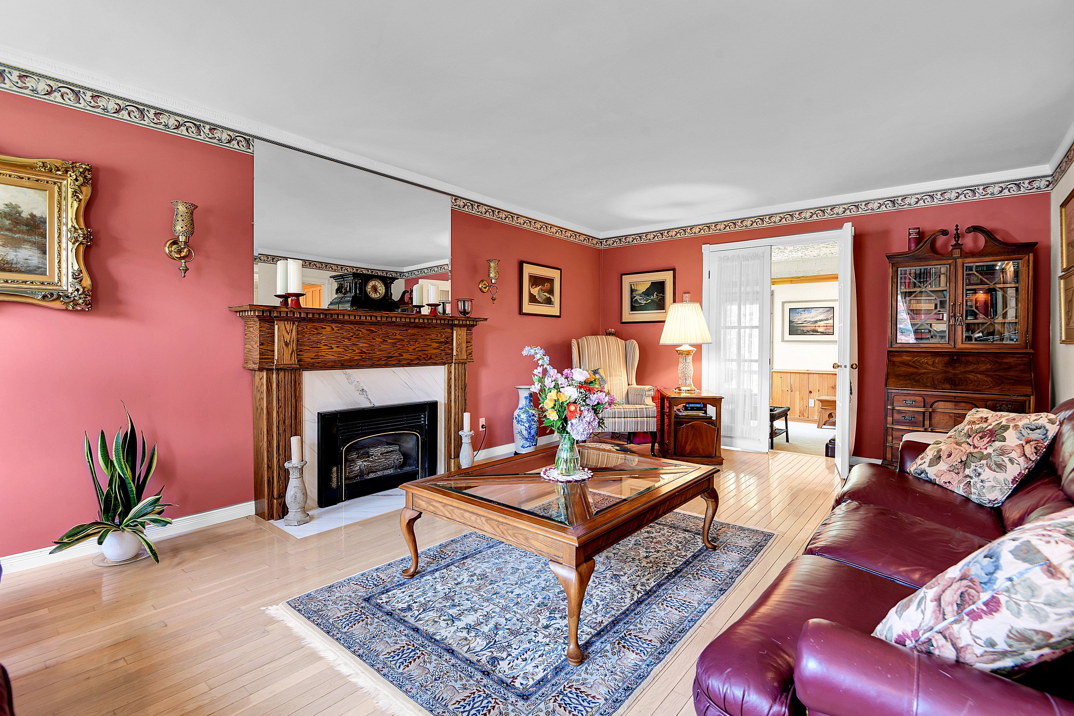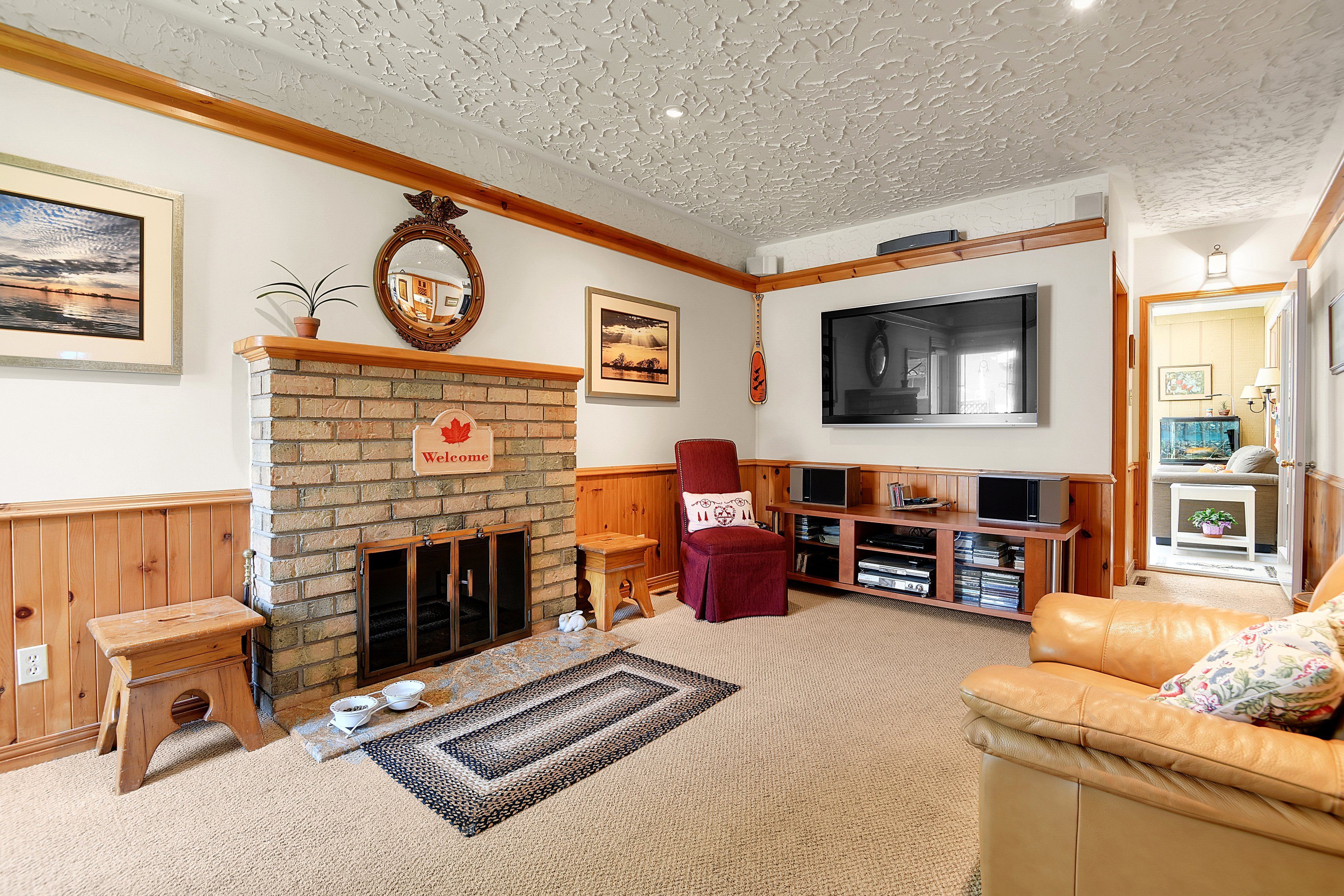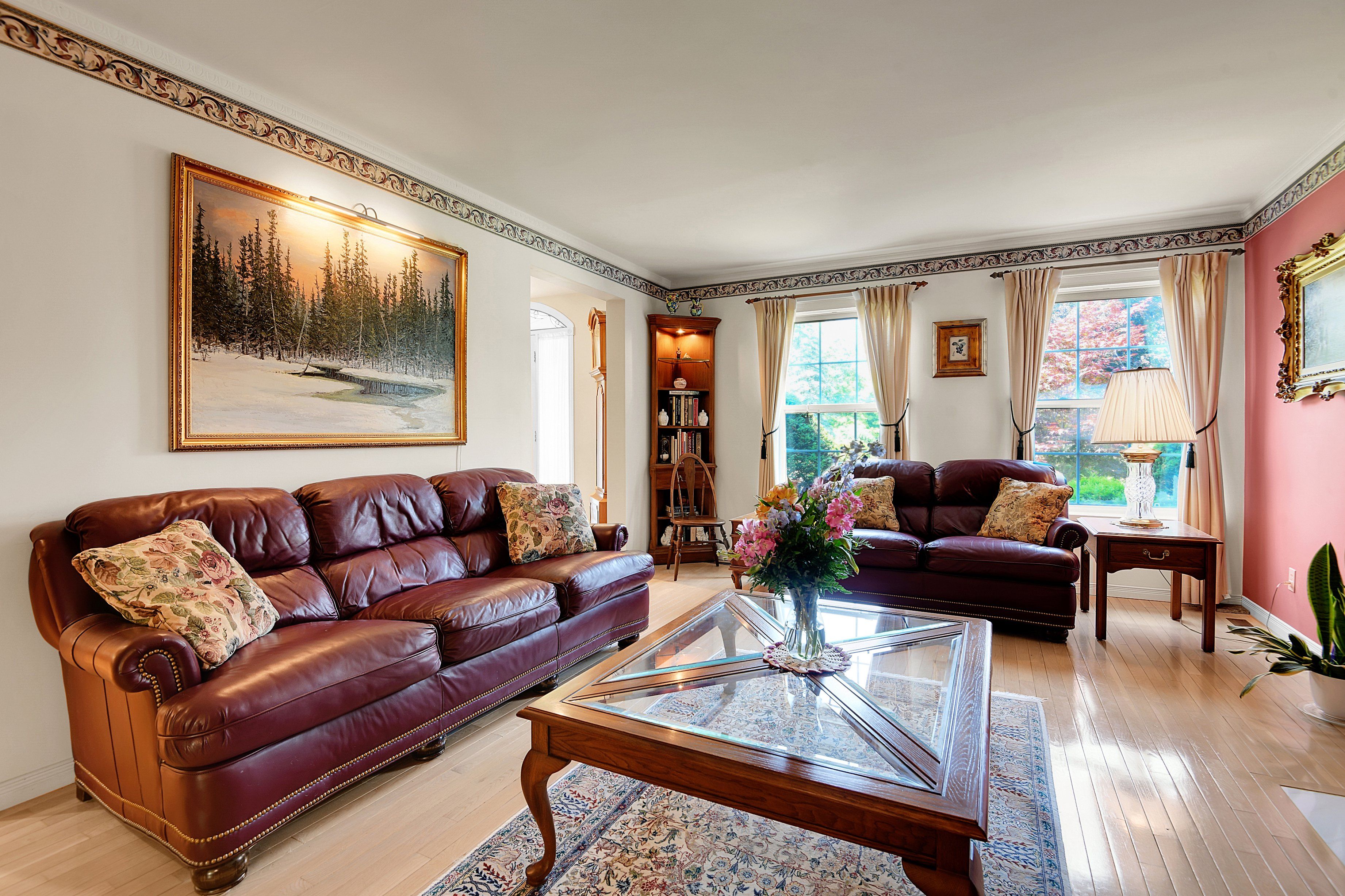 • Four-season sunroom offers views of a private backyard for year-round enjoyment.