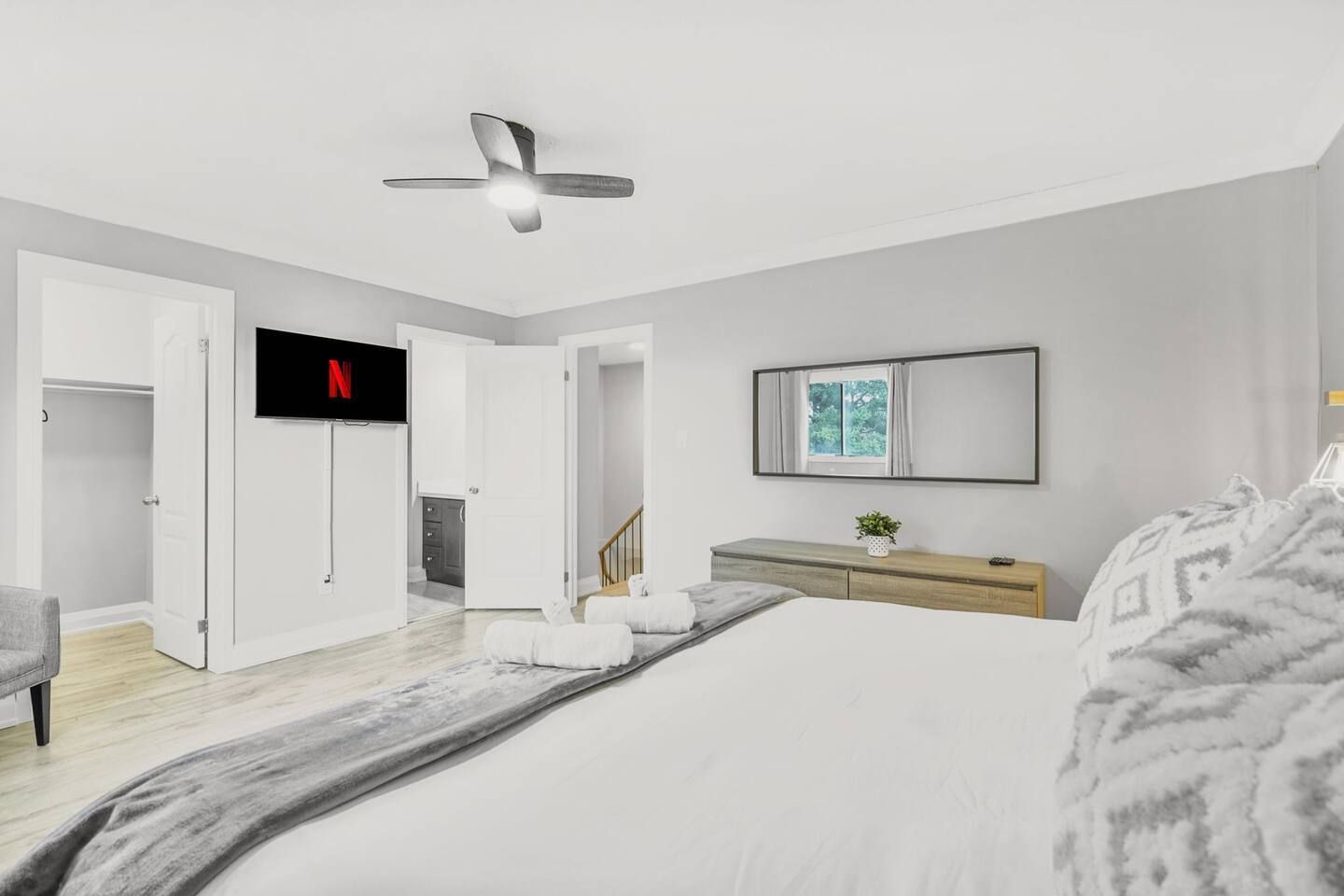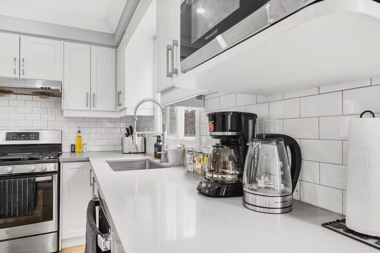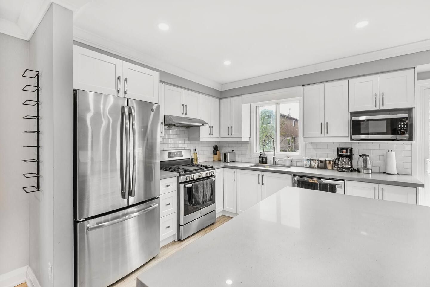 • Chef's kitchen features a large quartz island and stainless steel appliances.