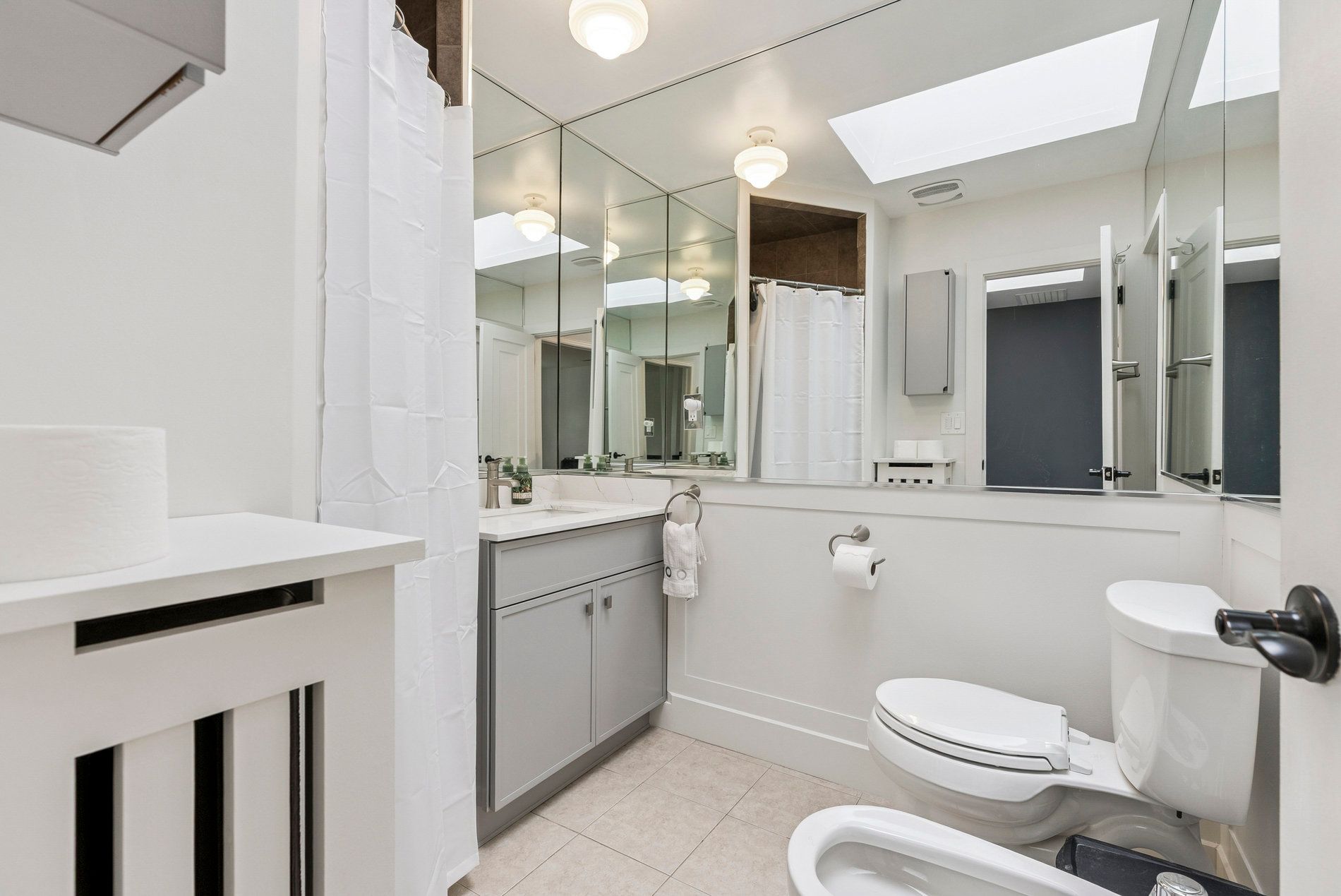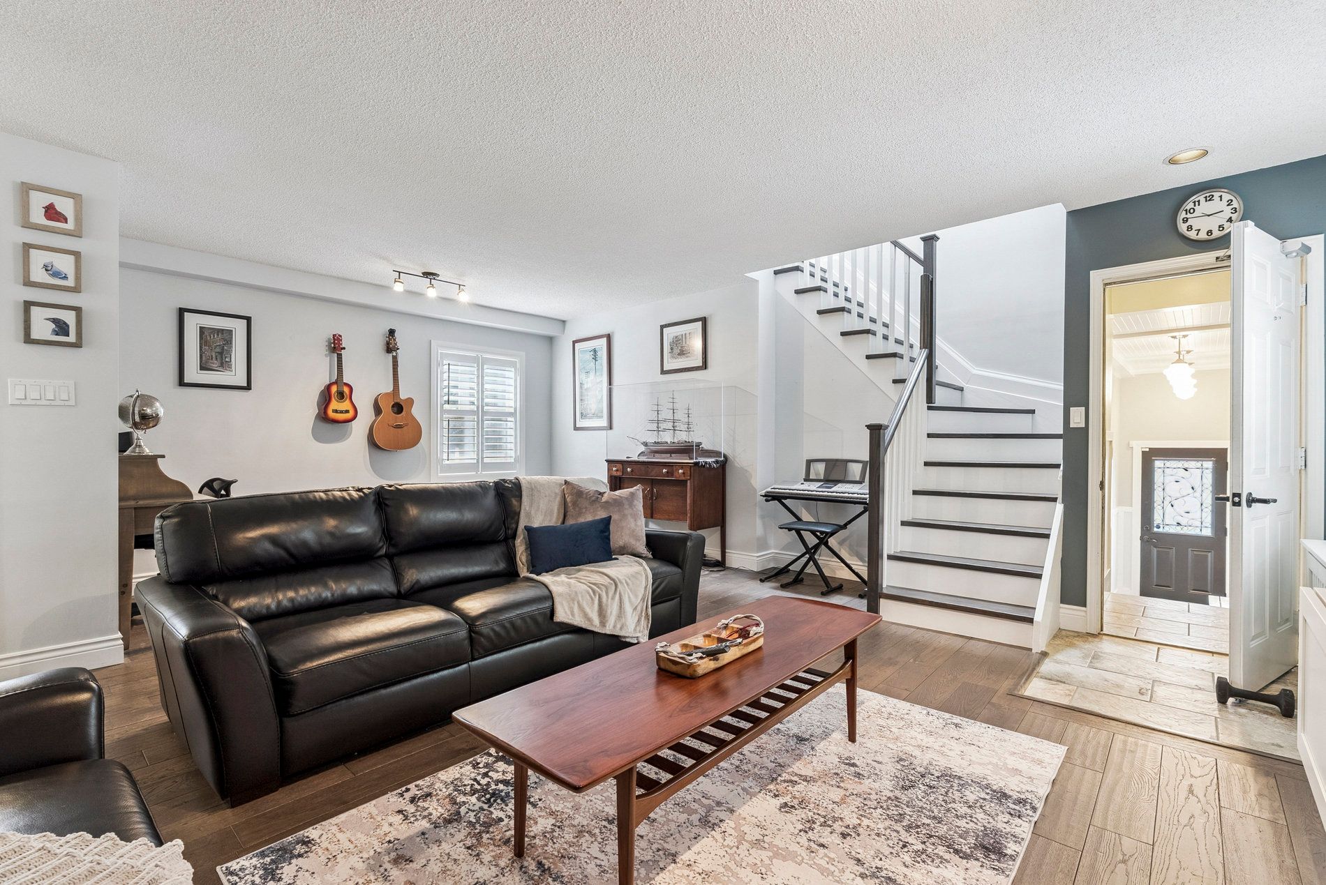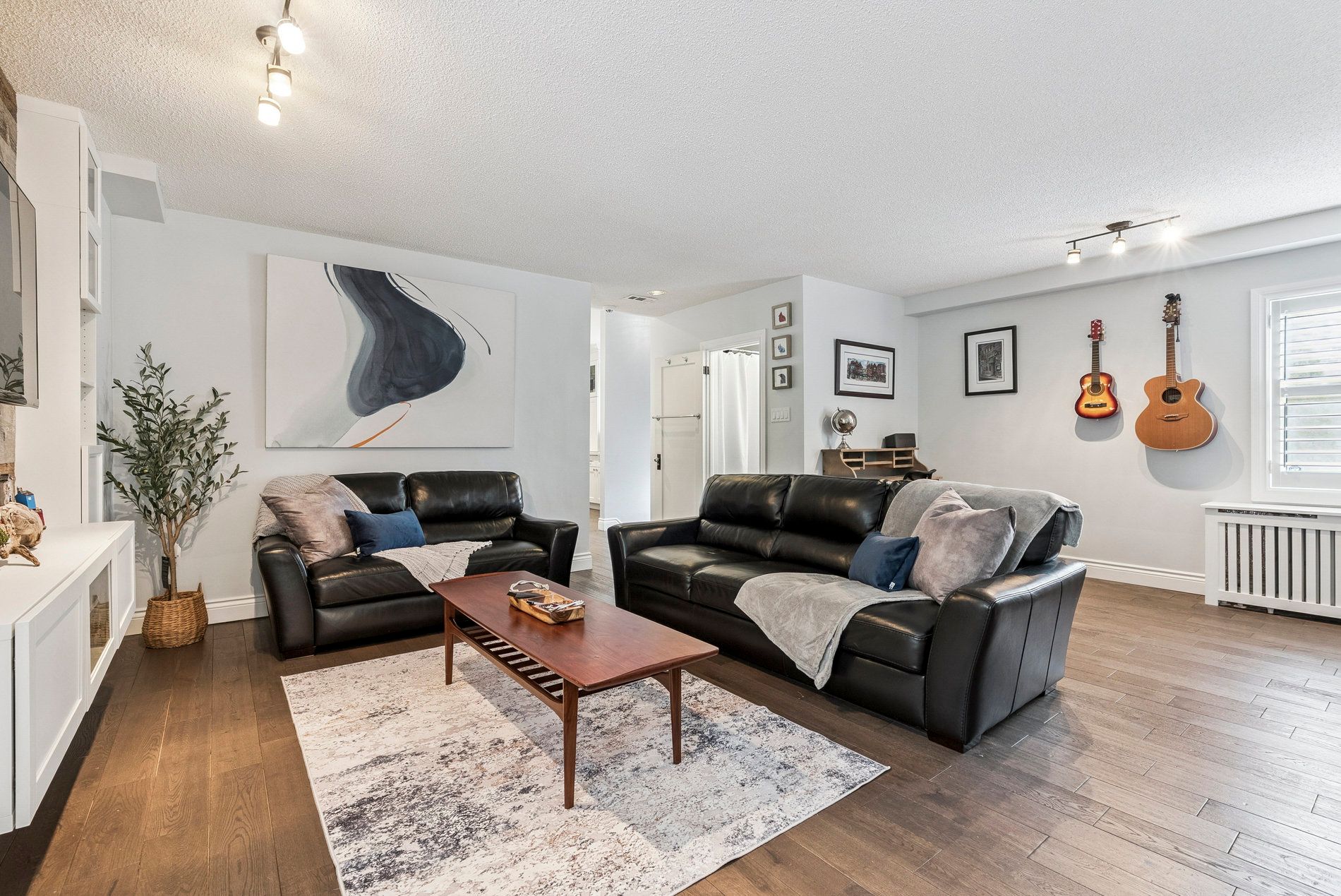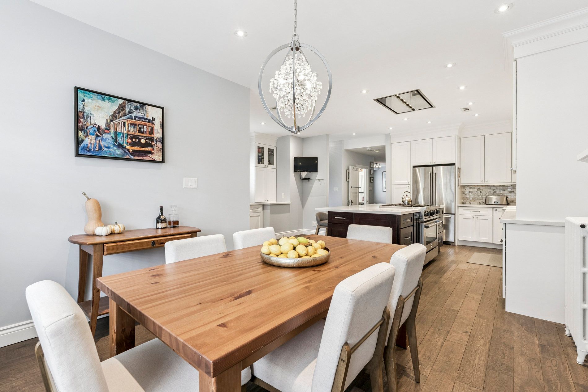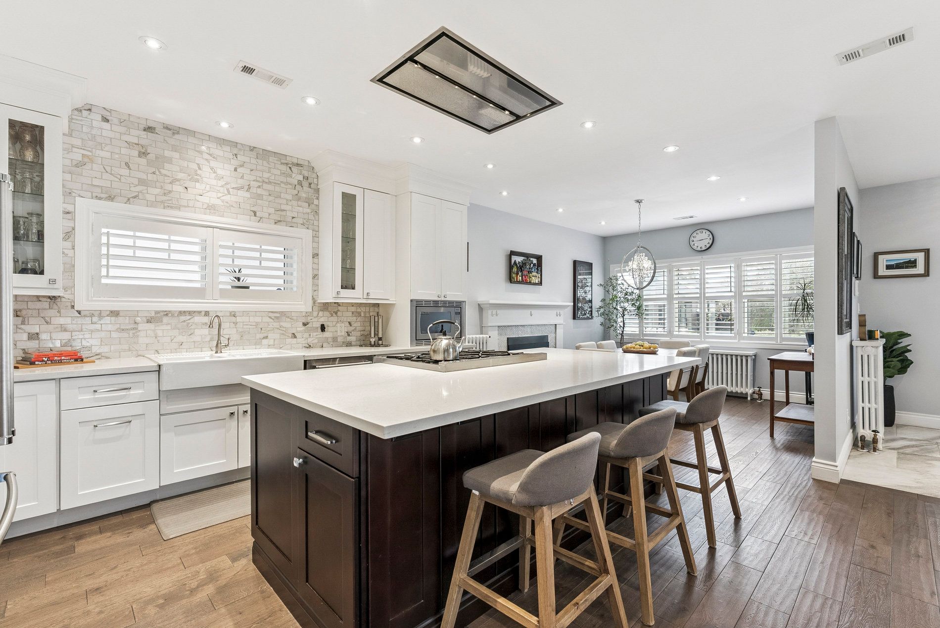 • Spacious open-concept living and dining area with two fireplaces.