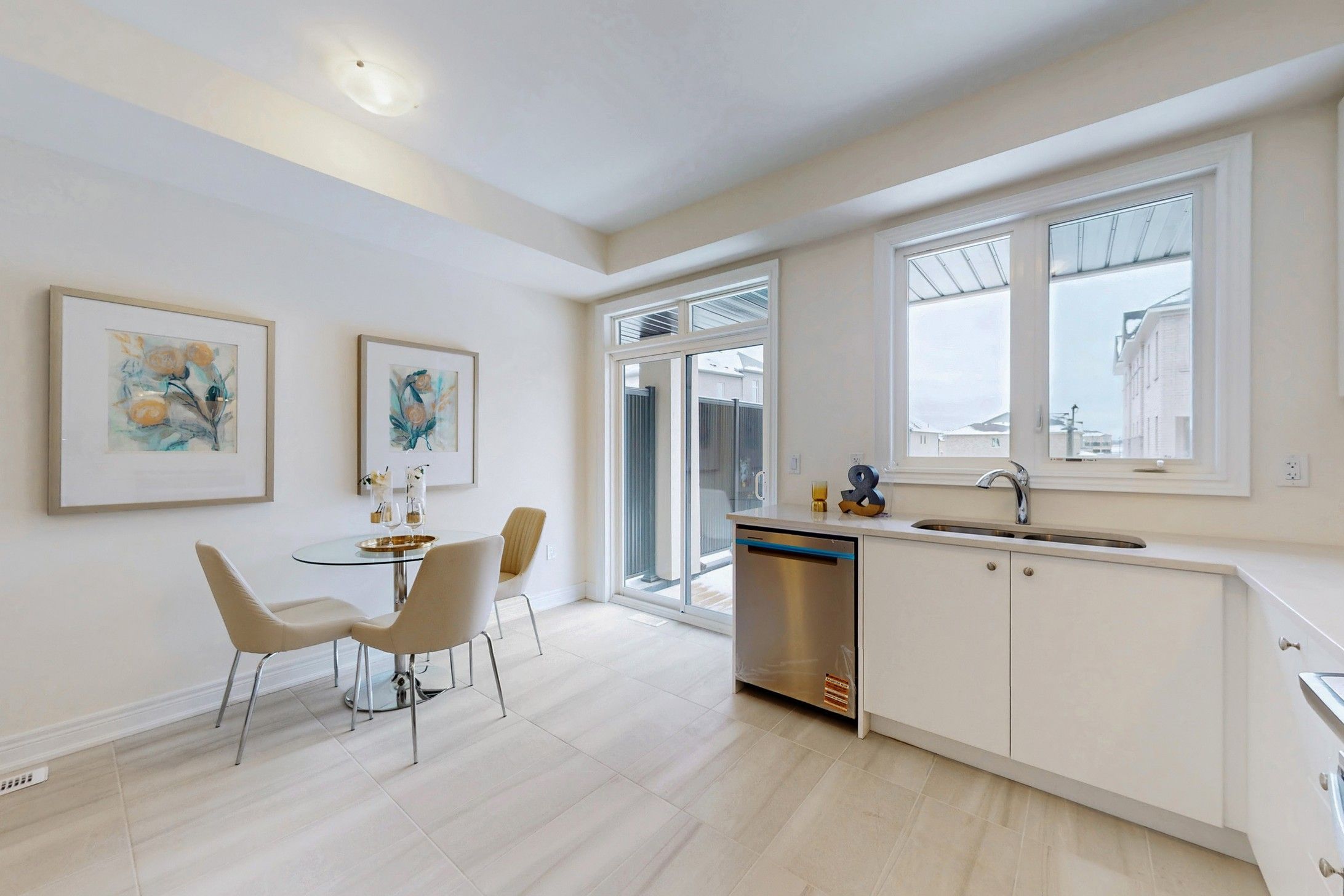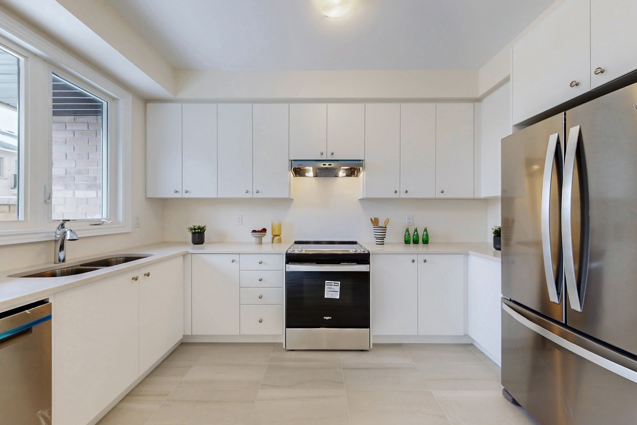 • Stylish modern kitchen with quartz countertops and stainless steel appliances.