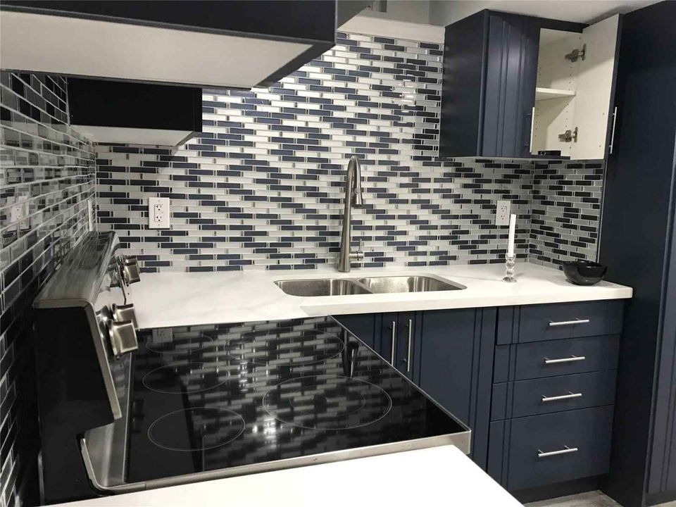 • Modern kitchen features quartz countertops and stylish backsplash.