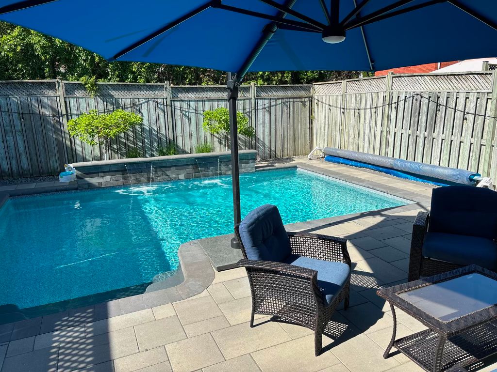 • Backyard oasis featuring a saltwater pool, waterfall, and patio.