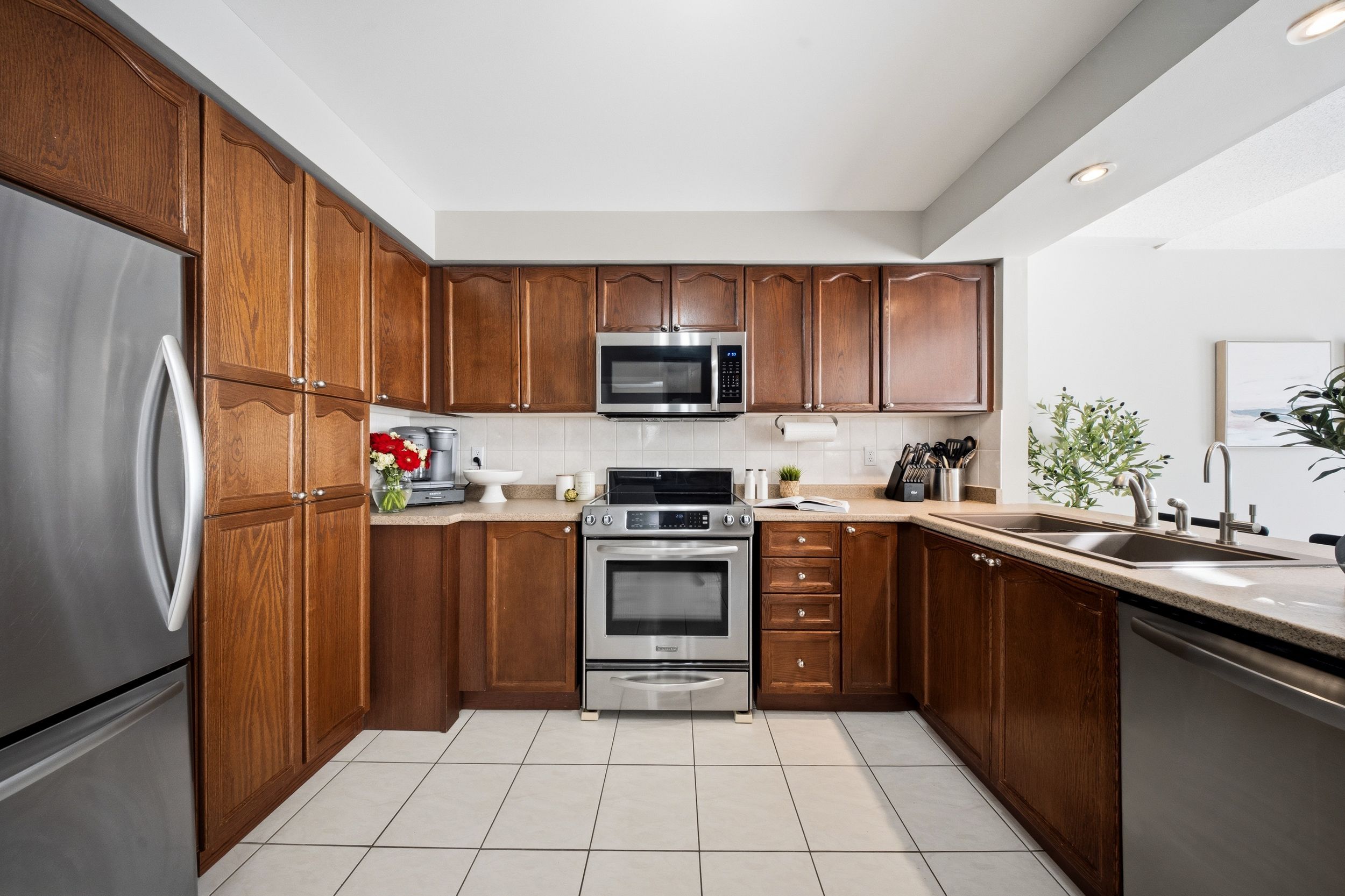 • Spacious kitchen with breakfast bar, opens to the large living room.