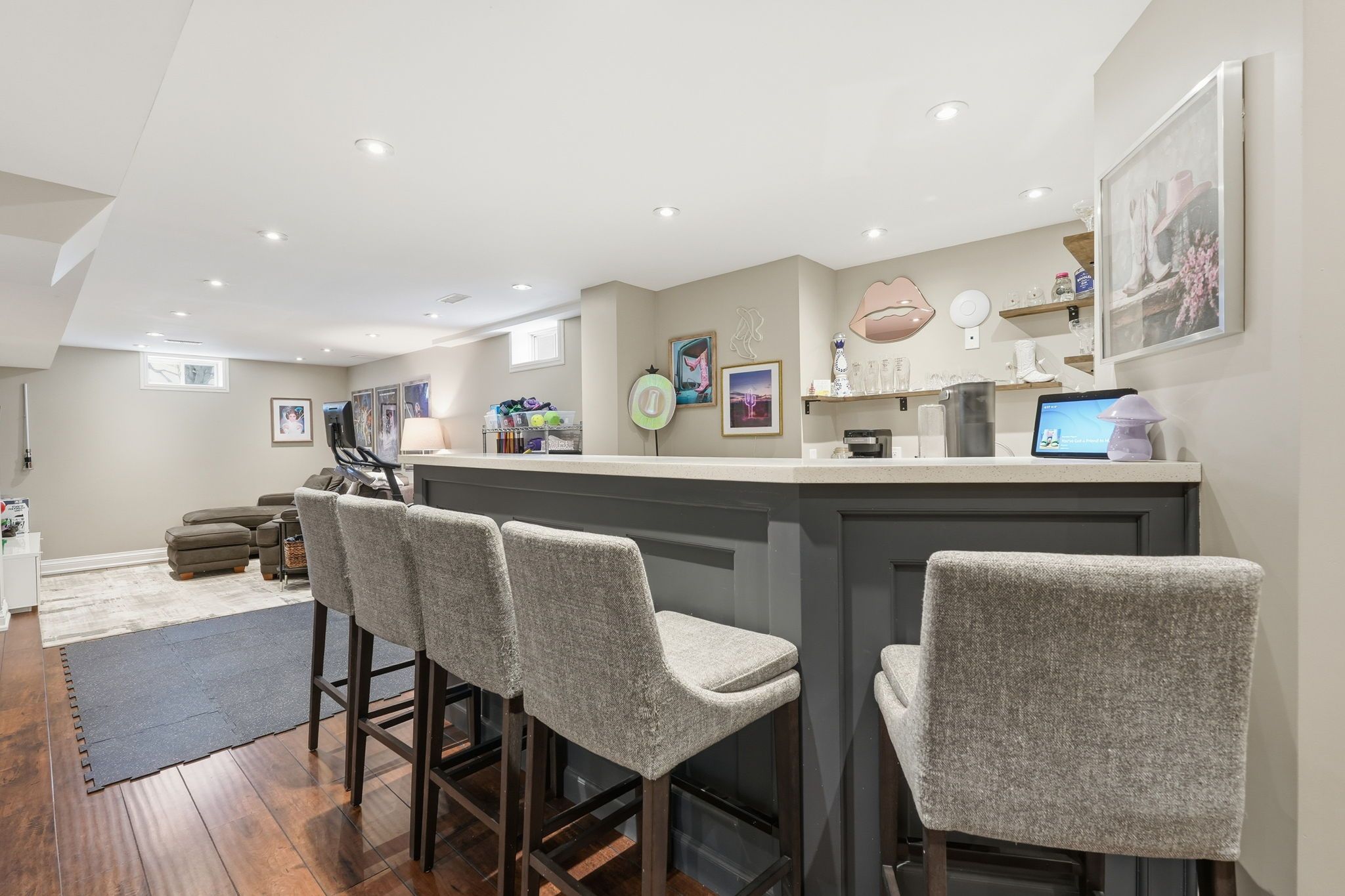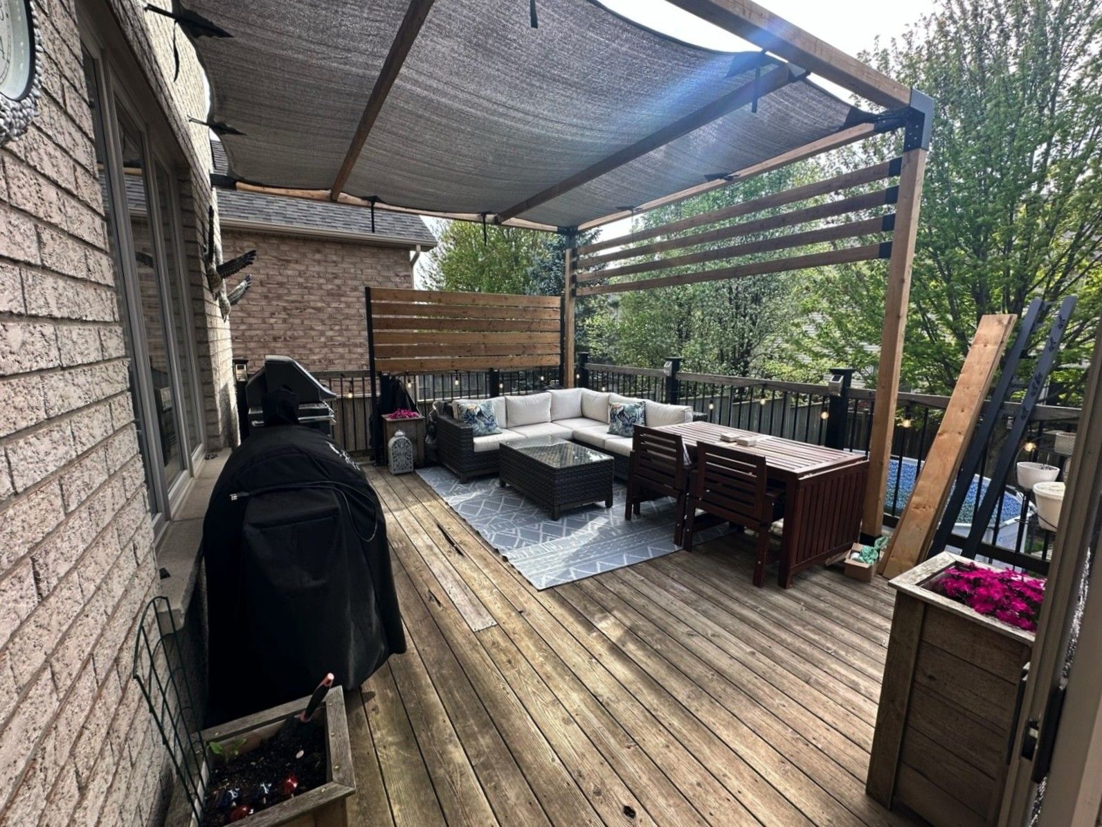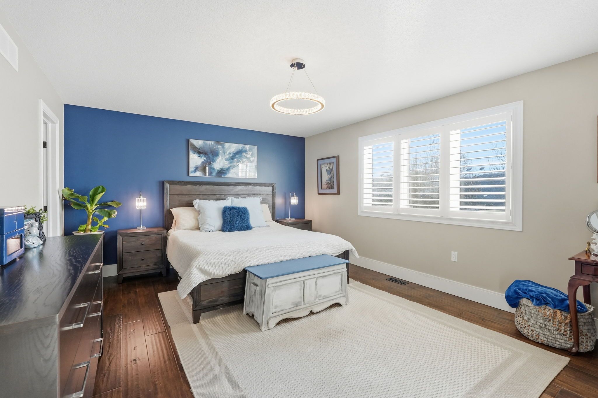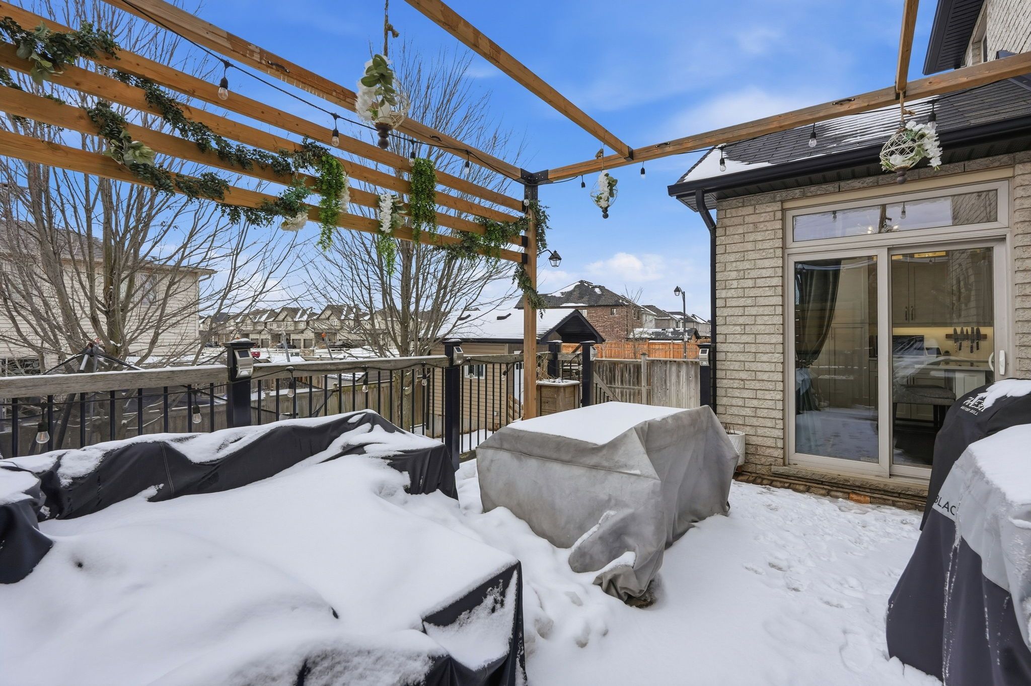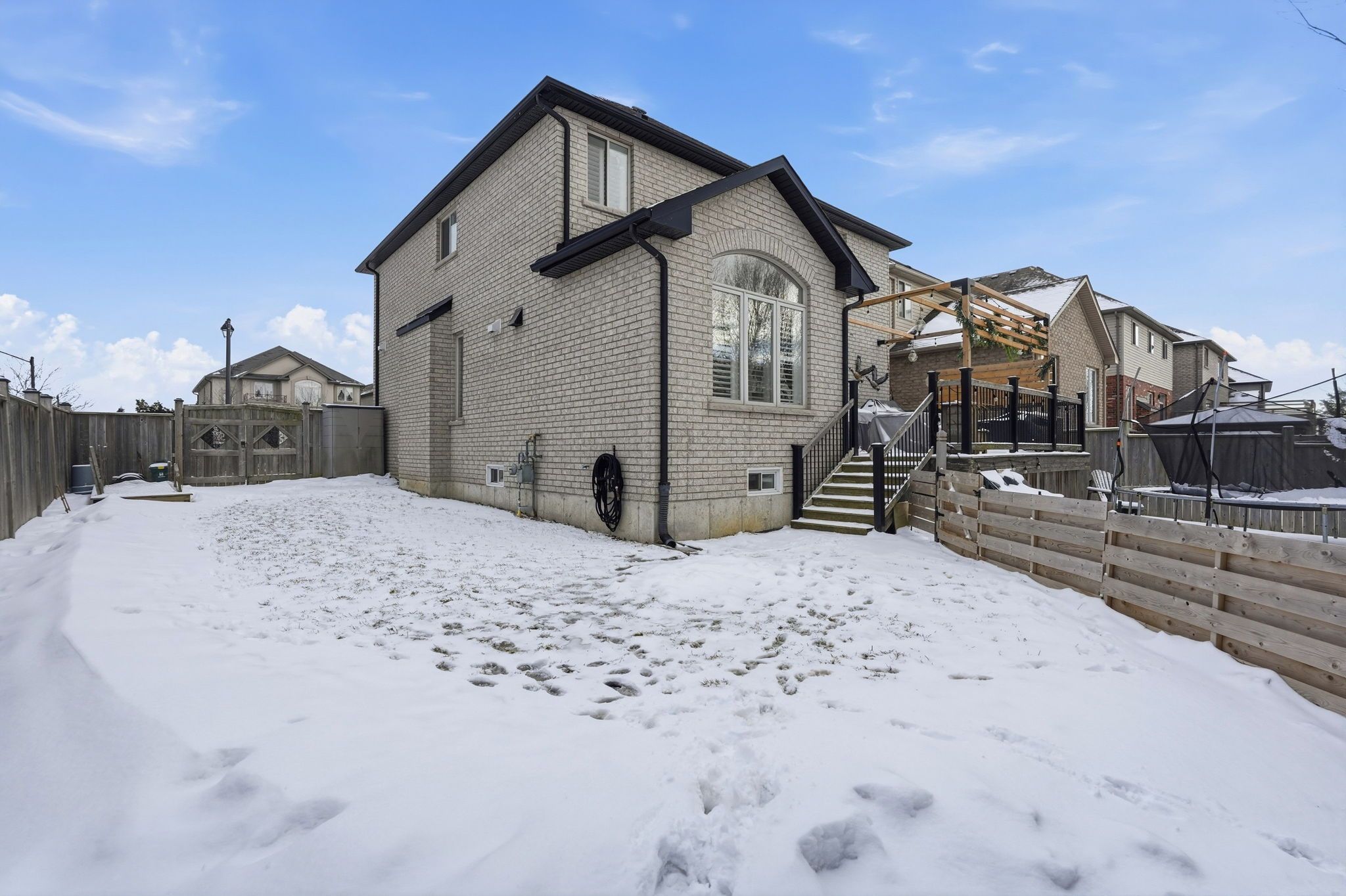Welcome to this stunning former builder's model home, perfectly situated on a premium corner lot that commands attention with its sophisticated stucco-and-brick exterior. This meticulously maintained, carpet-free residence offers a rare combination of architectural prestige and modern, turn-key luxury. The grand interior flow begins with soaring 9-foot ceilings and custom coffered ceiling details in both the living and dining rooms, creating an atmosphere of refined elegance. California shutters are featured throughout both the main and upper levels, perfectly complementing the engineered hardwood flooring that flows seamlessly across both floors and the staircase. At the heart of the home is a chef-inspired kitchen featuring pristine white quartz countertops and a premium ge cafe appliance suite, including a professional-grade stove ('21) and fridge and dishwasher ('24). The upper level continues the carpet-free theme throughout all 4 spacious bedrooms, each flooded with natural light from oversized windows. The primary retreat serves as a true sanctuary, offering a spa-like ensuite with a glass shower and deep soaker tub, alongside a generous walk-in closet featuring custom organizers. The professional finish extends to the lower level, featuring high-end laminate flooring and an entertainer's dream setup. Host guests at the custom wet bar, which comfortably seats 5 and includes a dedicated wine/bar fridge and sink, just steps from a 3rd full bathroom with a large walk-in shower. Outdoor living is elevated by extensive aggregate concrete with stamped accents and professional landscaping. The private backyard is an oasis for relaxation, featuring a custom pergola with a mesh shade top for shaded summer entertaining and a rare insulated shed with full electrical hookup-ideal for a workshop or studio. Walking distance to bellmoore school, shopping, food, and the binbrook fairgrounds.