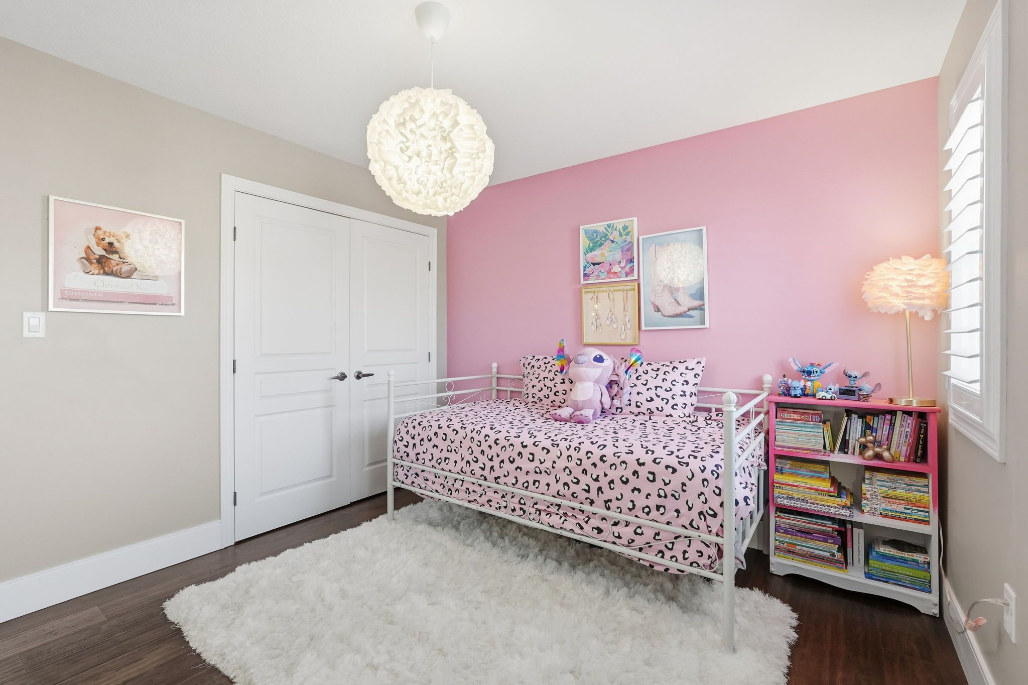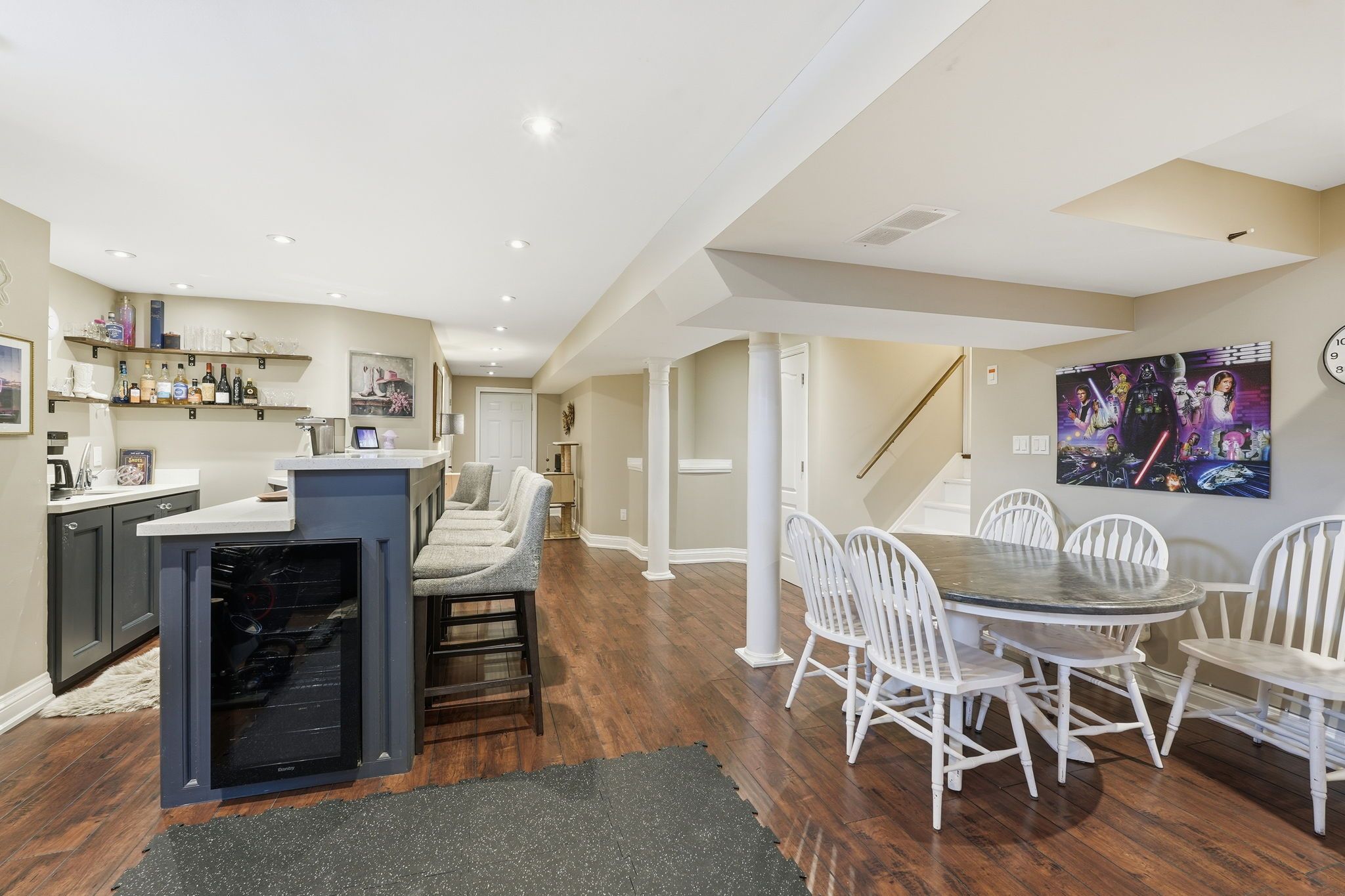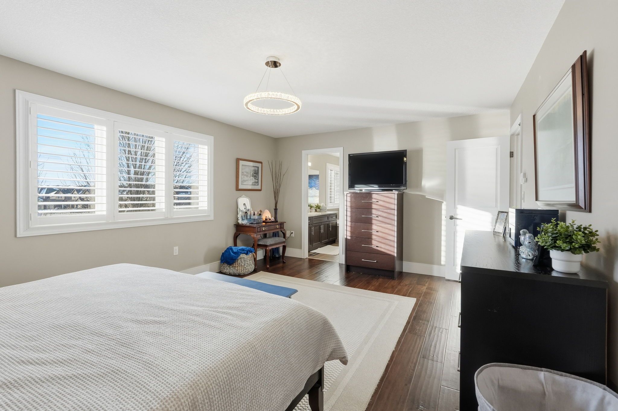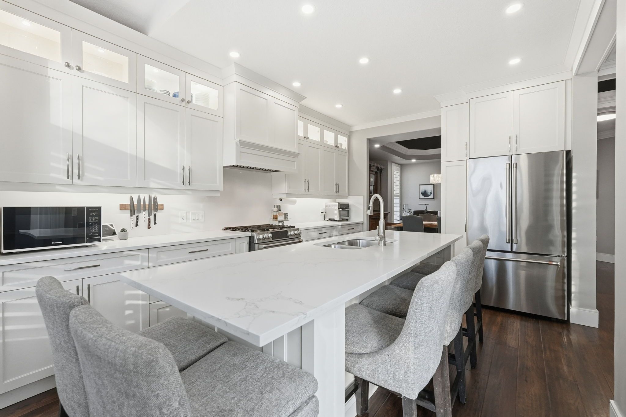 Welcome to this stunning former builder's model home, perfectly situated on a premium corner lot that commands attention with its sophisticated stucco-and-brick exterior. This meticulously maintained, carpet-free residence offers a rare combination of architectural prestige and modern, turn-key luxury. The grand interior flow begins with soaring 9-foot ceilings and custom coffered ceiling details in both the living and dining rooms, creating an atmosphere of refined elegance. California shutters are featured throughout both the main and upper levels, perfectly complementing the engineered hardwood flooring that flows seamlessly across both floors and the staircase. At the heart of the home is a chef-inspired kitchen featuring pristine white quartz countertops and a premium ge cafe appliance suite, including a professional-grade stove ('21) and fridge and dishwasher ('24). The upper level continues the carpet-free theme throughout all 4 spacious bedrooms, each flooded with natural light from oversized windows. The primary retreat serves as a true sanctuary, offering a spa-like ensuite with a glass shower and deep soaker tub, alongside a generous walk-in closet featuring custom organizers. The professional finish extends to the lower level, featuring high-end laminate flooring and an entertainer's dream setup. Host guests at the custom wet bar, which comfortably seats 5 and includes a dedicated wine/bar fridge and sink, just steps from a 3rd full bathroom with a large walk-in shower. Outdoor living is elevated by extensive aggregate concrete with stamped accents and professional landscaping. The private backyard is an oasis for relaxation, featuring a custom pergola with a mesh shade top for shaded summer entertaining and a rare insulated shed with full electrical hookup-ideal for a workshop or studio. Walking distance to bellmoore school, shopping, food, and the binbrook fairgrounds.