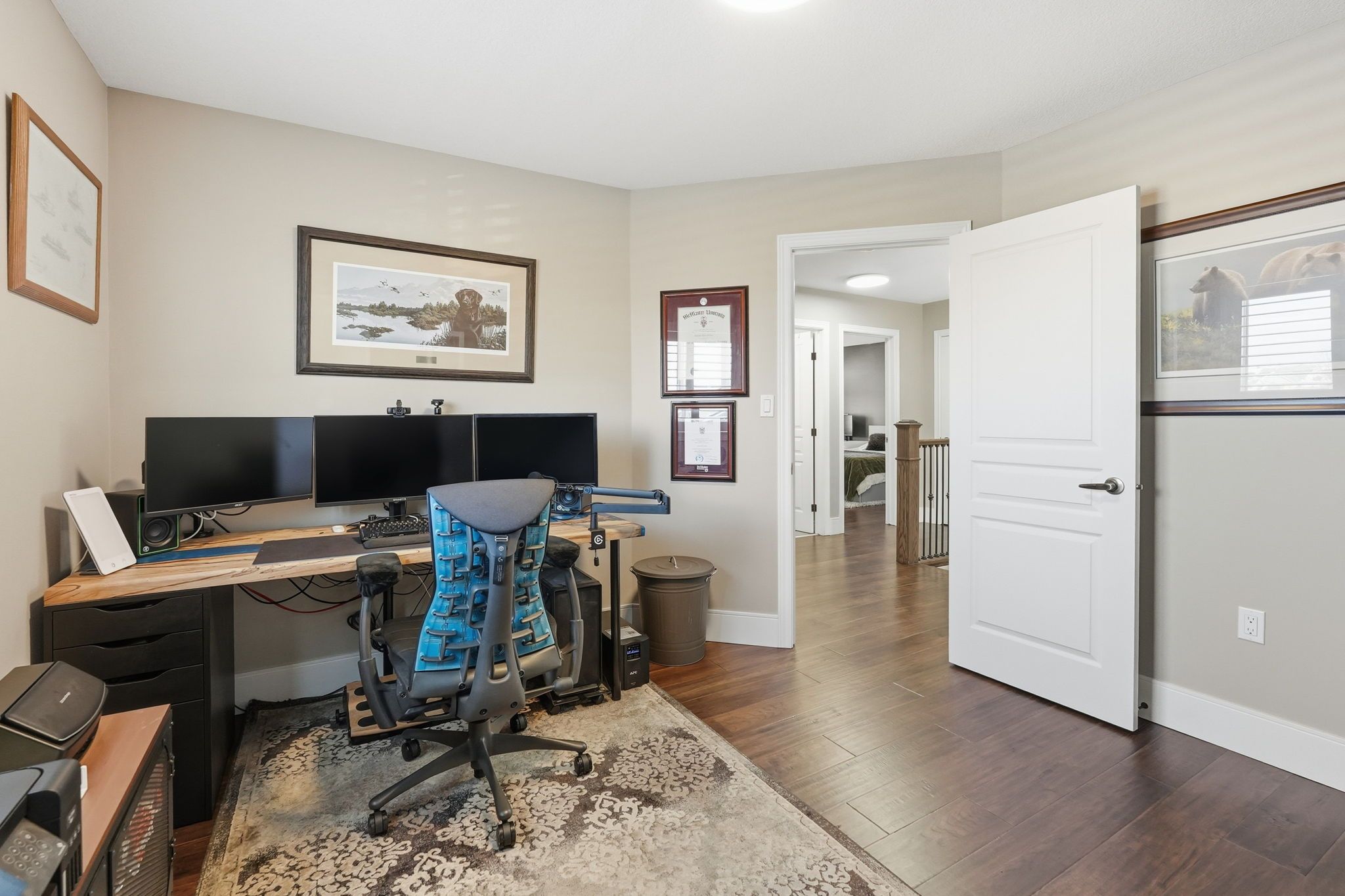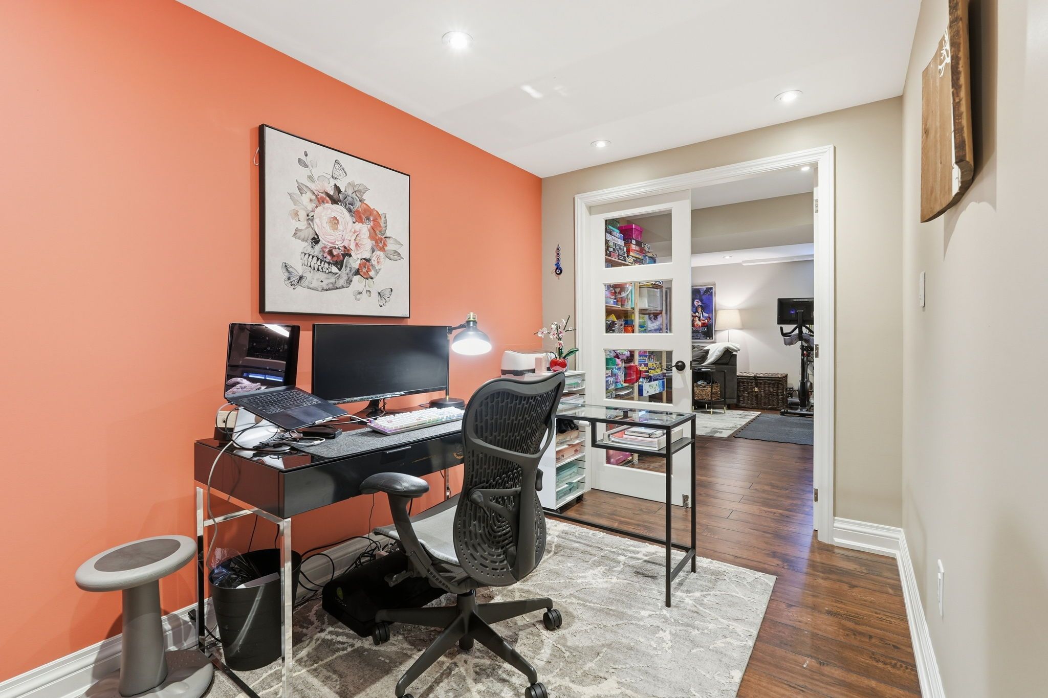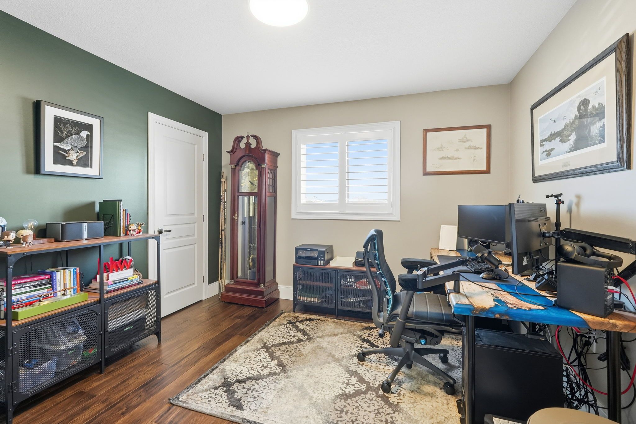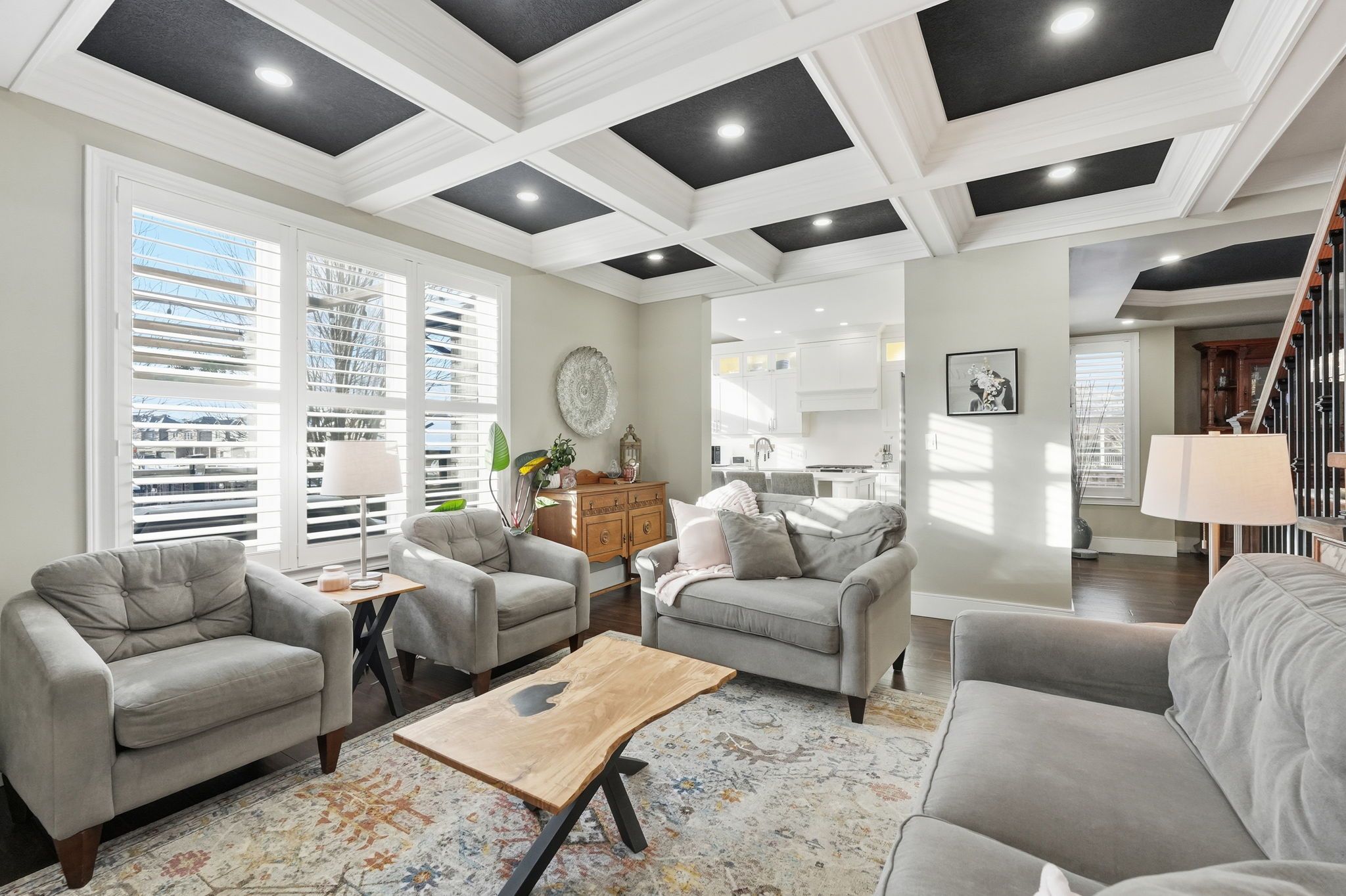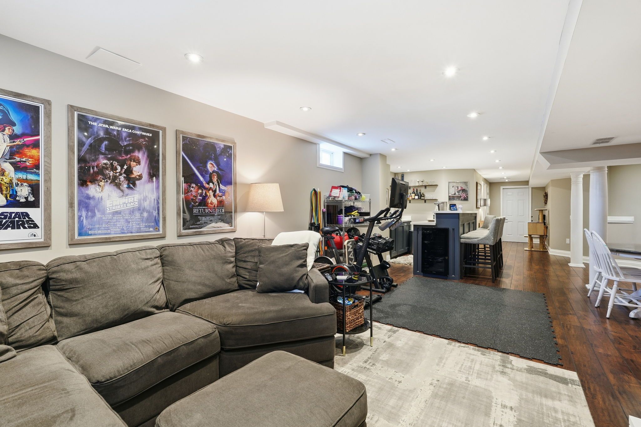 Welcome to this stunning former builder's model home, perfectly situated on a premium corner lot that commands attention with its sophisticated stucco-and-brick exterior. This meticulously maintained, carpet-free residence offers a rare combination of architectural prestige and modern, turn-key luxury. The grand interior flow begins with soaring 9-foot ceilings and custom coffered ceiling details in both the living and dining rooms, creating an atmosphere of refined elegance. California shutters are featured throughout both the main and upper levels, perfectly complementing the engineered hardwood flooring that flows seamlessly across both floors and the staircase. At the heart of the home is a chef-inspired kitchen featuring pristine white quartz countertops and a premium ge cafe appliance suite, including a professional-grade stove ('21) and fridge and dishwasher ('24). The upper level continues the carpet-free theme throughout all 4 spacious bedrooms, each flooded with natural light from oversized windows. The primary retreat serves as a true sanctuary, offering a spa-like ensuite with a glass shower and deep soaker tub, alongside a generous walk-in closet featuring custom organizers. The professional finish extends to the lower level, featuring high-end laminate flooring and an entertainer's dream setup. Host guests at the custom wet bar, which comfortably seats 5 and includes a dedicated wine/bar fridge and sink, just steps from a 3rd full bathroom with a large walk-in shower. Outdoor living is elevated by extensive aggregate concrete with stamped accents and professional landscaping. The private backyard is an oasis for relaxation, featuring a custom pergola with a mesh shade top for shaded summer entertaining and a rare insulated shed with full electrical hookup-ideal for a workshop or studio. Walking distance to bellmoore school, shopping, food, and the binbrook fairgrounds.