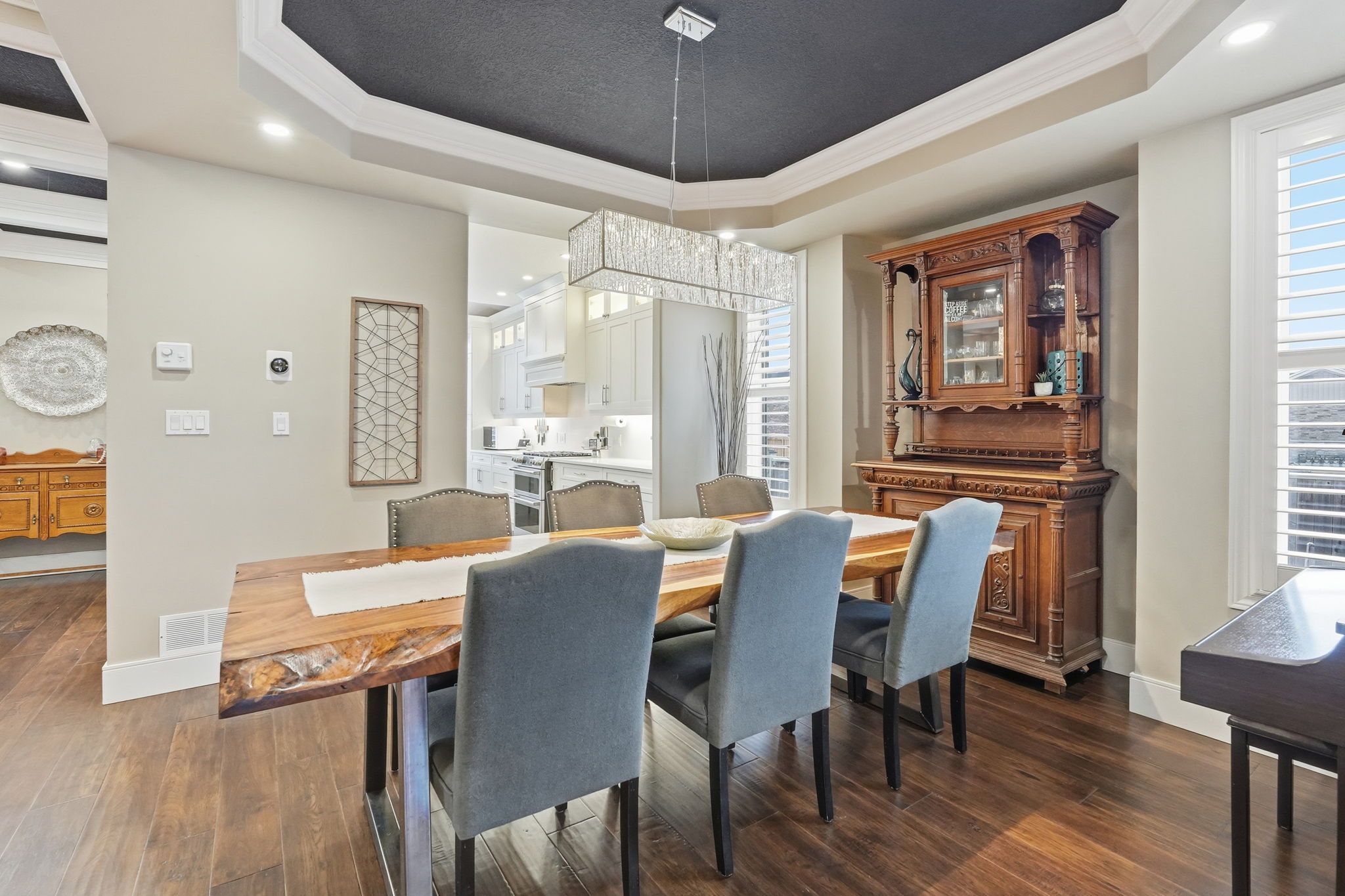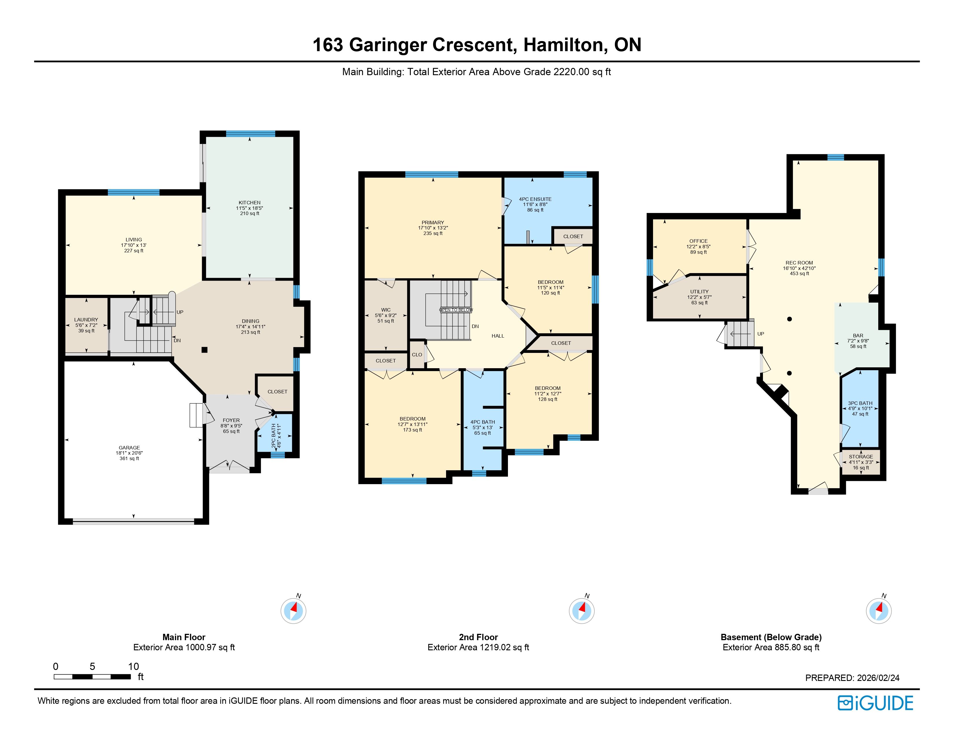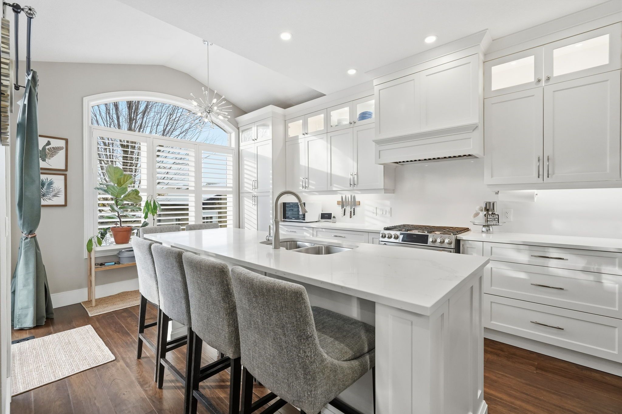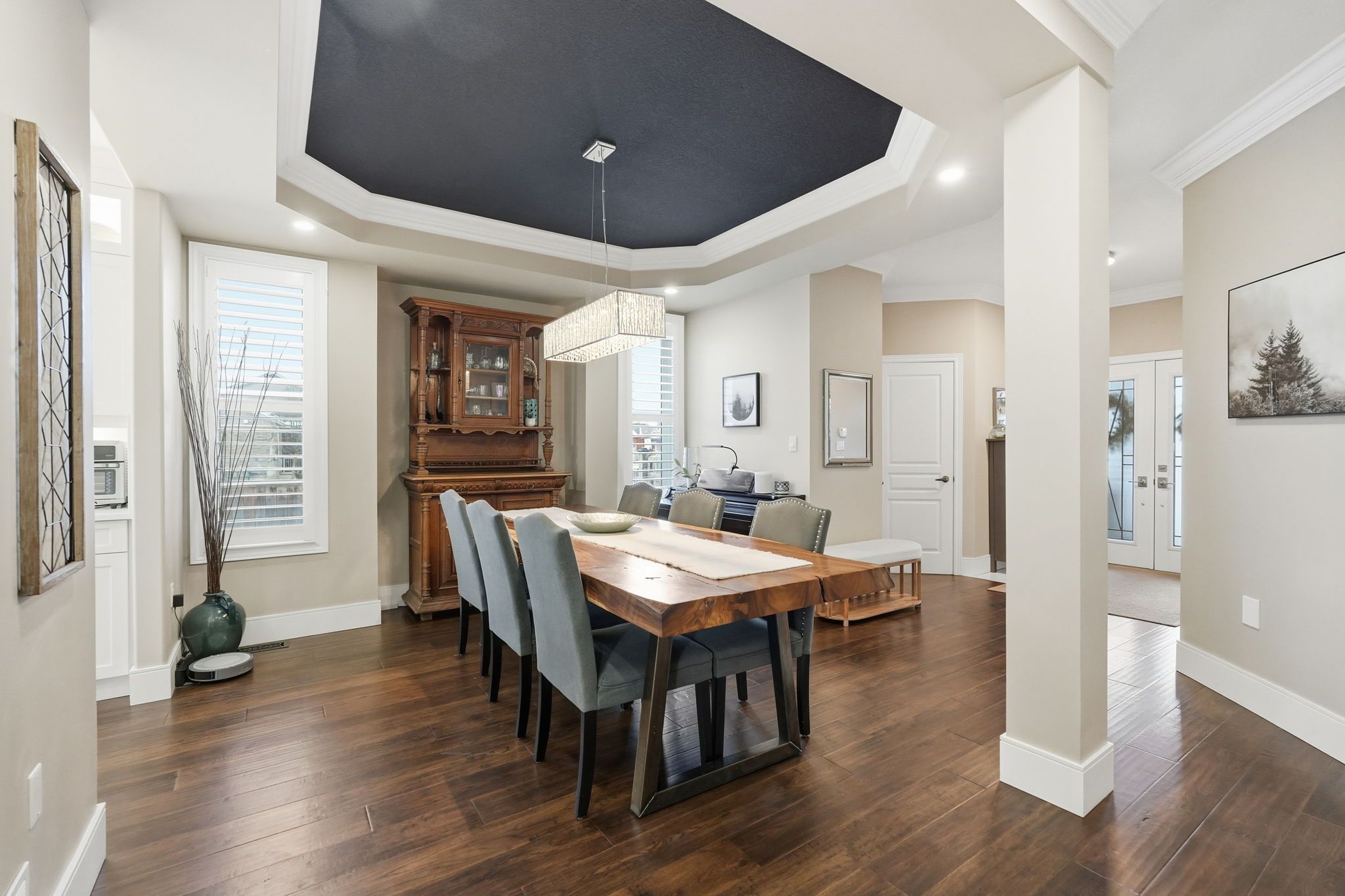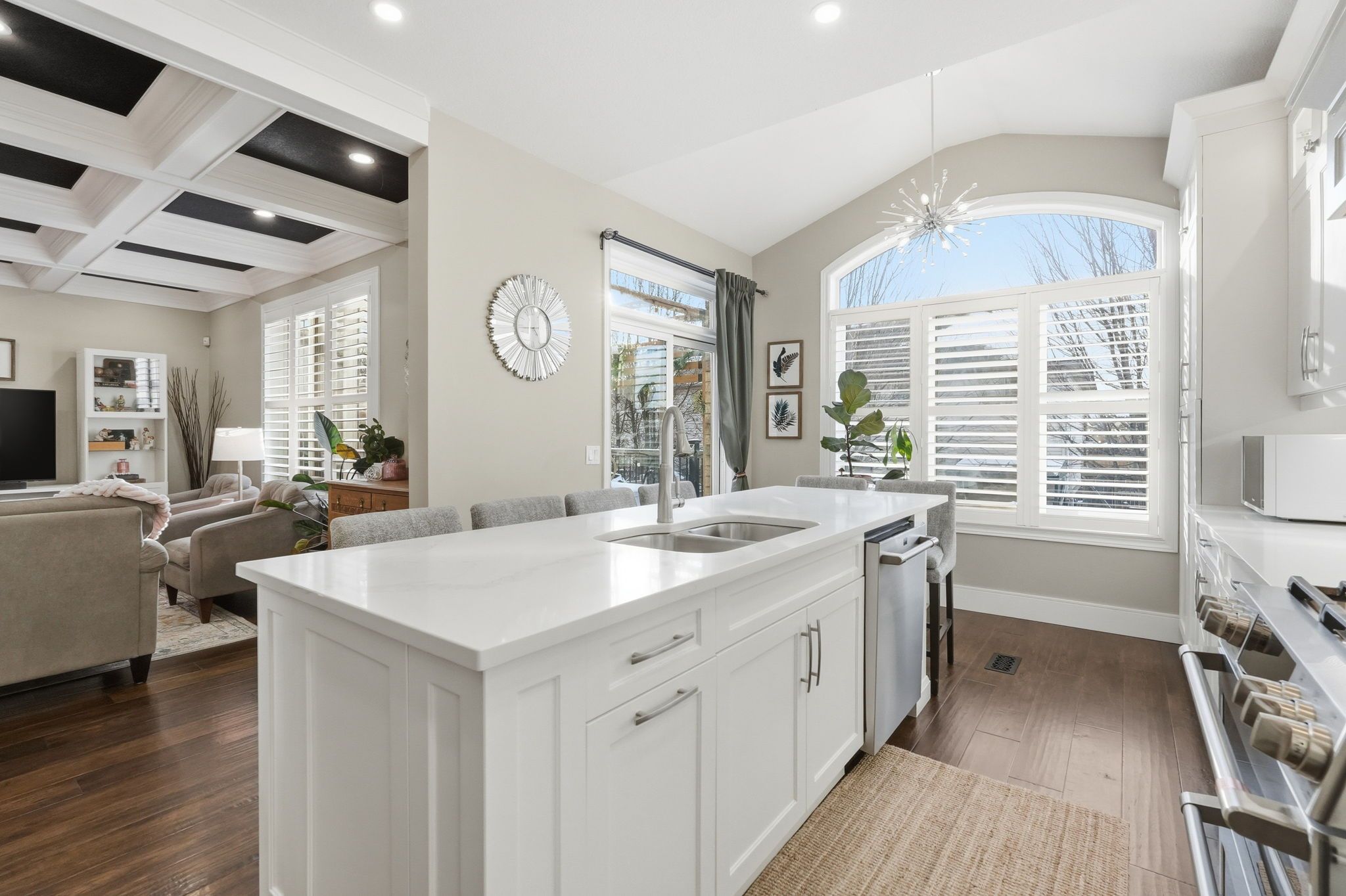Welcome to this stunning former builder's model home, perfectly situated on a premium corner lot that commands attention with its sophisticated stucco-and-brick exterior. This meticulously maintained, carpet-free residence offers a rare combination of architectural prestige and modern, turn-key luxury. The grand interior flow begins with soaring 9-foot ceilings and custom coffered ceiling details in both the living and dining rooms, creating an atmosphere of refined elegance. California shutters are featured throughout both the main and upper levels, perfectly complementing the engineered hardwood flooring that flows seamlessly across both floors and the staircase. At the heart of the home is a chef-inspired kitchen featuring pristine white quartz countertops and a premium ge cafe appliance suite, including a professional-grade stove ('21) and fridge and dishwasher ('24). The upper level continues the carpet-free theme throughout all 4 spacious bedrooms, each flooded with natural light from oversized windows. The primary retreat serves as a true sanctuary, offering a spa-like ensuite with a glass shower and deep soaker tub, alongside a generous walk-in closet featuring custom organizers. The professional finish extends to the lower level, featuring high-end laminate flooring and an entertainer's dream setup. Host guests at the custom wet bar, which comfortably seats 5 and includes a dedicated wine/bar fridge and sink, just steps from a 3rd full bathroom with a large walk-in shower. Outdoor living is elevated by extensive aggregate concrete with stamped accents and professional landscaping. The private backyard is an oasis for relaxation, featuring a custom pergola with a mesh shade top for shaded summer entertaining and a rare insulated shed with full electrical hookup-ideal for a workshop or studio. Walking distance to bellmoore school, shopping, food, and the binbrook fairgrounds.