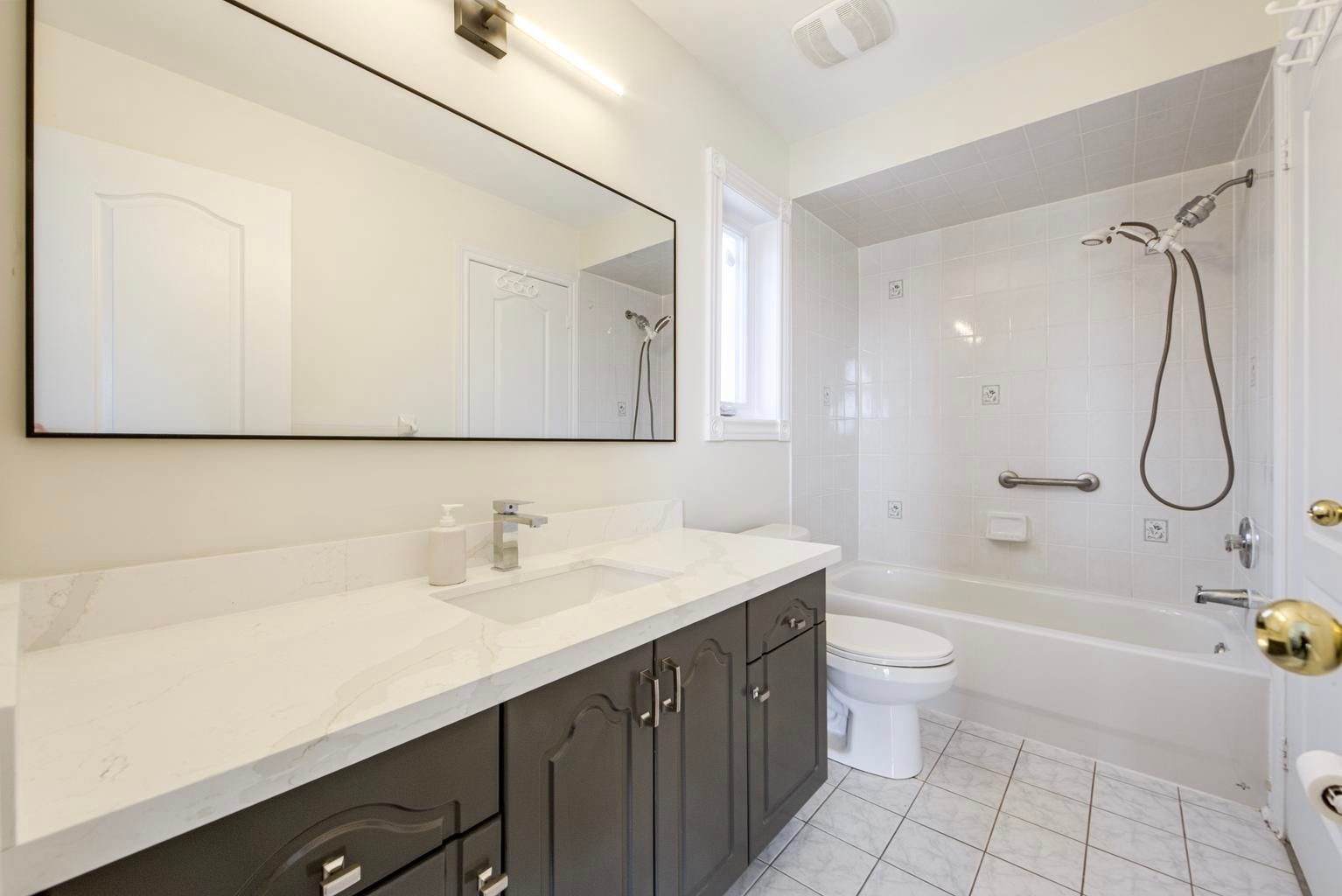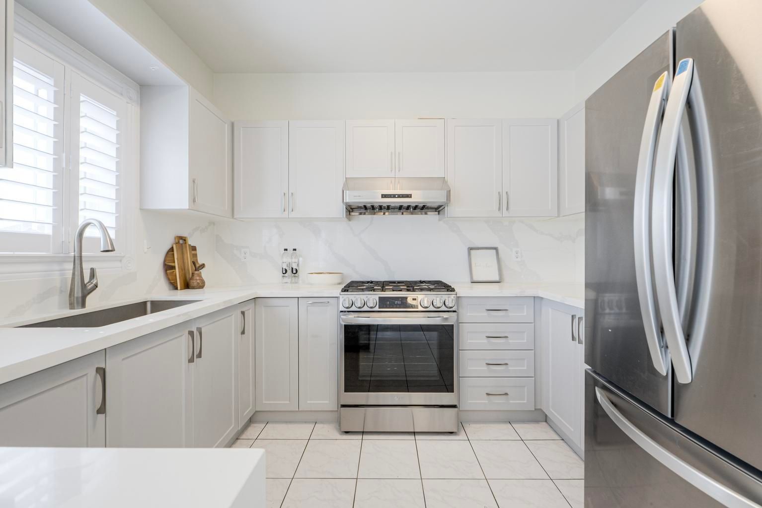 • Renovated kitchen with quartz countertops and stainless steel appliances.