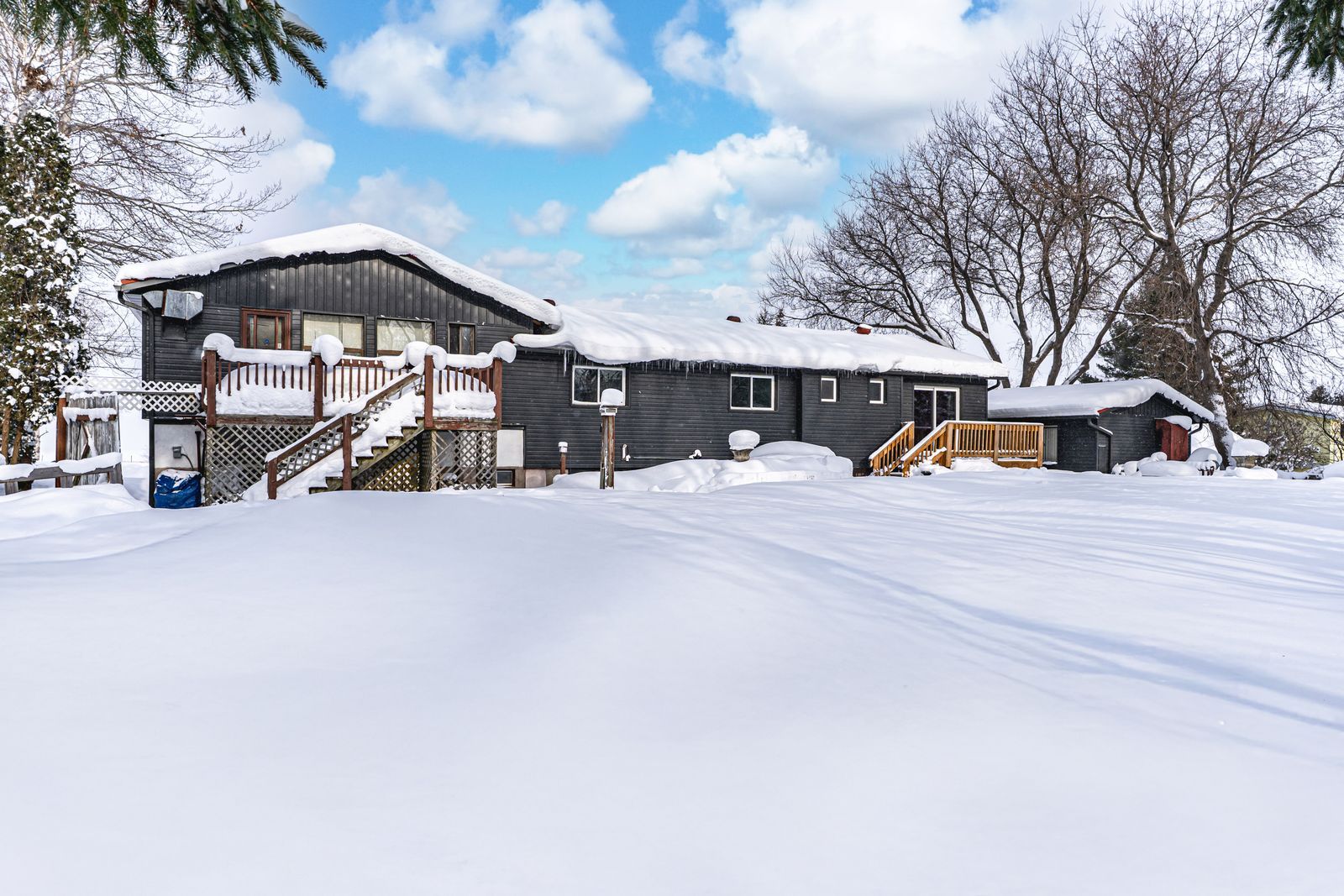 Georgian bay views, a rare double lot, detached outbuilding, & room to reimagine in sought-after paradise point! Bring your vision to this european-inspired side-split with georgian bay views, and just under half an acre, set in the heart of paradise point, where marina access, beaches, and parks shape everyday life. Patterson park sits across the road with playground and beach access, and a short drive connects you to midland's shopping, dining, and daily essentials. The 120 x 166 ft fenced lot features multiple updated decks, a detached 392 sq ft outbuilding that's ideal for a future workshop, hobby space, or exercise studio, plus a garden shed. A metal roof, updated front landscaping with granite steps, flagstone walkway, and retaining walls, along with updated siding, eaves, soffit, fascia, and added insulation, provide a solid exterior starting point. The attached two-car garage with inside entry features an updated insulated garage door and side-mounted liftmaster opener, complemented by two driveways with room for multiple vehicles, boats, trailers, or an rv. Over 3,100 finished square feet are spread across multiple levels, offering a flexible layout with separate entry options and a front walkout that supports in-law capability or short-term rental potential. A sunlit main level includes a large kitchen and dining area with a walkout, plus a living room anchored by a wood-burning fireplace with a brick surround. A massive primary bedroom with a walkout, whirlpool tub, kitchenette, and bar adds serious flexibility for entertaining or relaxing, while the partially finished lower level offers a rec room with a second wood-burning fireplace plus a bar with built-in wine storage. Western exposure delivers unforgettable sunsets and georgian bay views from multiple rooms throughout the home. A well-suited #hometostay for contractors, renovators, and vision-driven buyers.