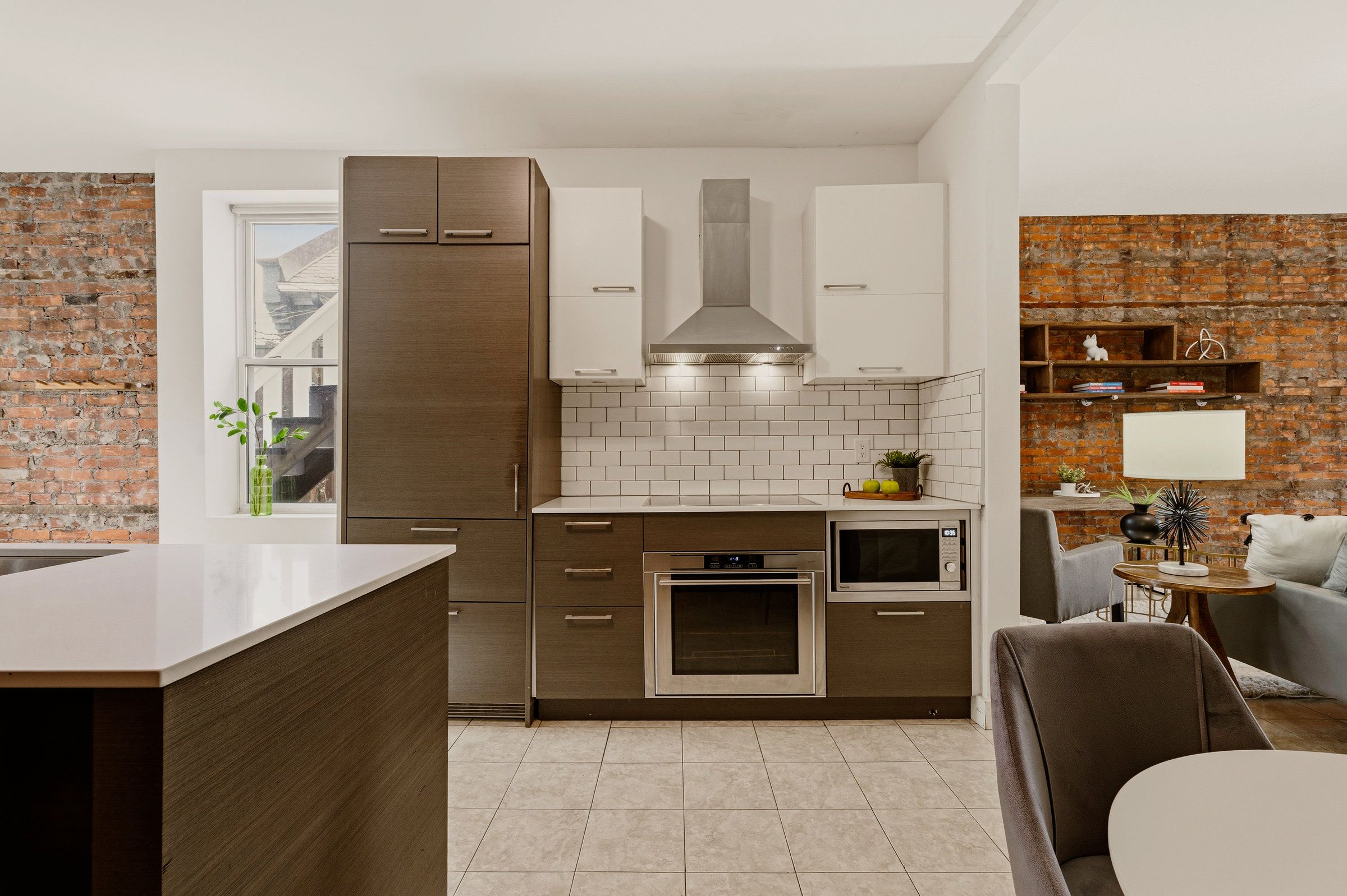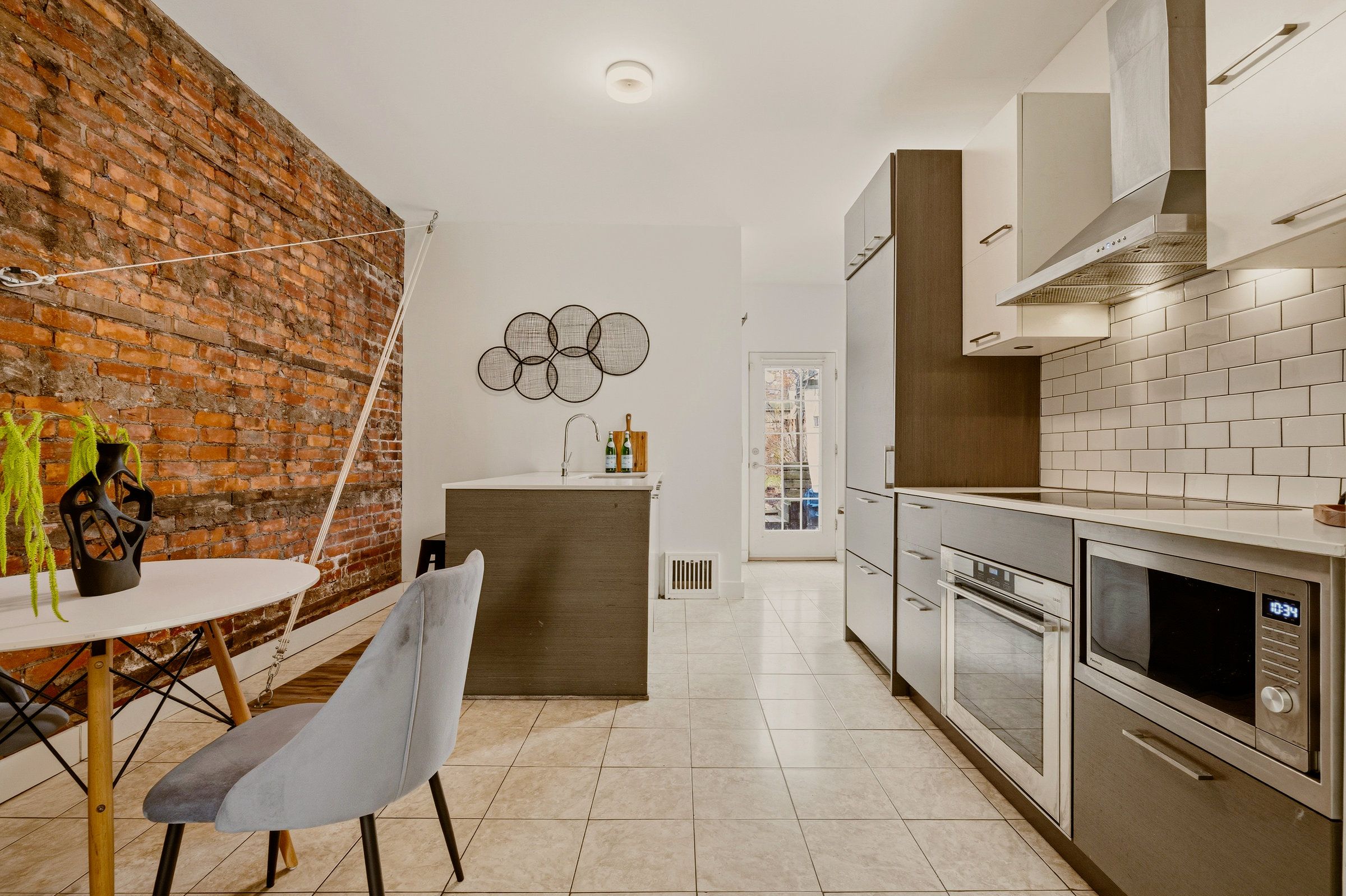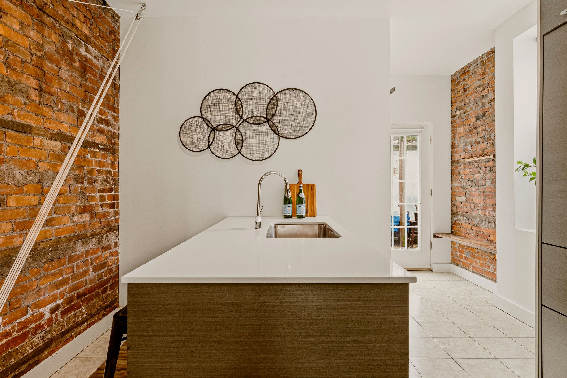 • Main floor features high ceilings, exposed brick, and a modern kitchen.