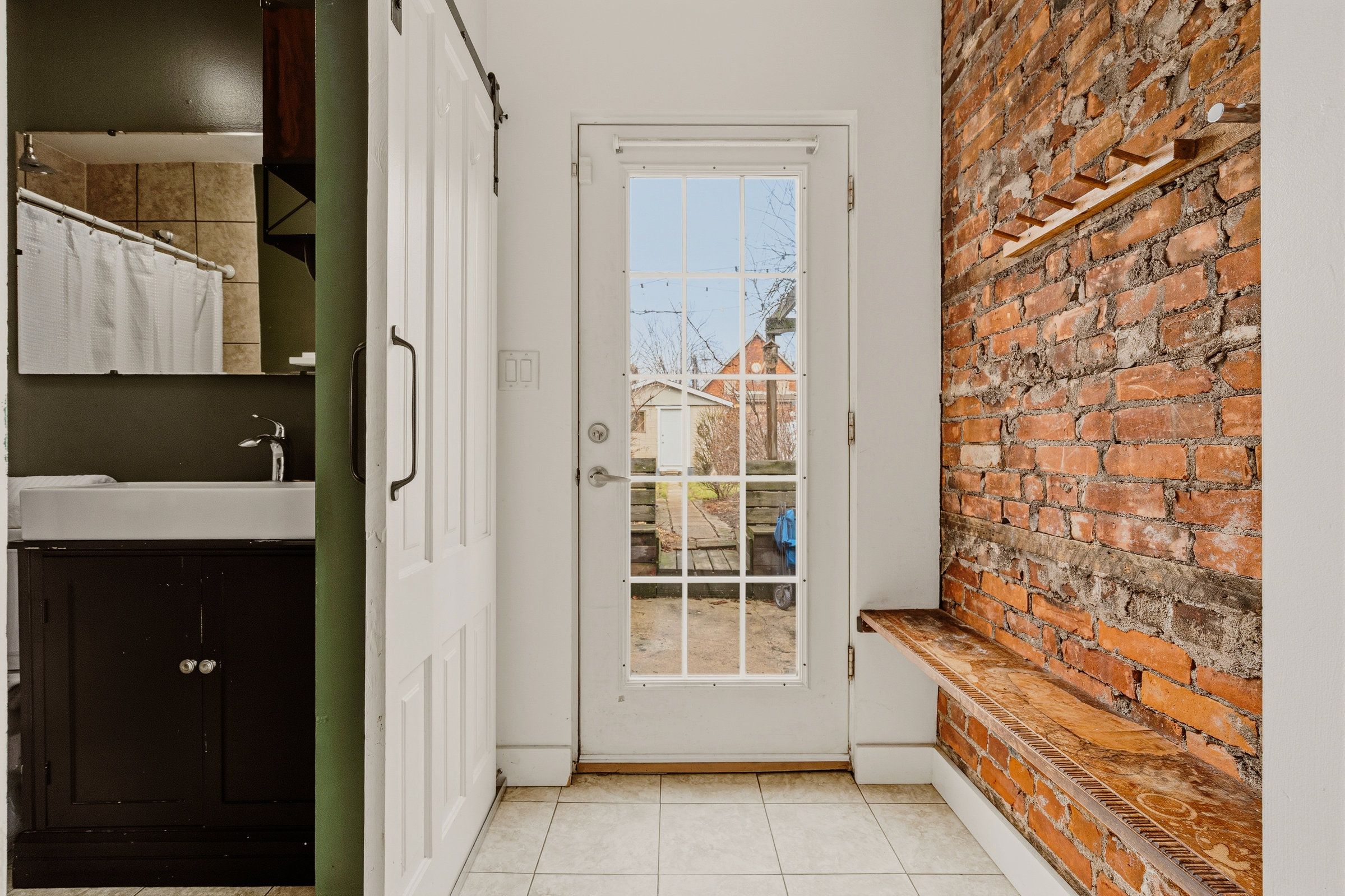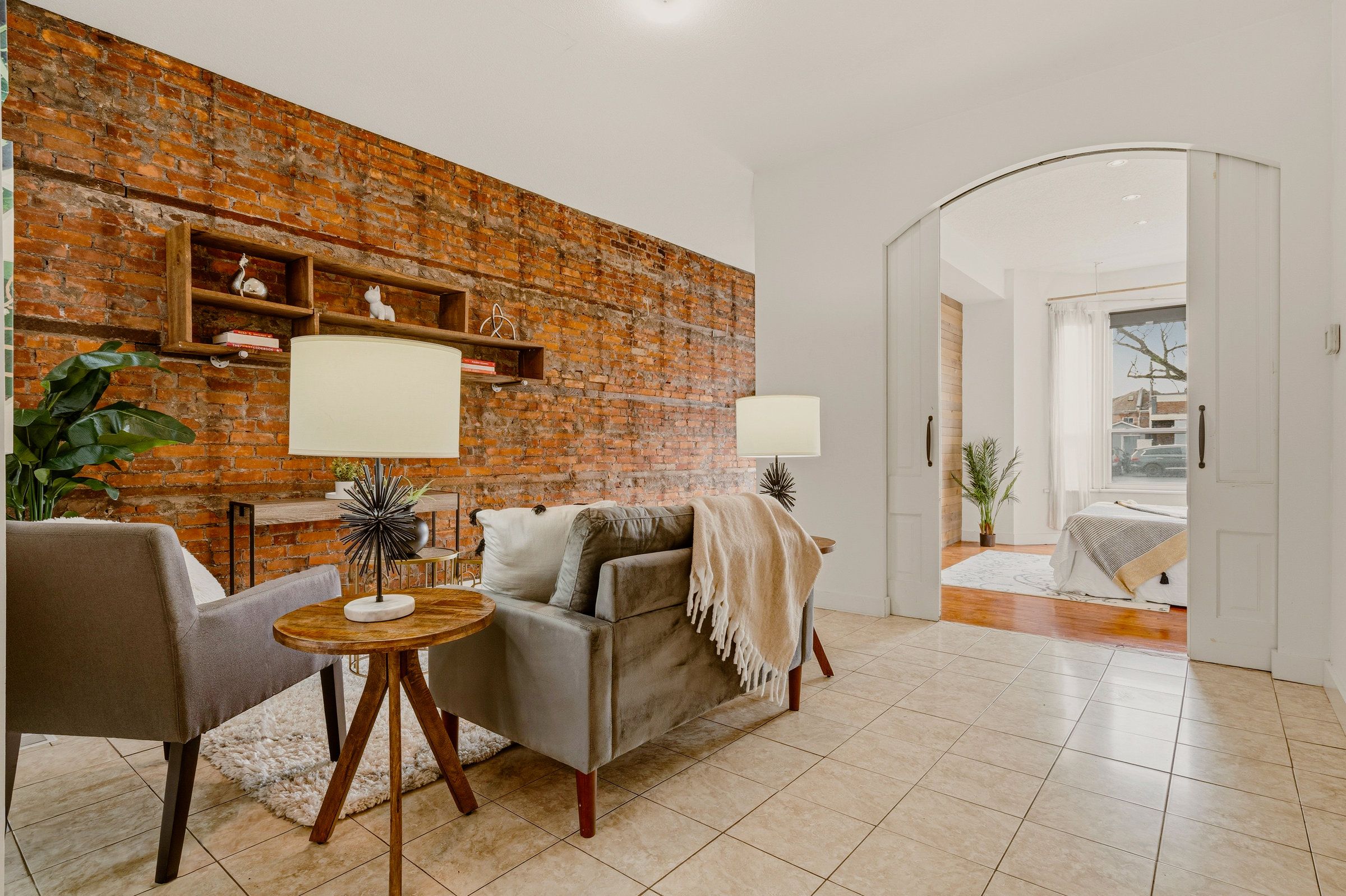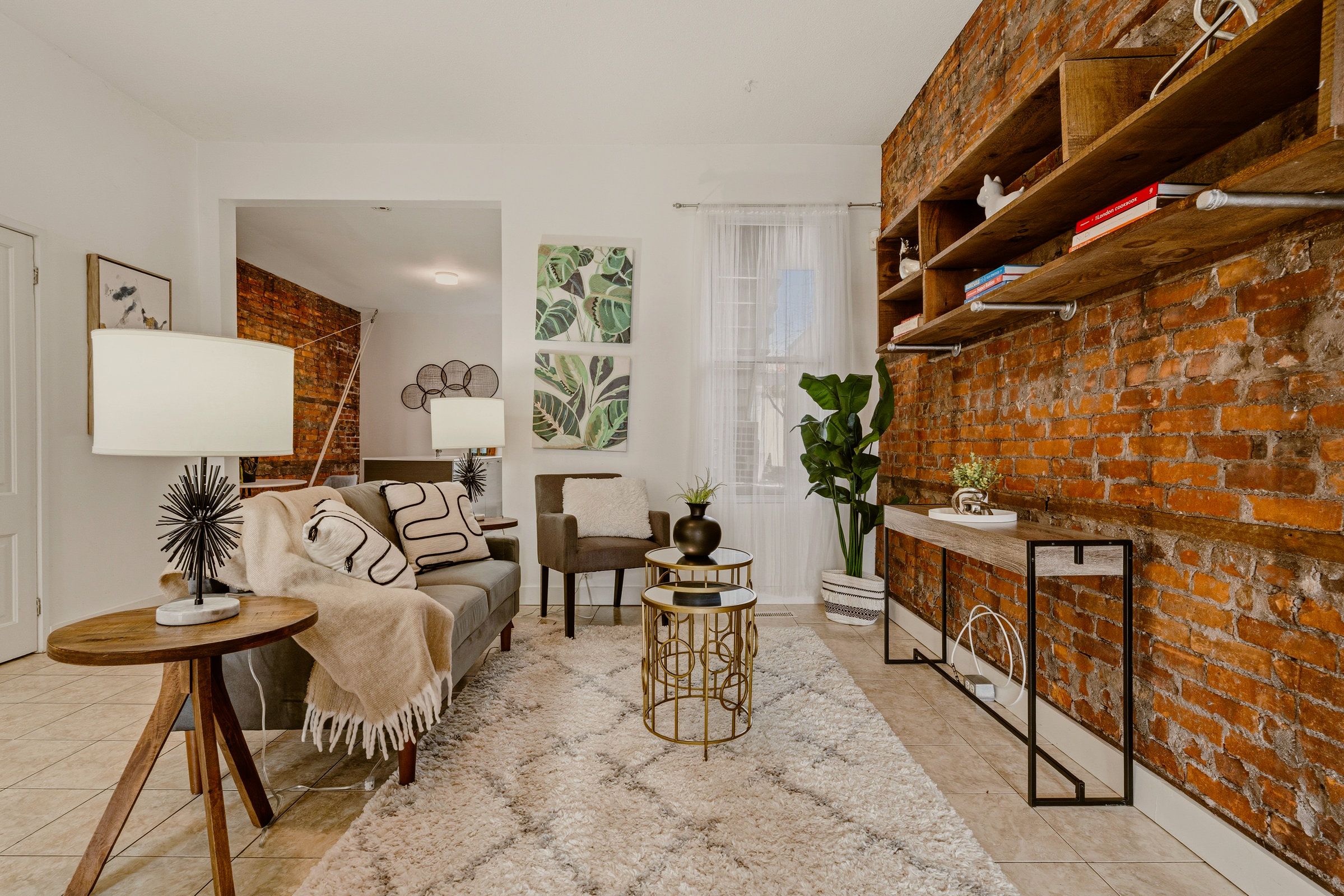 • Main floor features high ceilings, exposed brick, and a modern kitchen.