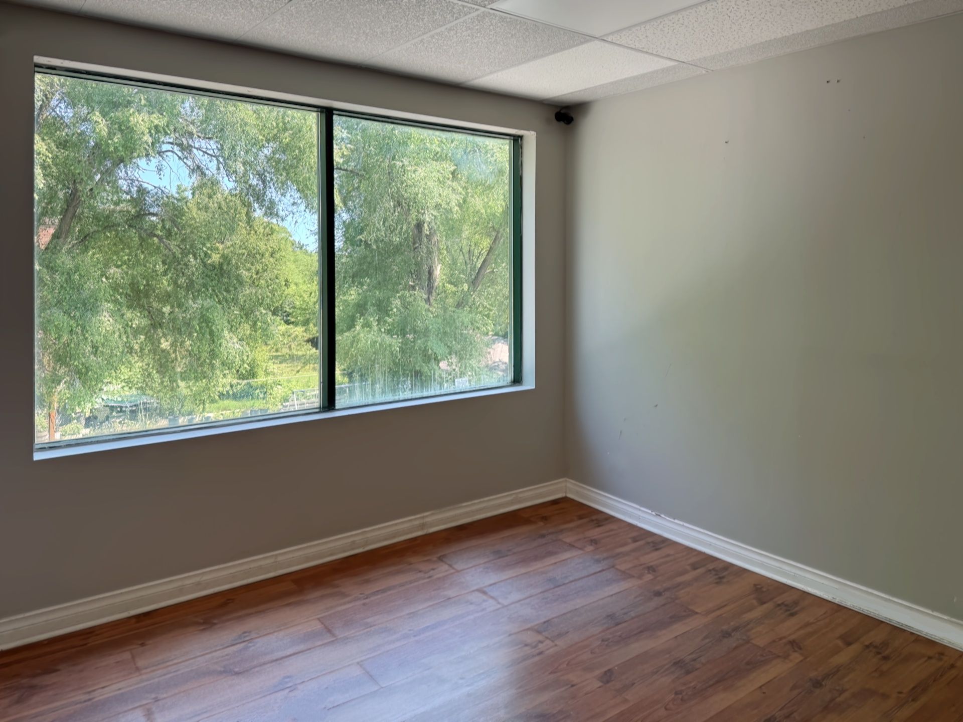 • Spacious second-floor unit with large windows and flexible partitioned layout.