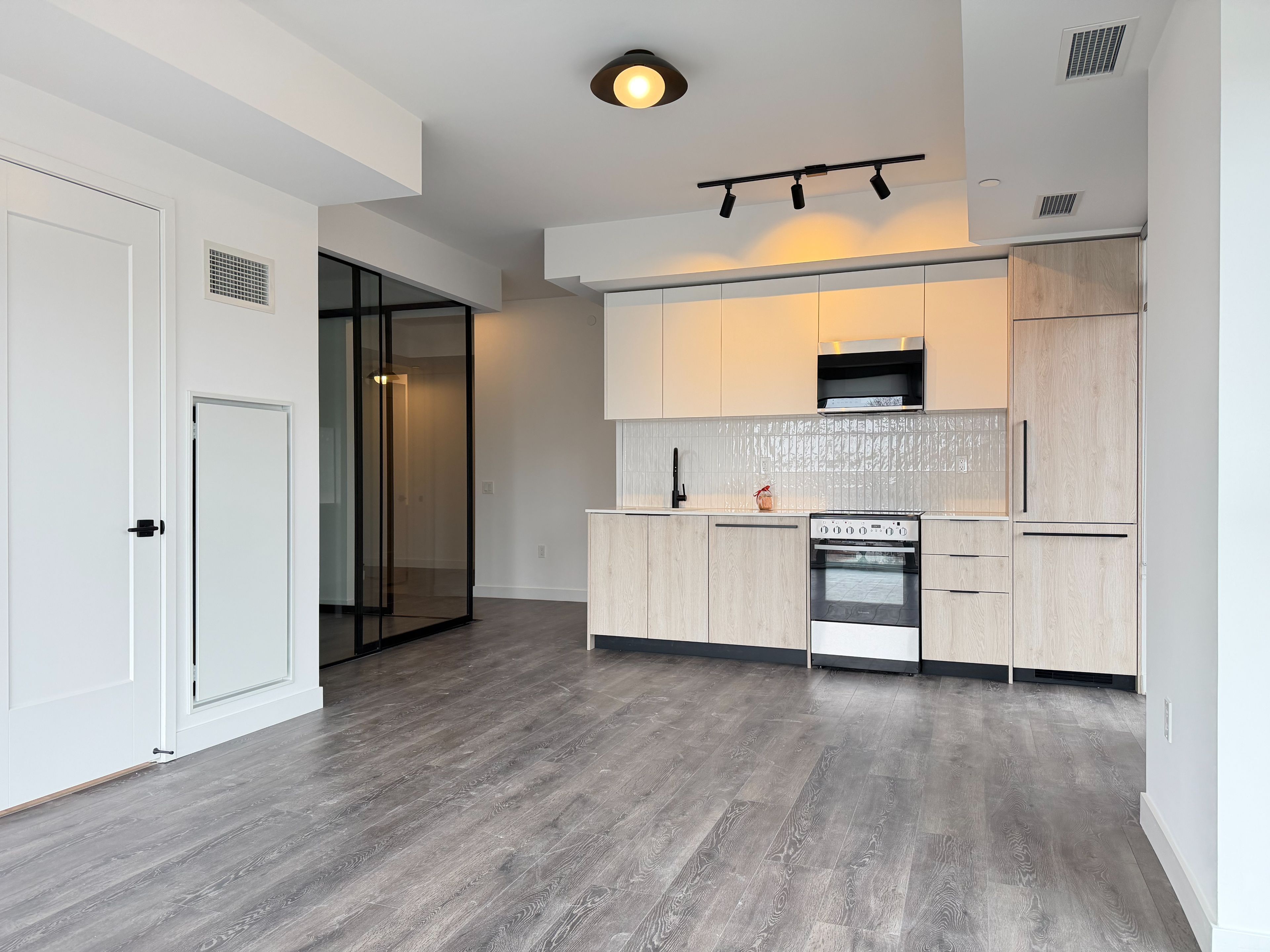 • Open-concept kitchen and living area with access to a private balcony.